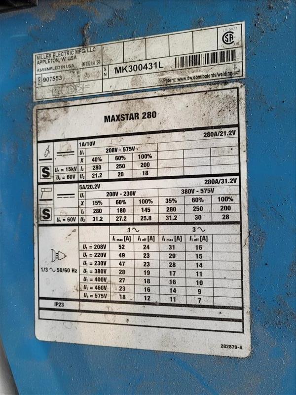 Miller model no. MAXSTAR280 TIG Welder 208-575 v, 280 AMPS, serial no. MK300431L (Please Note: Tank Not Included)