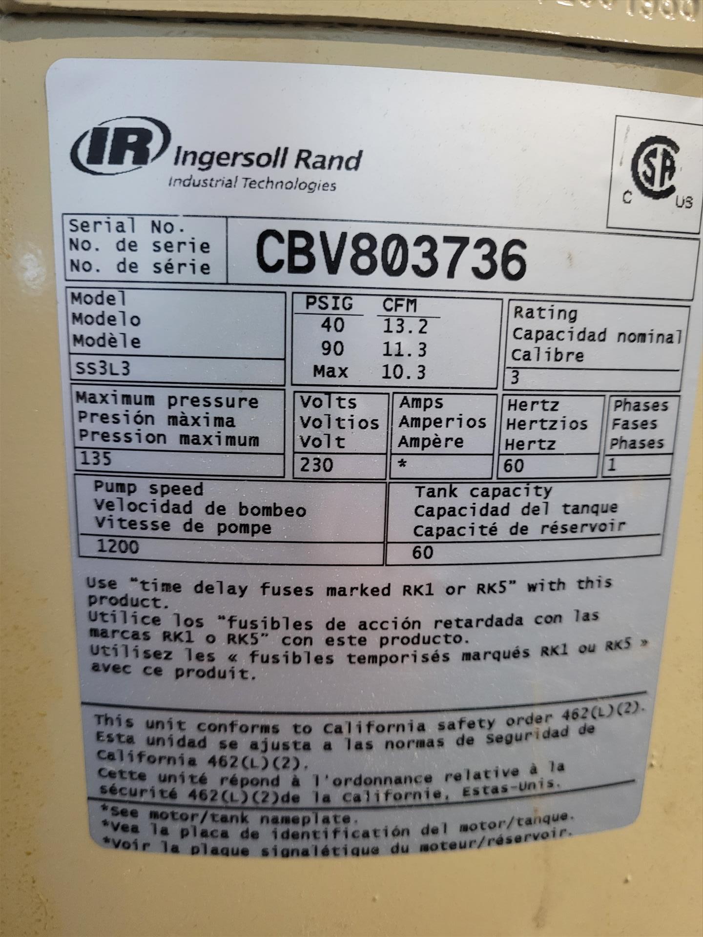 Ingersoll Rand mod. SS3L3 48 HP Electric Air Compressor 230 v, 135 PSI, 60 Hz, ser. no. CBV83736