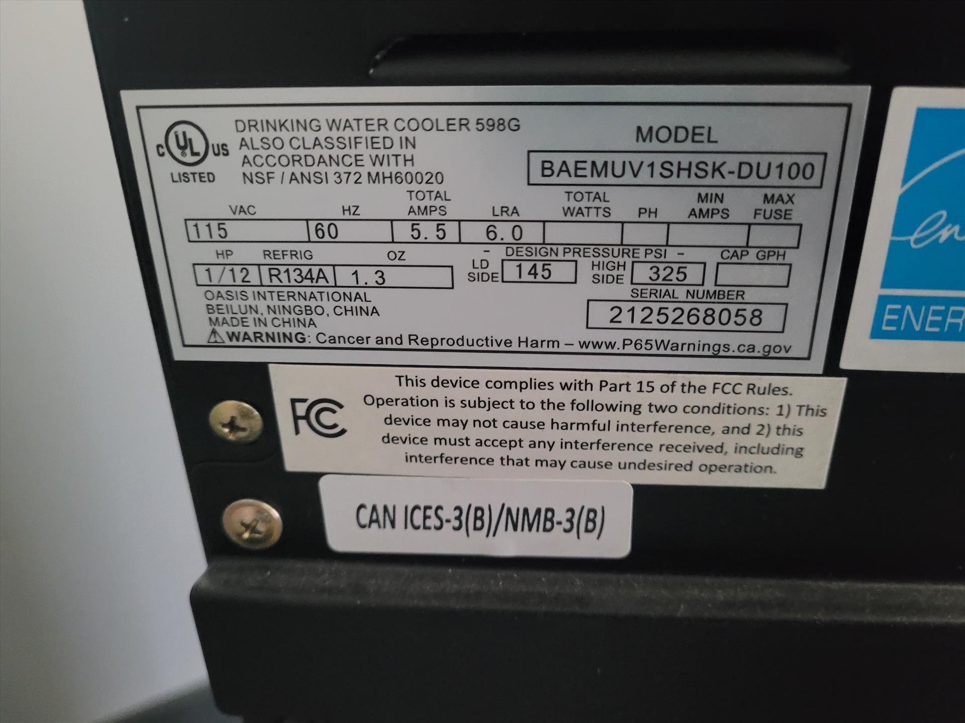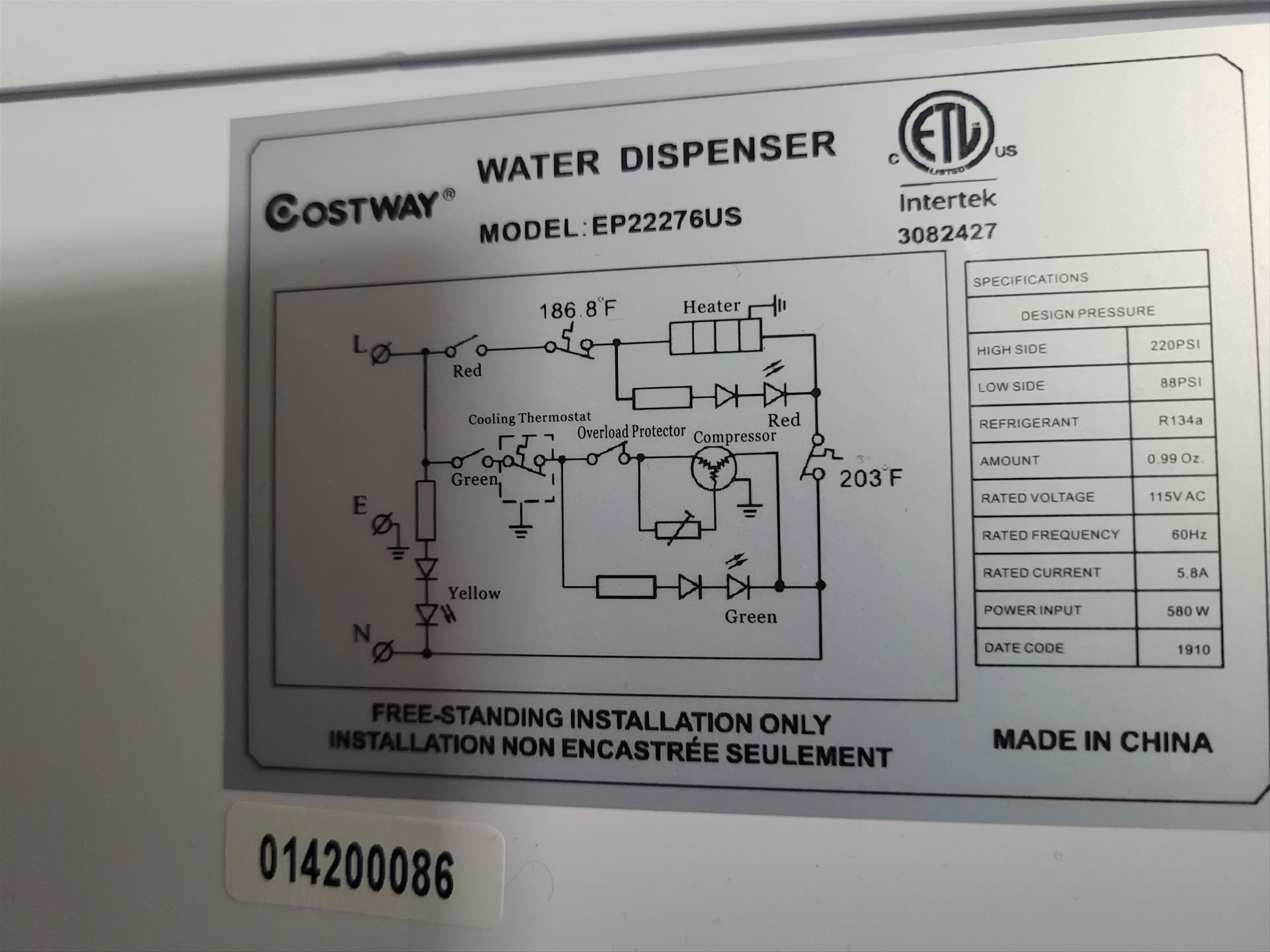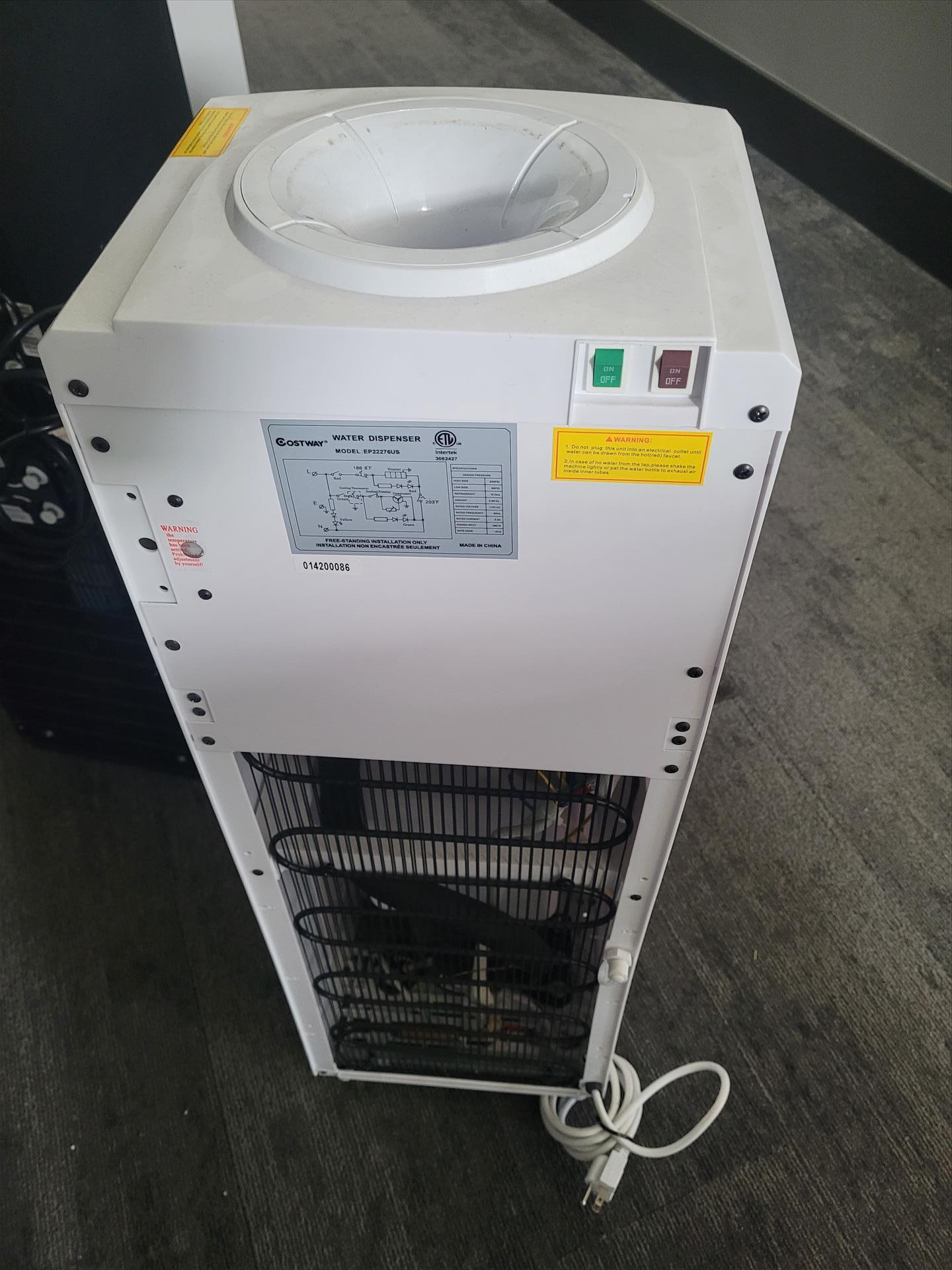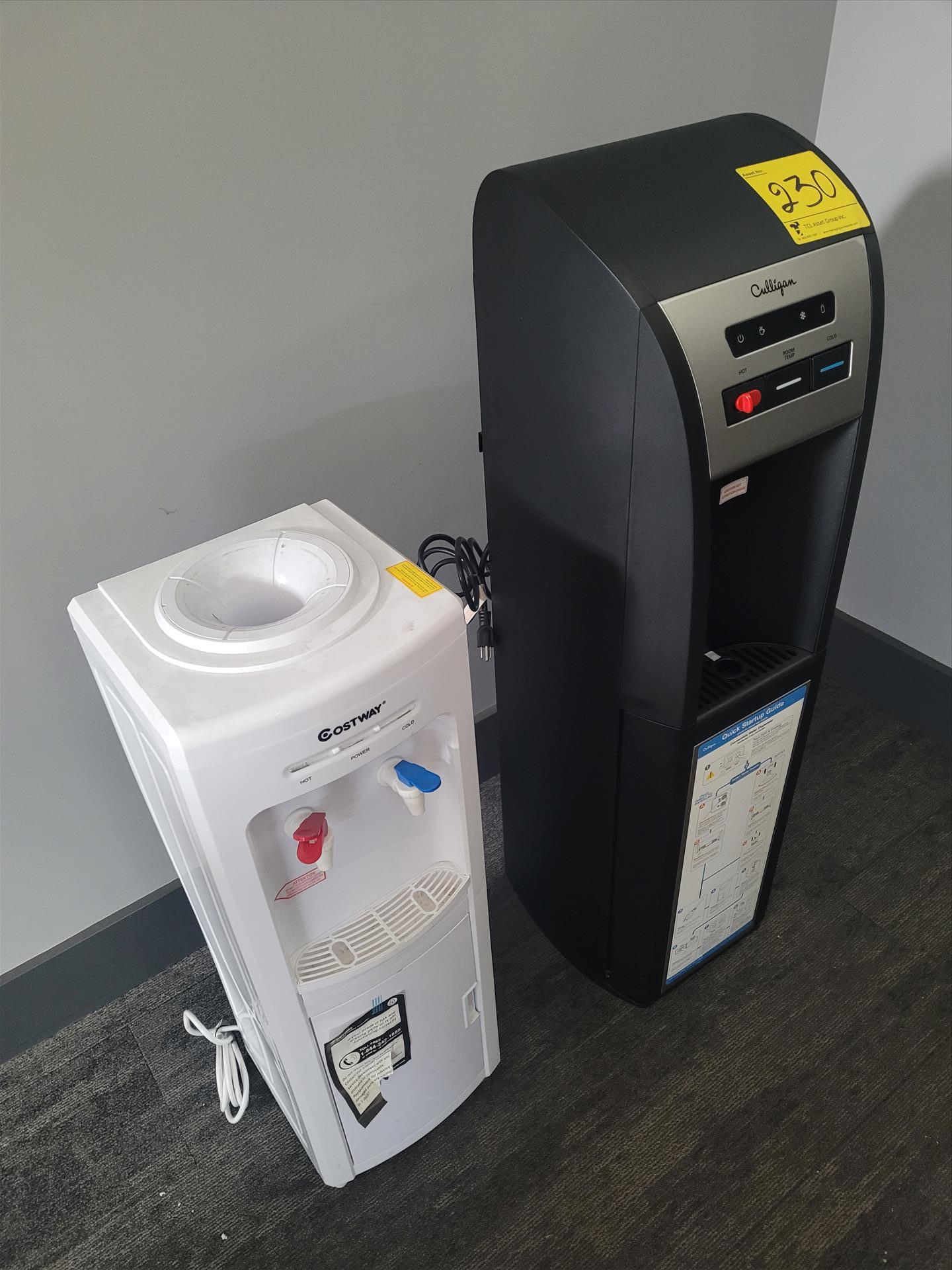 Lot (2) Water Dispensers Consisting of: (1) Costway mod. EP22276US Water Dispenser 115 v, 220 PSI, 5.8 AMPS, Refrigerant Type: R134a, and (1) Culligan mod. BAEMUV1SHSK-DU100 Water Dispenser 115 v, 325 PSI, 5.5 AMPS, Refrigerant Type: R134a, ser. no. 2125268058