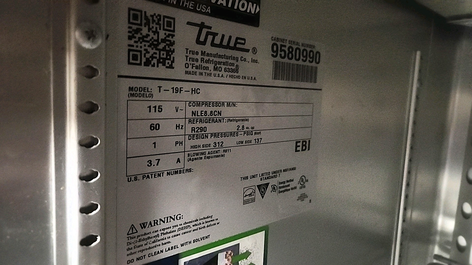 True freezer, mod.T-19F-HC, ser. no. 9580990, stainless steel