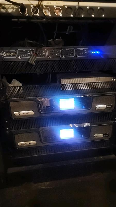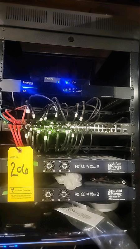 server rack c/w (2) Crown Cdi Drive Vector 4/300 audio power amplifiers, (6) Rogers Next Box modems, (2) Just Add PWR HD over IP 2G Plus rack mounted transmitters, (1) Luxal XMS-5248P manage switch console, (1) Araknis AN-210-SW-R-8-PoE websmart network switch