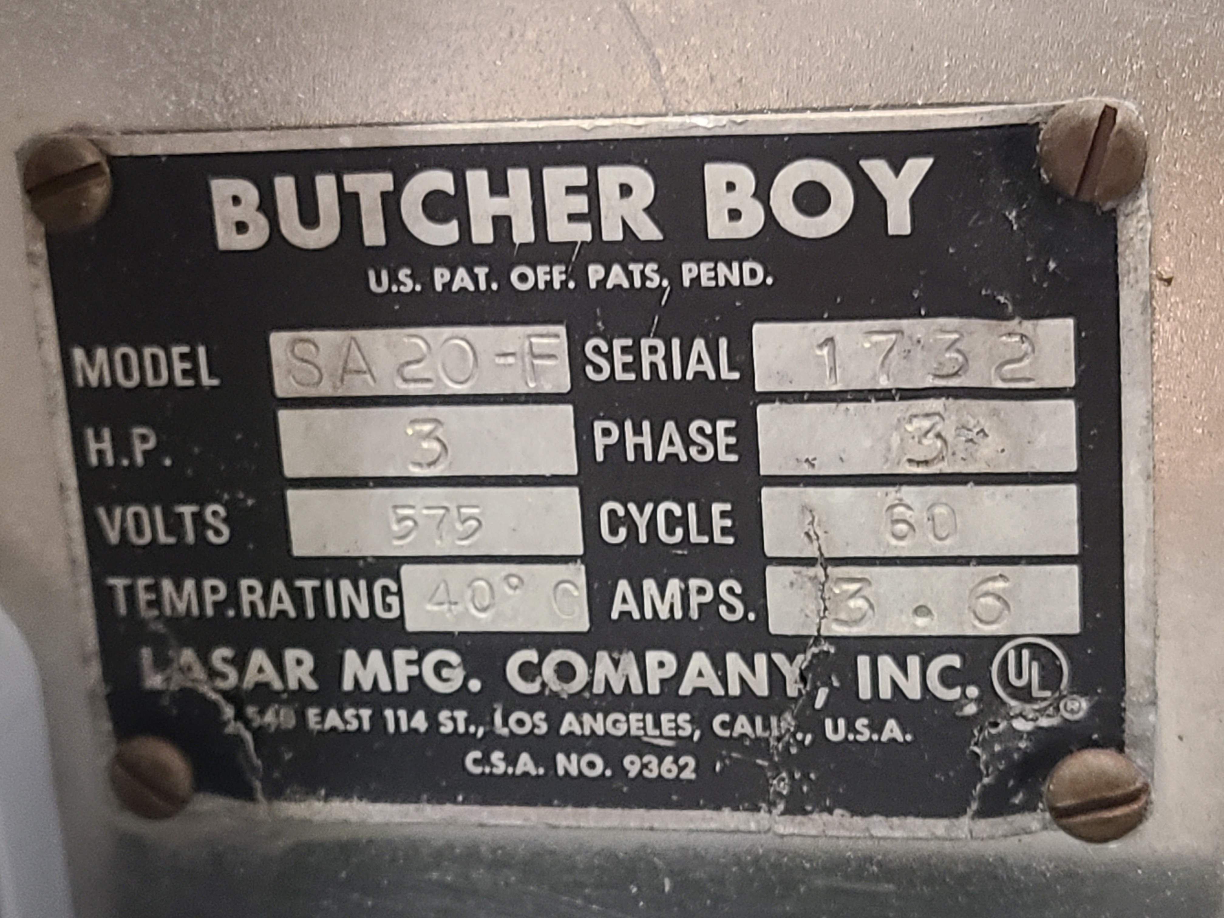 Butcher Boy Meat Band Saw, model SA 20-F, S/N 1732, 3 hp, 575 volts, 3.6 A, 3 phase [Loc. Behind Packaging]