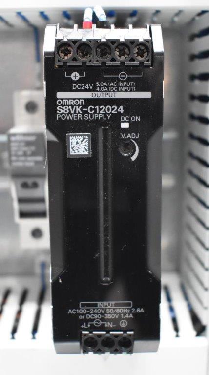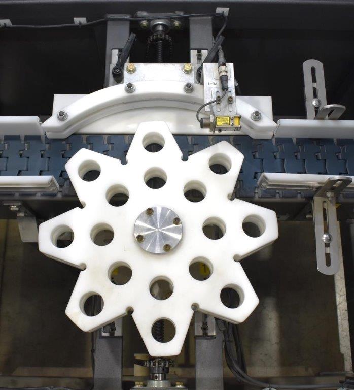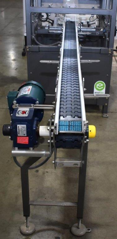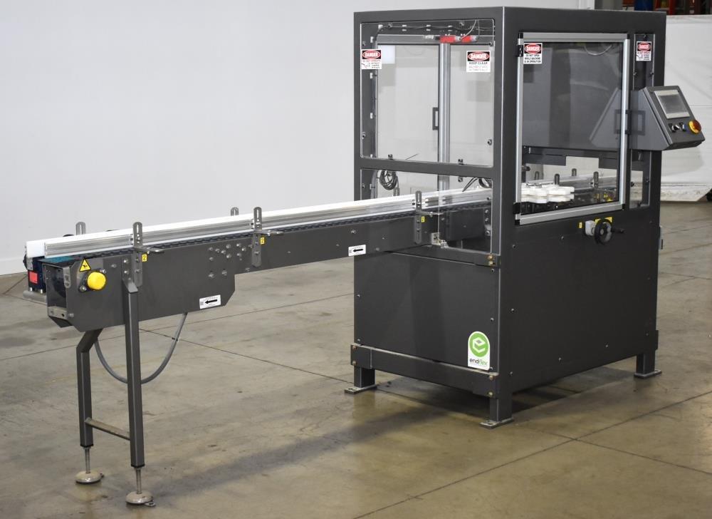 Endflex Table Top Single Lane Powered Indexing Conveyor 100\" L . ser. no. P110091 024. Originally designed to run cannabis jars under Primo Combi Combination Jar filling scale. The conveyor has a signal to filler to dispense product. Unused [Located in Chicago, Illinois]