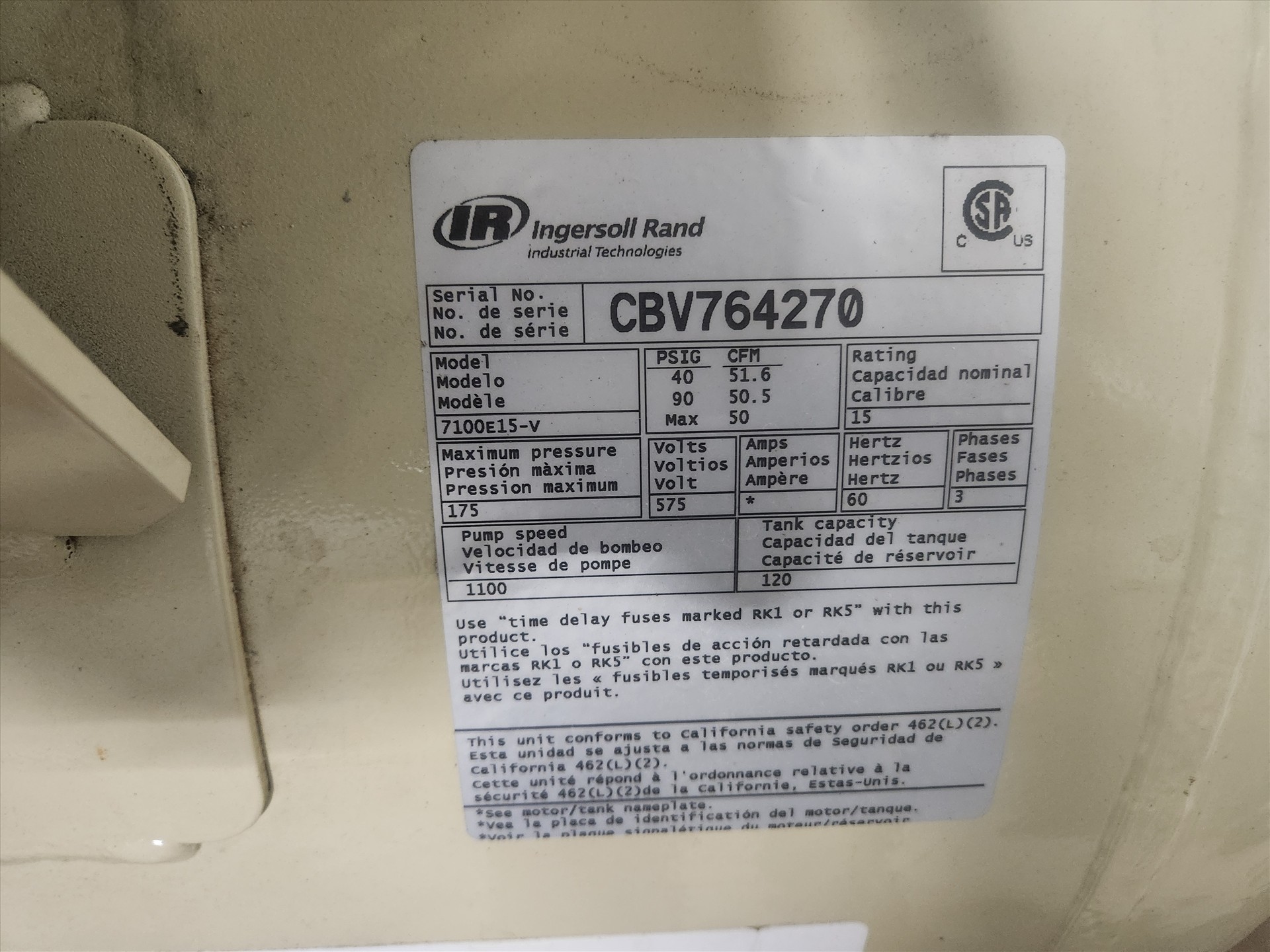 Ingersoll-Rand air compressor, mod. 7100E15-V, ser. no. CBV764270, tank-mounted, 15 hp [Loc. Energy Centre]