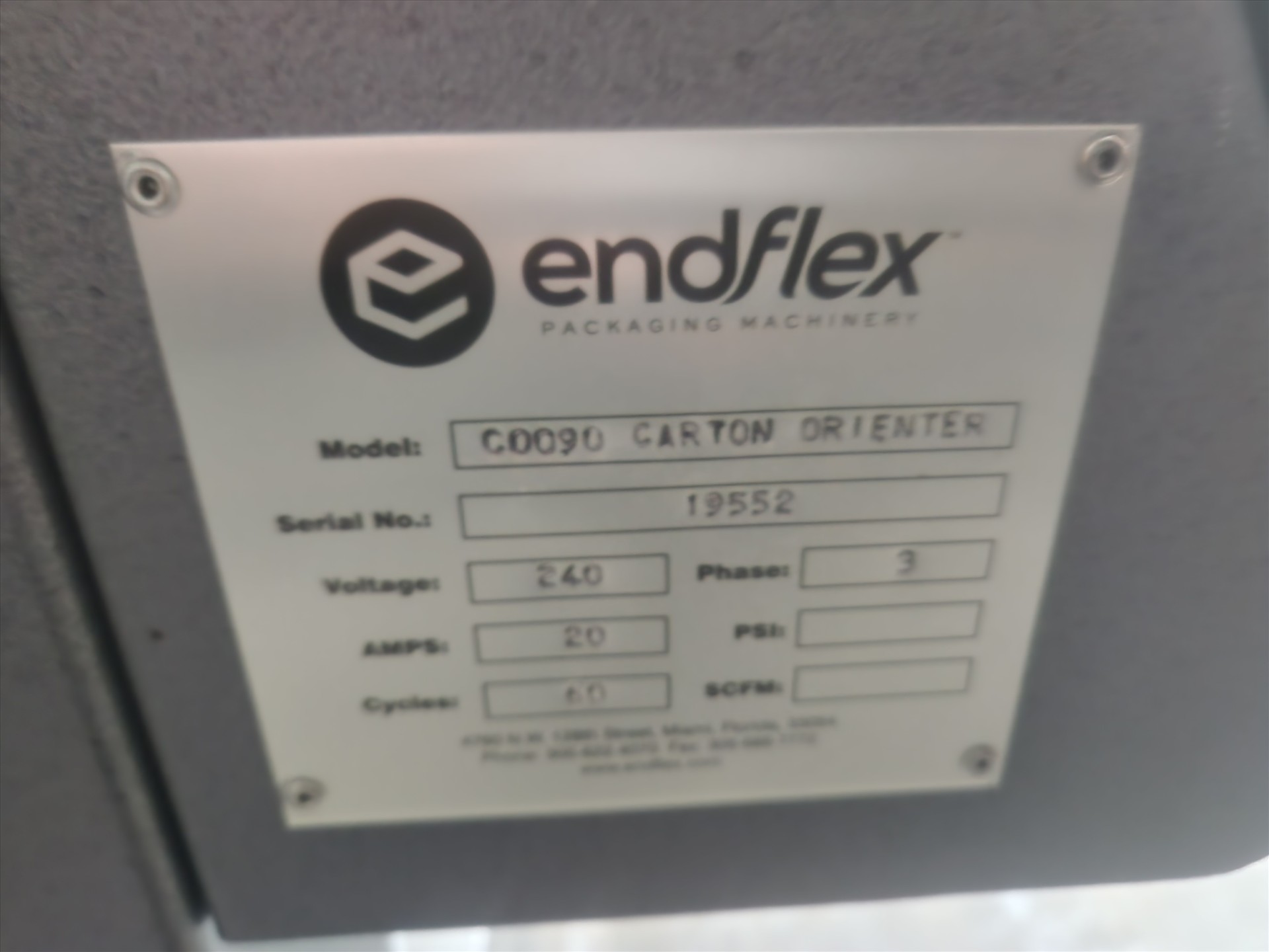 EndFlex carton orienter, mod. C0090, ser. no. 19552 w/ touch-screen controls c/w conveyor, power, 5 in. x 133 in. belt (Subject to confirmation. The winner will be determined based on the sum of bids on lots 39-50E vs on bulk bid lot 38) [Loc. Main Plant]
