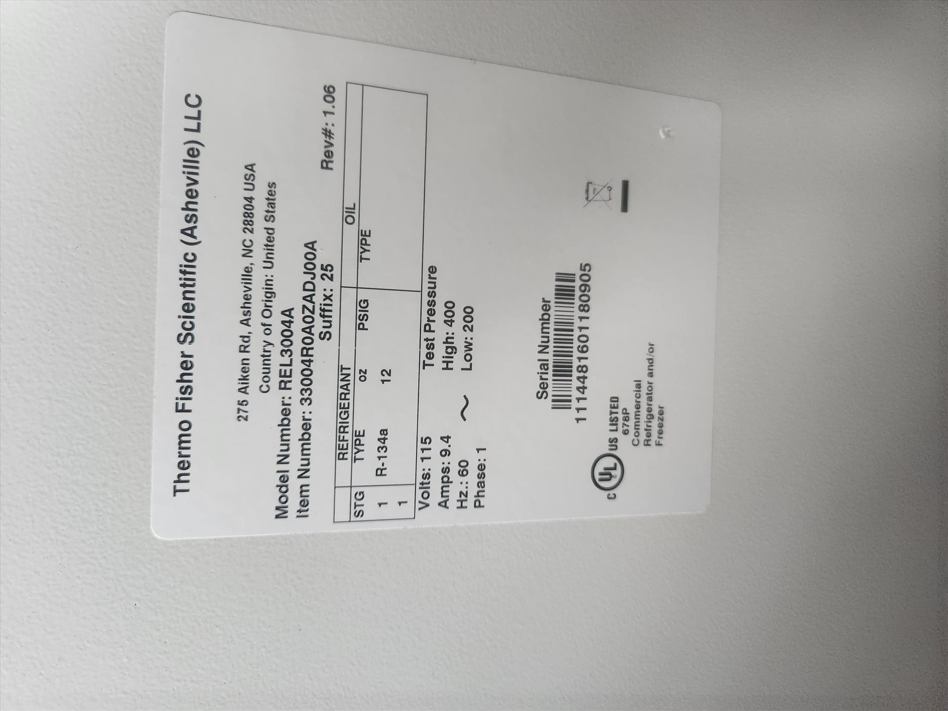 Thermo Sci./Revco lab refrigerator, mod. REL3004A, ser. no. 111481601180904, 20 L cap. [Loc. Barn]