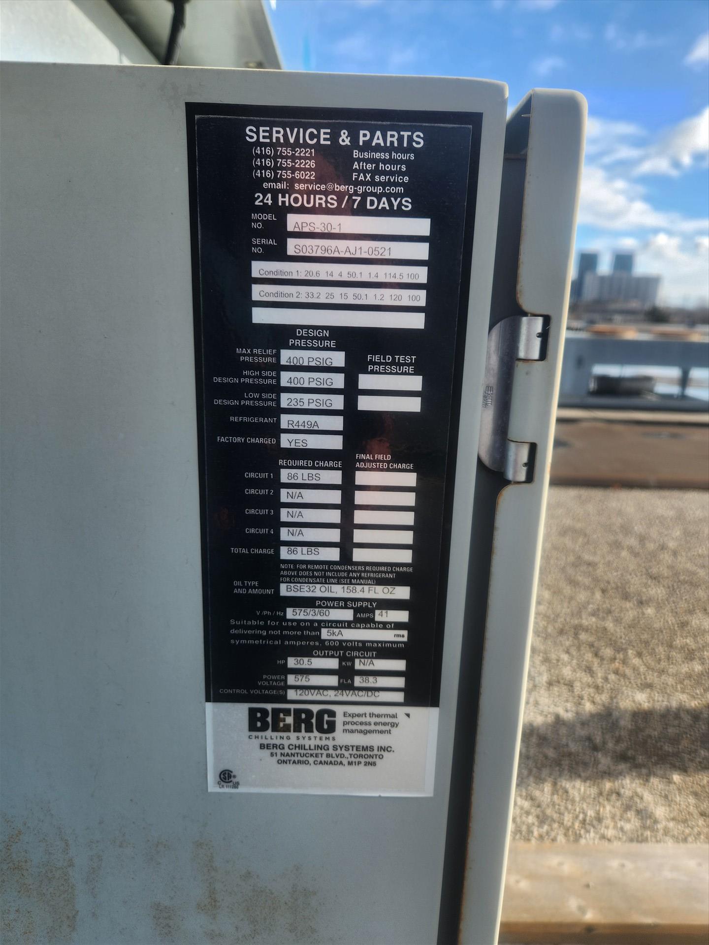 Berg Chiller, mod. APS-30-1, s/n S03796A-AJ1-0521, 157 in. x50 in. x100 in. , 575 volt, SS, 11.7 Tons Glycol (40% propylene glycol) with 50.1 GPM flowrate pump, and Glycol tank with 42 in. diameter and 73 in. height. [Loc. Dough Mixing - Bulk Storage]