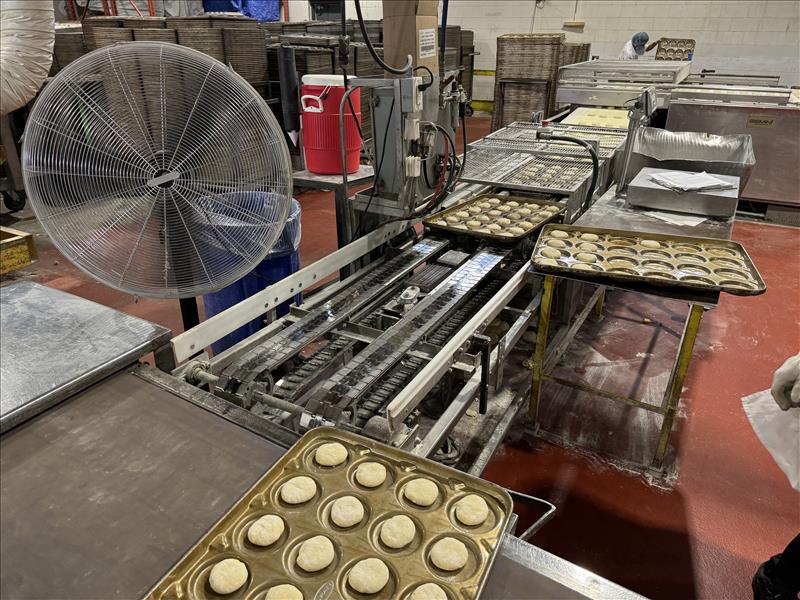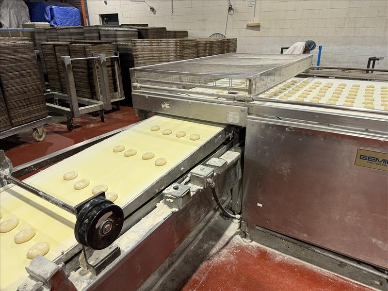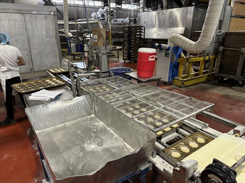 Index Cross Conveyor, 30ft x 34 in. x 31 in. , 230 volts, w/ Burford pan shaker & outfeed conveyor belt [Subject to entirety bid - Lot 109]