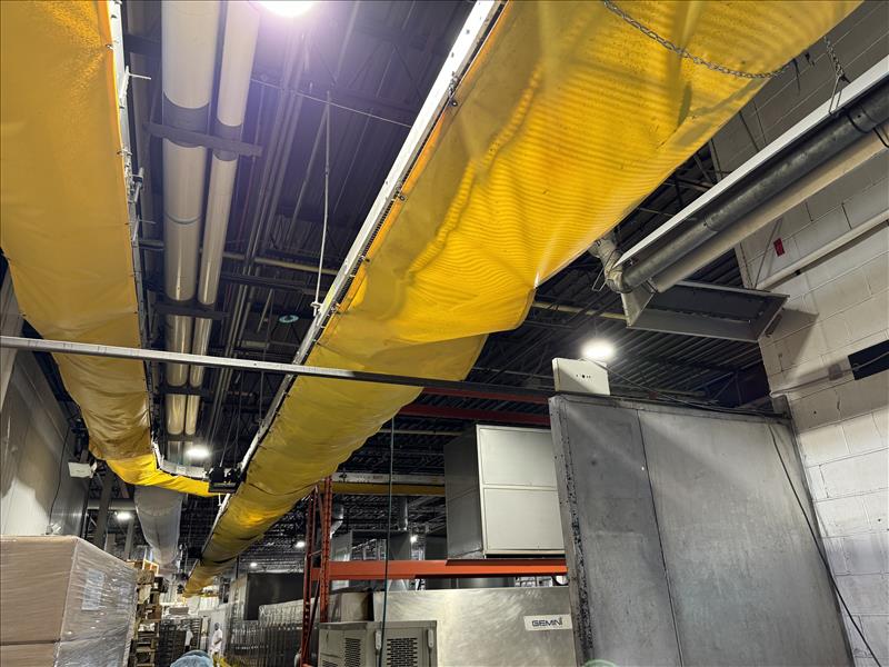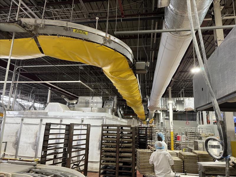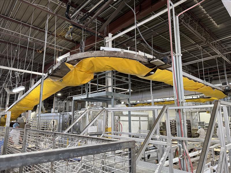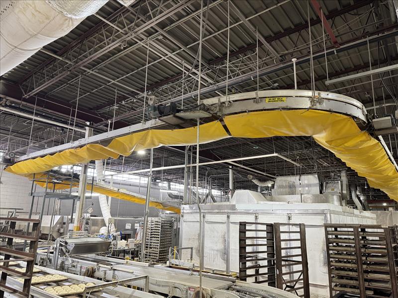 Stewart System Overhead Bun Transfer Converyor, approx. 30 in. wide x 310 ft. Wendway(rod) conveyor, 460 V, SS, w/ (2) 90 degree and (1) 180 degree turn to race-track cooler infeed [Bun Conveyor System]
