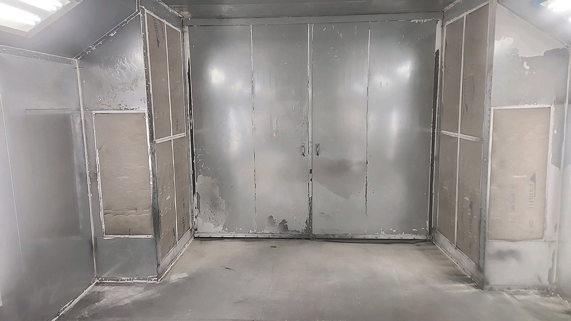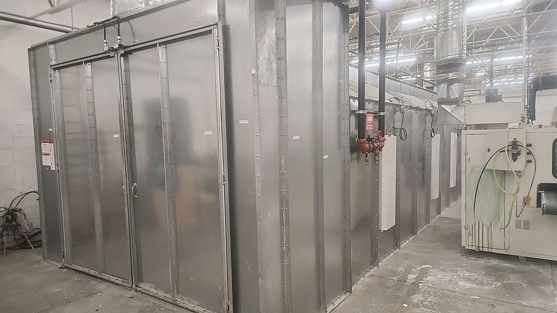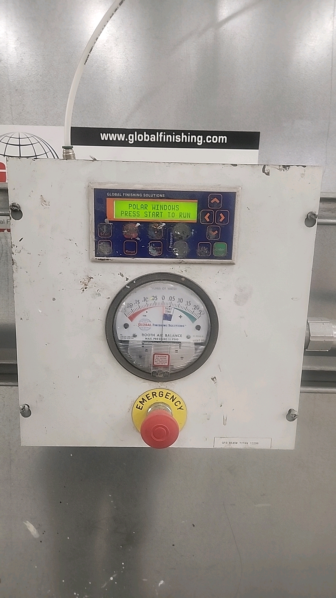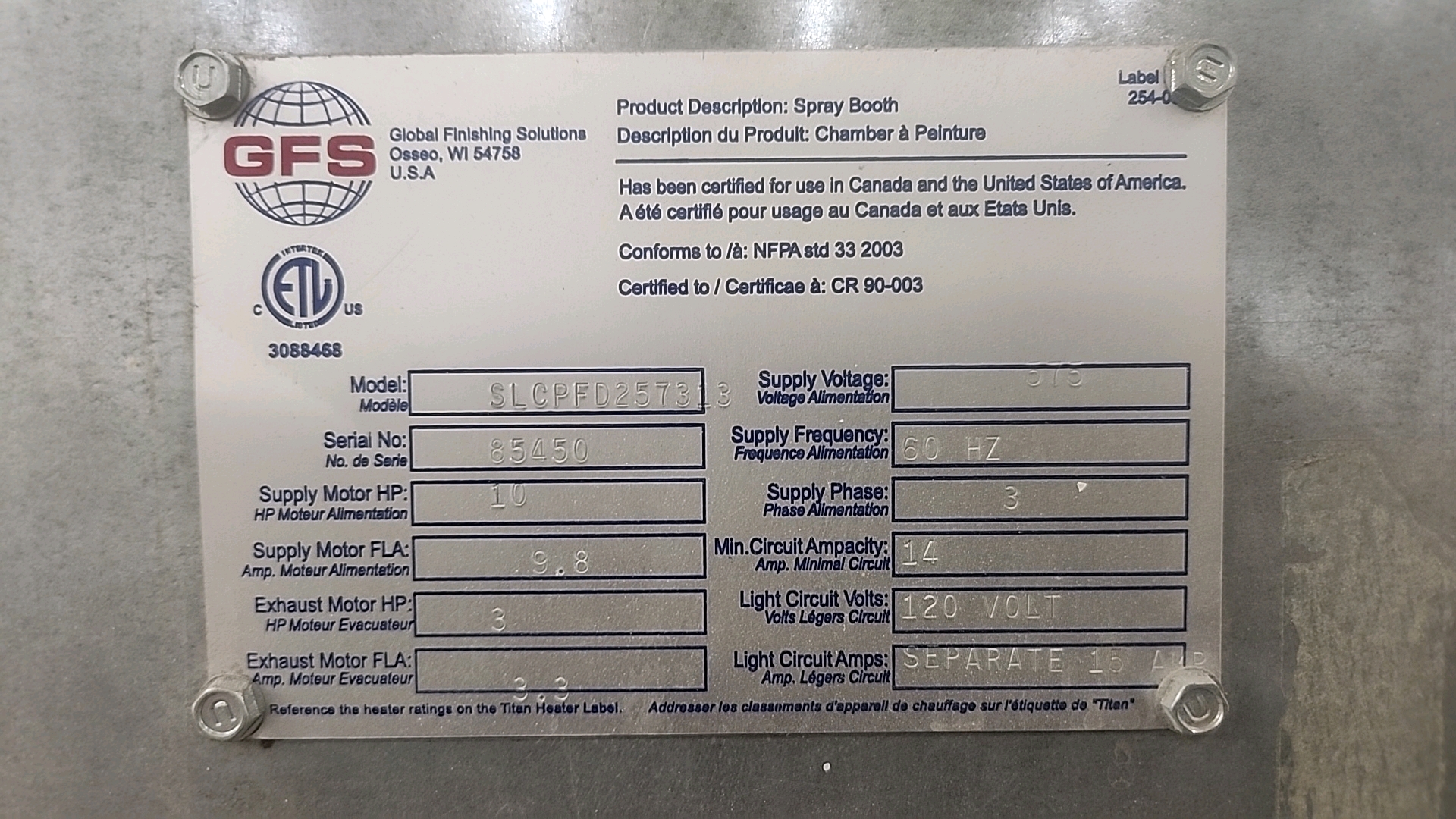 GFS Global Finishing Solutions cross draft spray booth, mod. SLCPFD257313, ser. no. 85450, approx. 15’ x 50’, double folding door access way on both sides, w/ Titan Air direct fired air heater air, mod. TAP-120NG VLH Hot, natural gas, 1,524,600 BTU