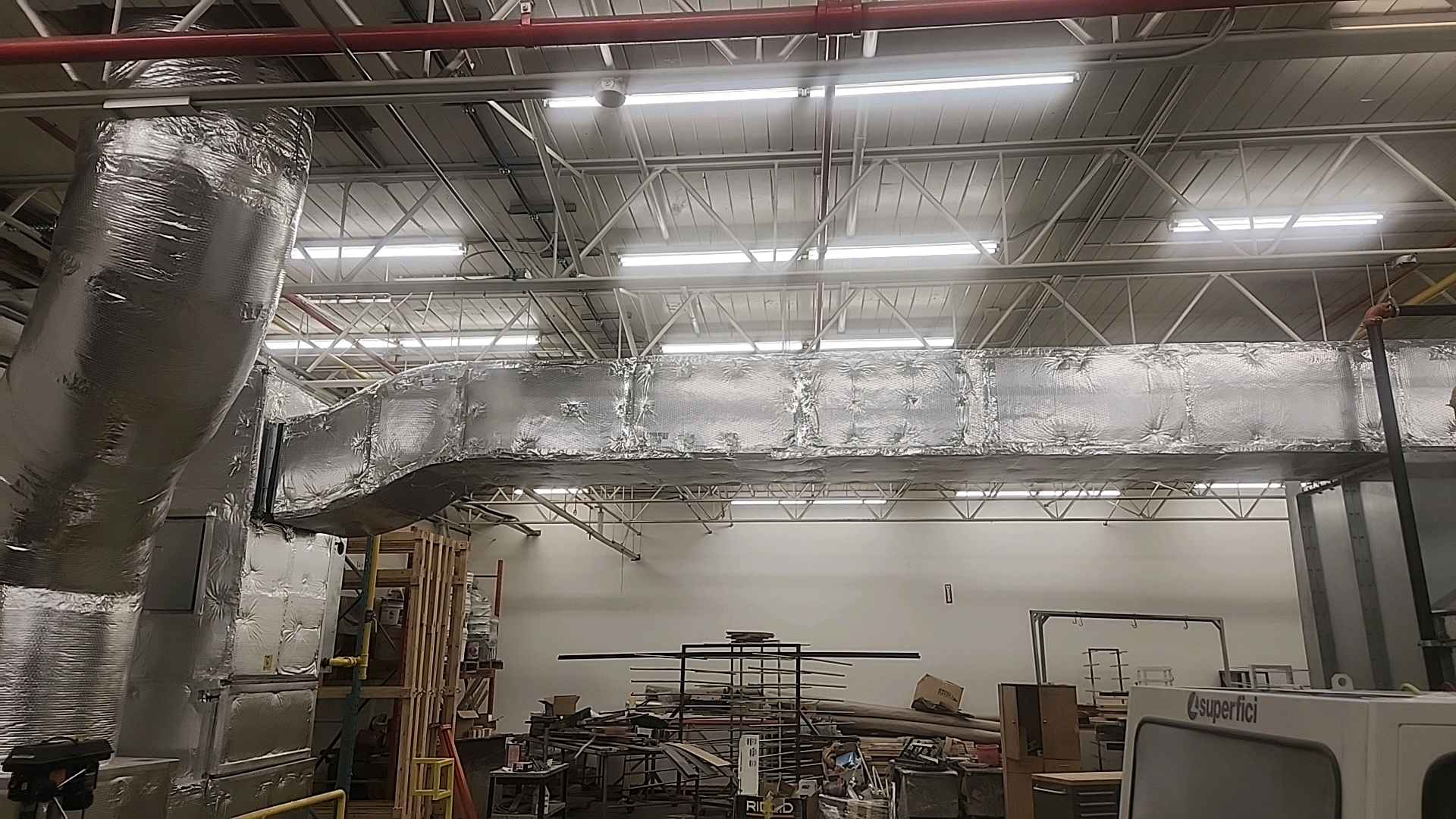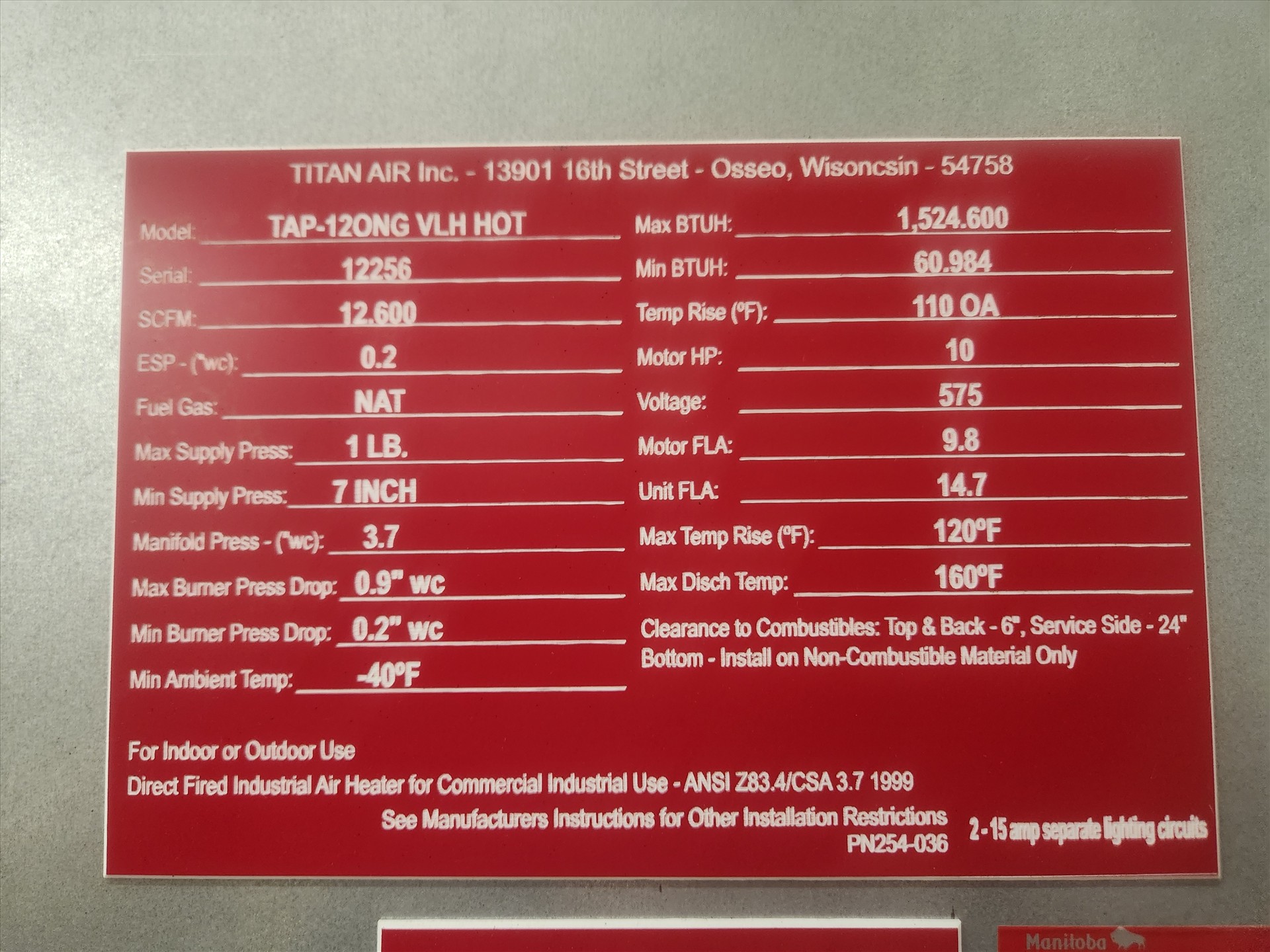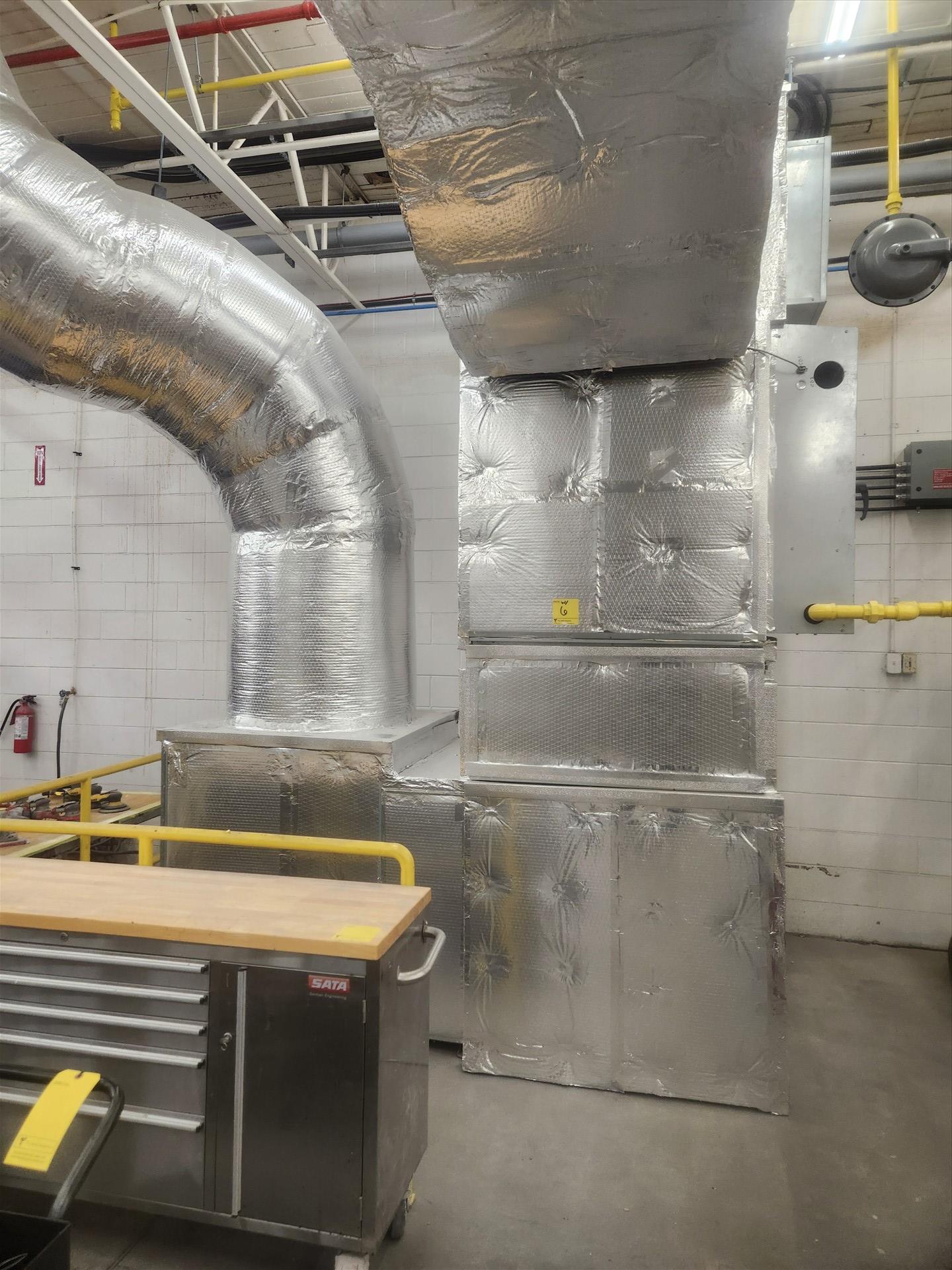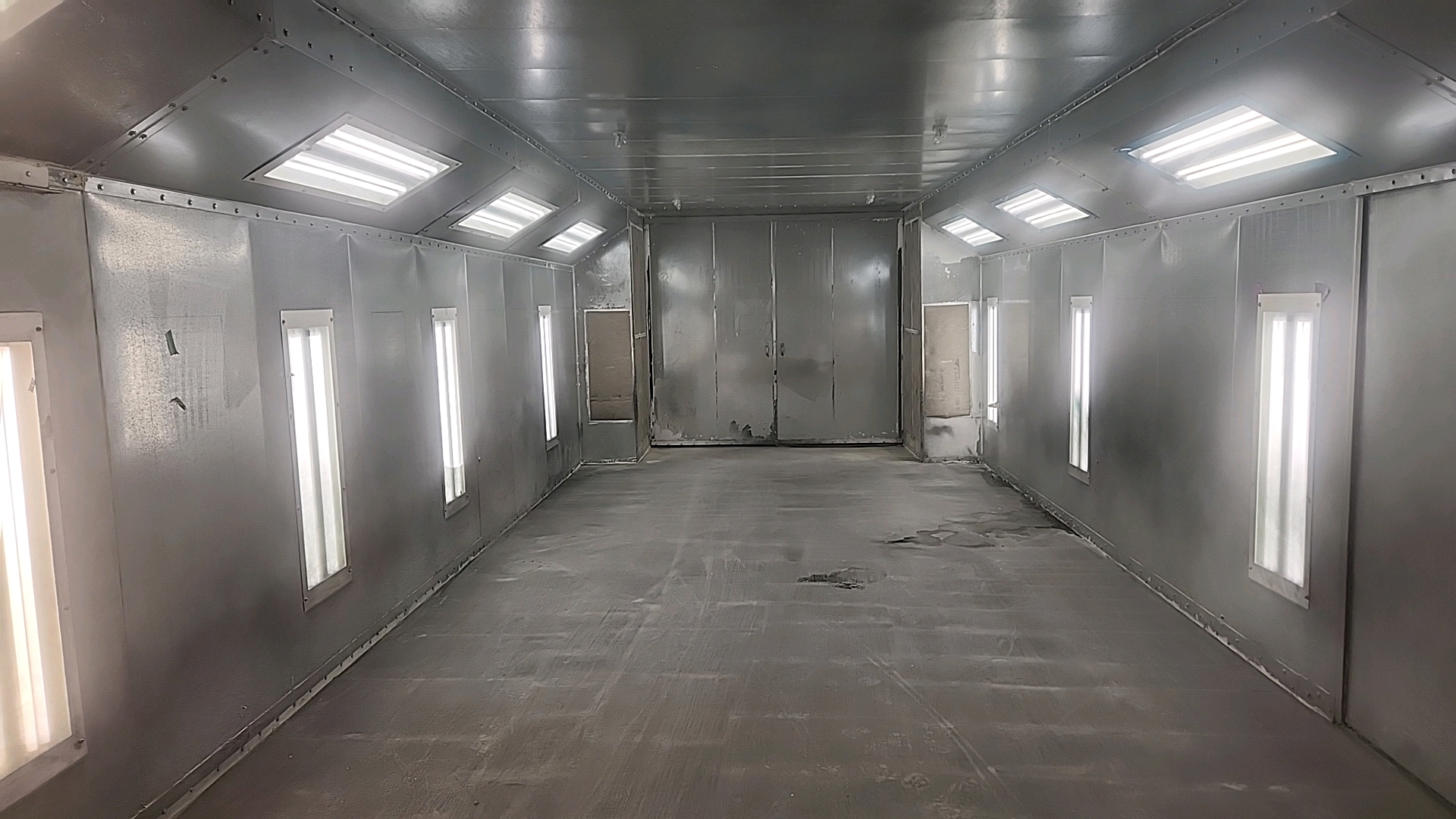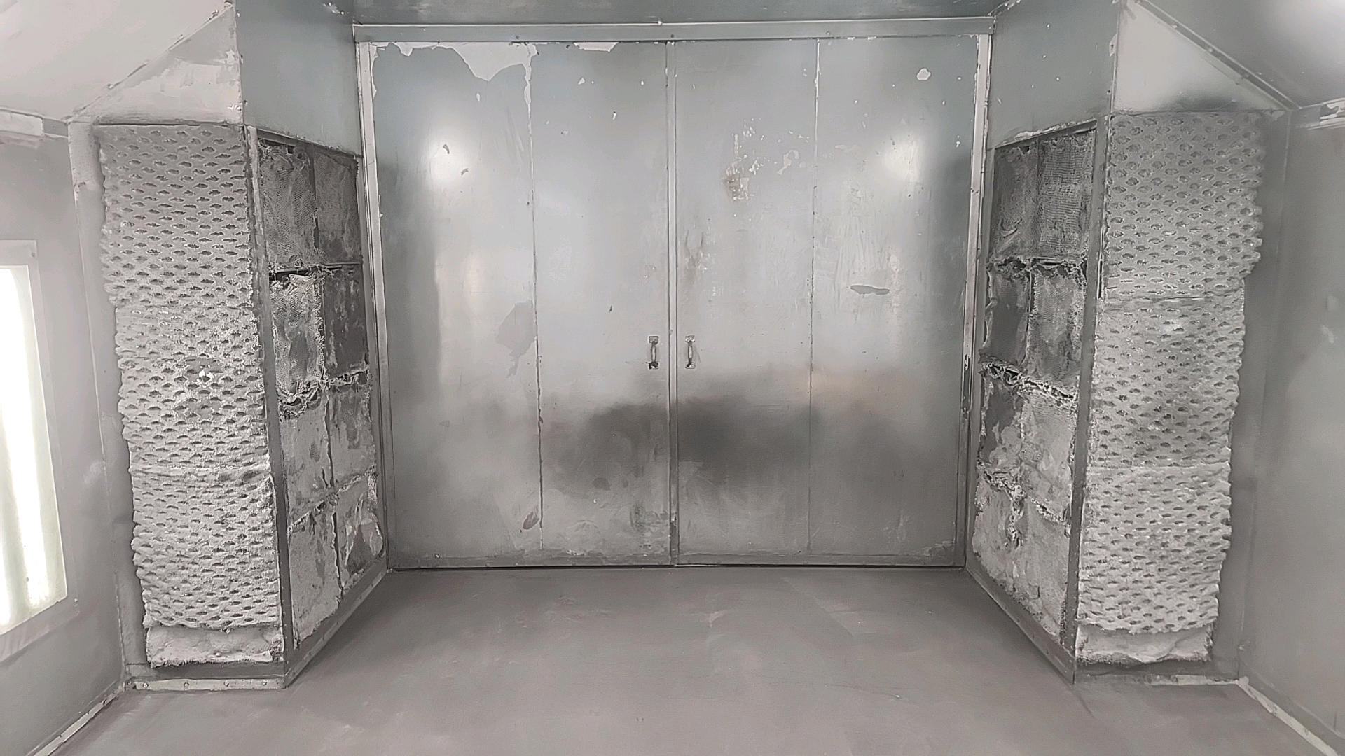 GFS Global Finishing Solutions cross draft spray booth, mod. SLCPFD257313, ser. no. 85450, approx. 15’ x 50’, double folding door access way on both sides, w/ Titan Air direct fired air heater air, mod. TAP-120NG VLH Hot, natural gas, 1,524,600 BTU