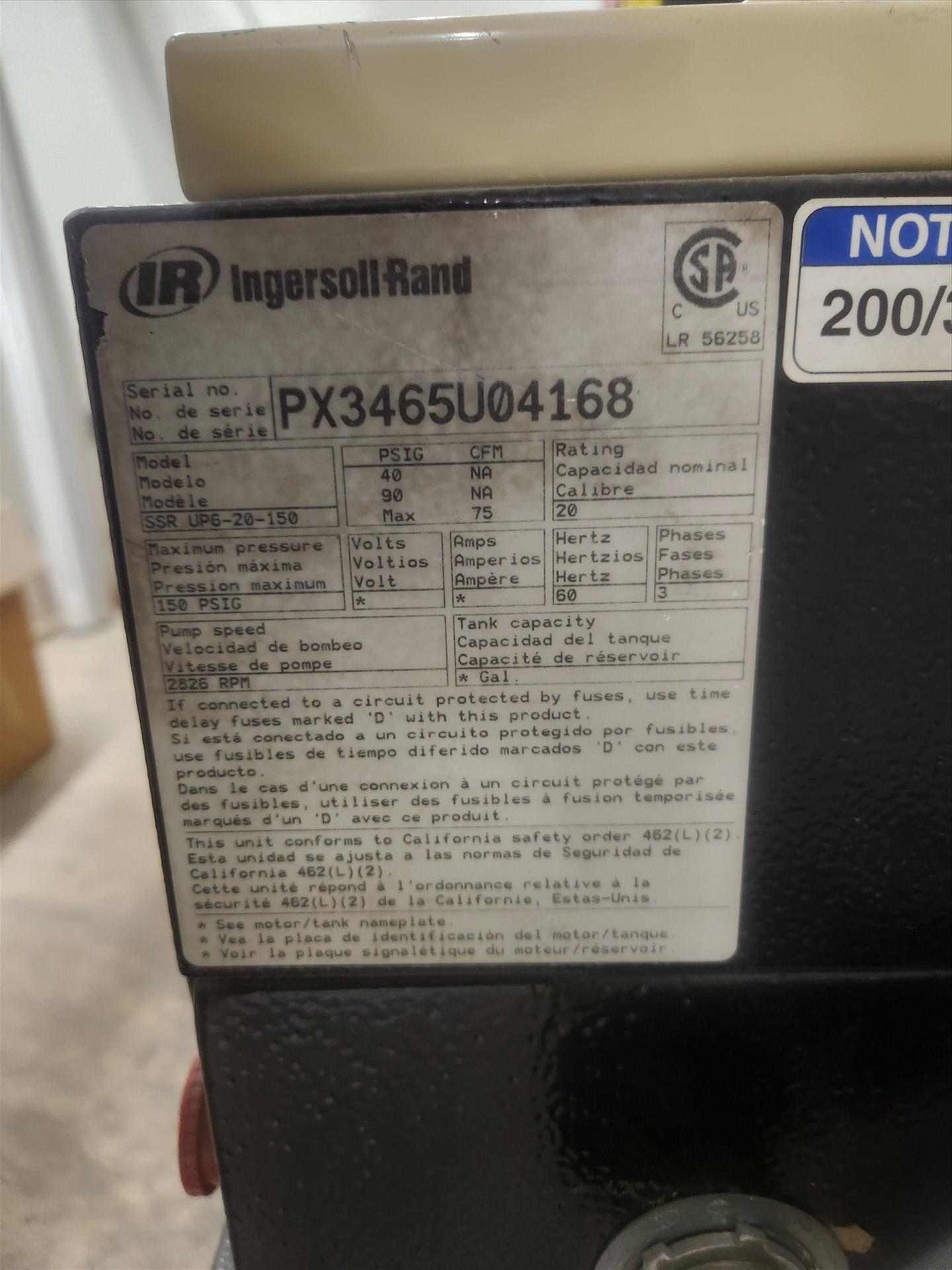 Ingersoll Rand Air Compressor mod. SSR UP6-20-150, rotary screw, 20 hp, serial number PX3465U04168