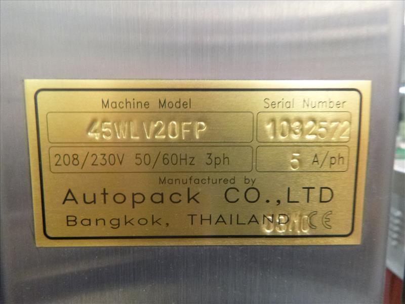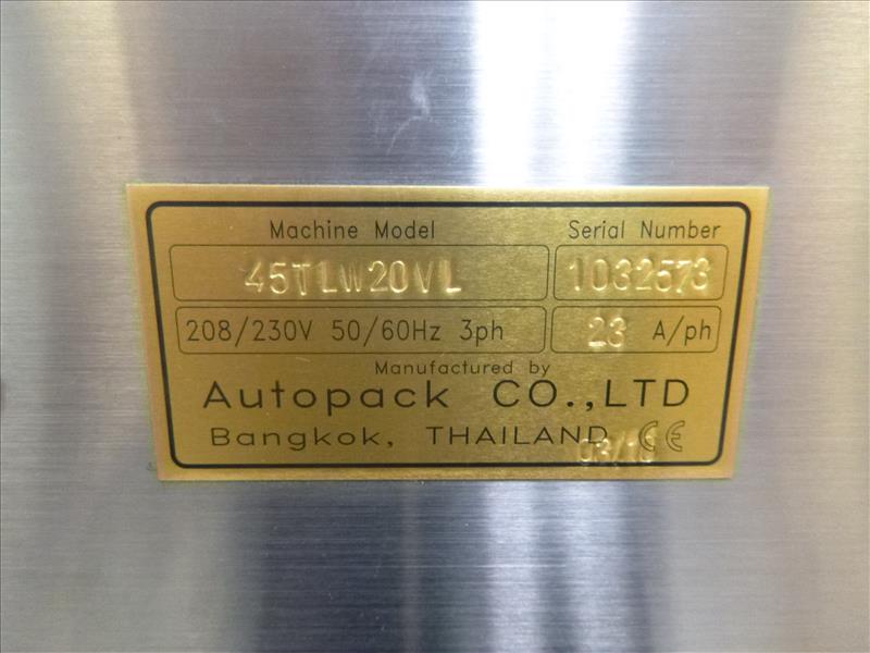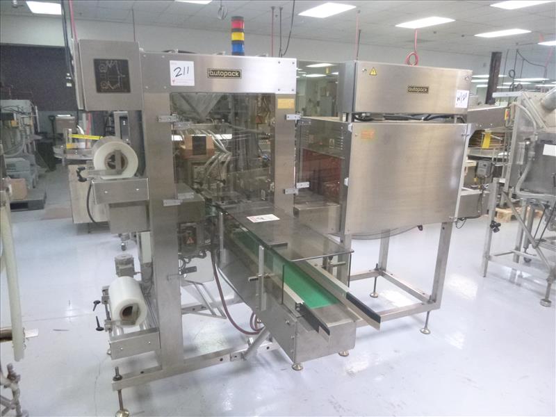 Autopak stainless steel automatic shrink packaging & stacking system, c/w integral vertical collator, 430 mm. max. film width, max. speed 10 to 15 ppm(2010) including : (1) sleeve wrapper, model 45WLV20FP, w/vertical collator, ser. no. 1032572 (1) heat shrink tunnel w/ variable speed conveyor, model 45TLW20VL, ser. no. 1032573 208/230 volt, 3-phase