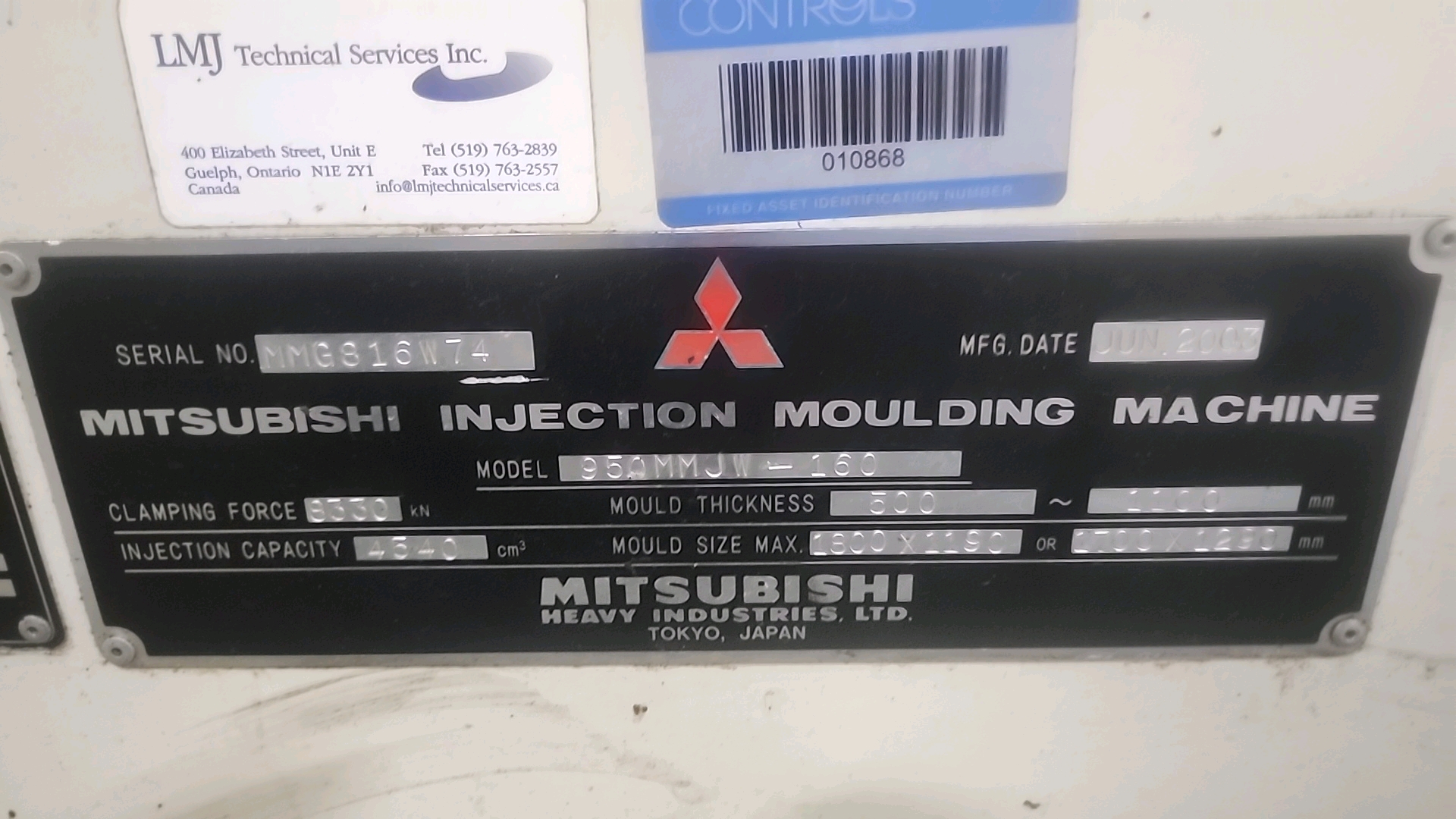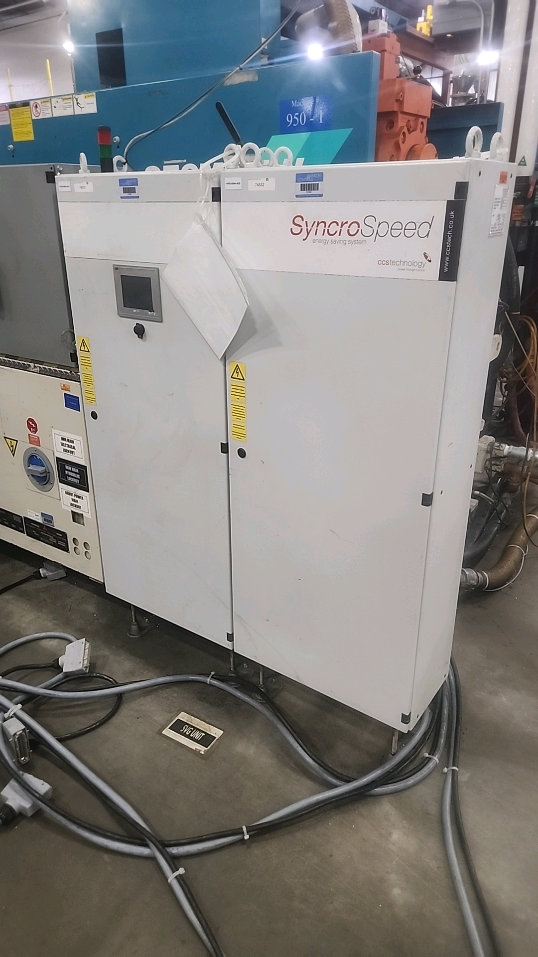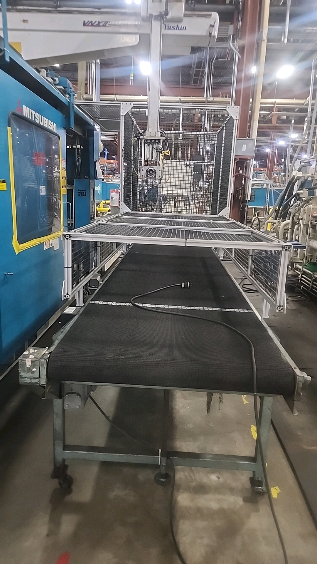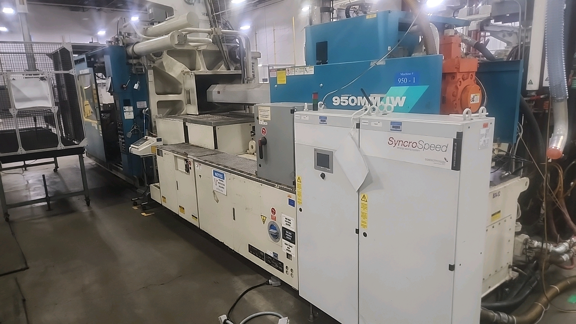 Mitsubishi injection molding machine, mod. 950MMJW-160, 147.44 Oz, Hydraulic, Mac Vii Control, Tie Bar 51 in x 47 in, Min/Max Shut 19.69 in/43.31 in, Daylight 88.58 in, Core Pull Valves, Robot Interface, ser. no. MMG816W74 (2003), c/w Nucon Wittmannn vacuum loader, transformer and (2) CCS SyncroSpeed VSDs c/w power belt conveyor, approx. 36 in x 14 ft. on casters w/ safety cage