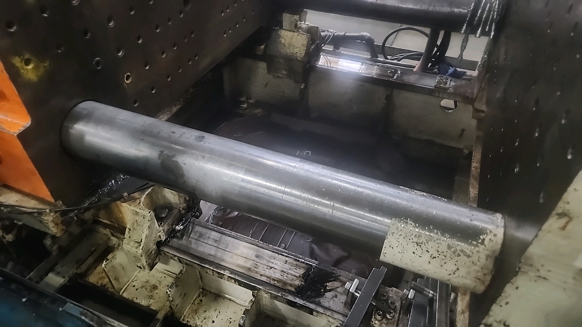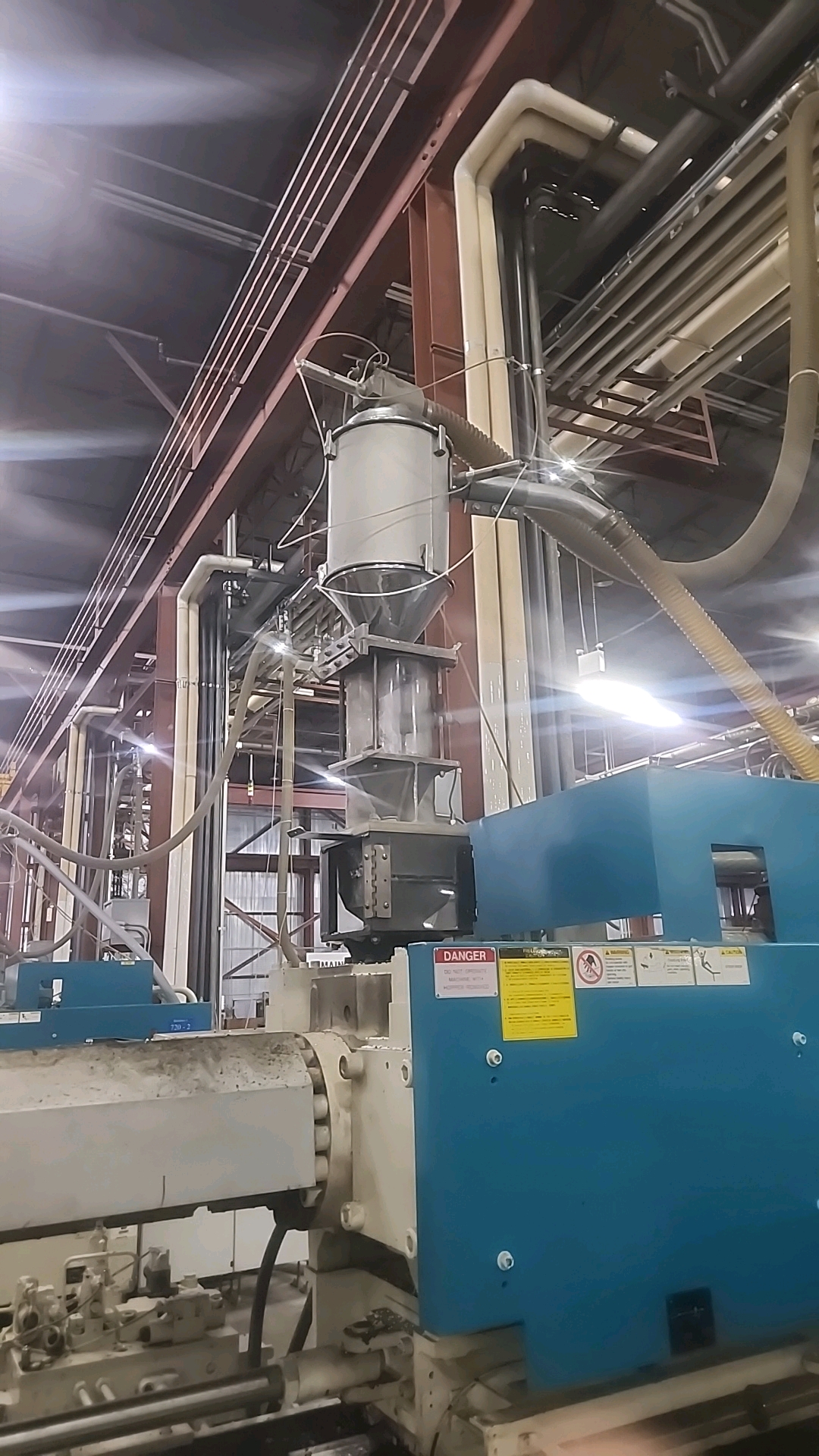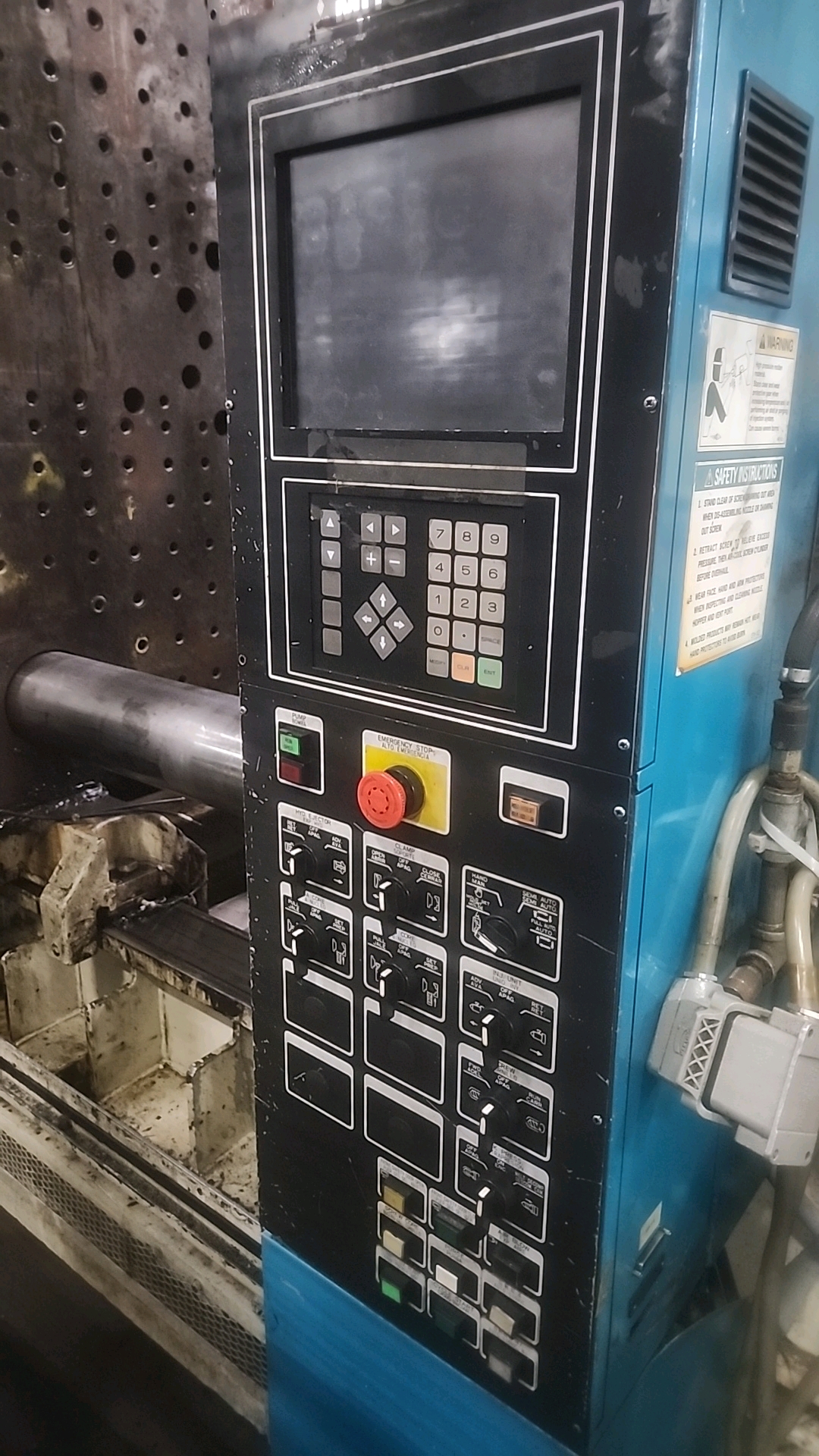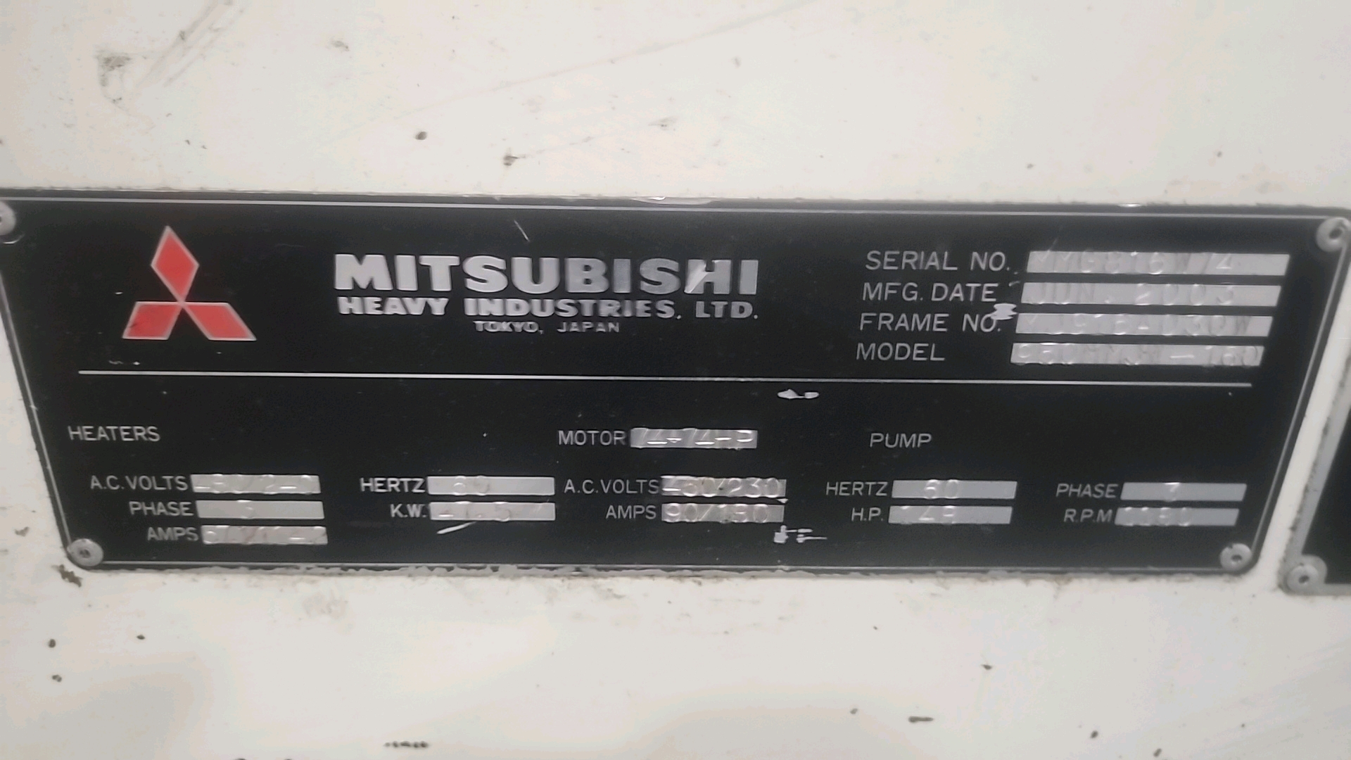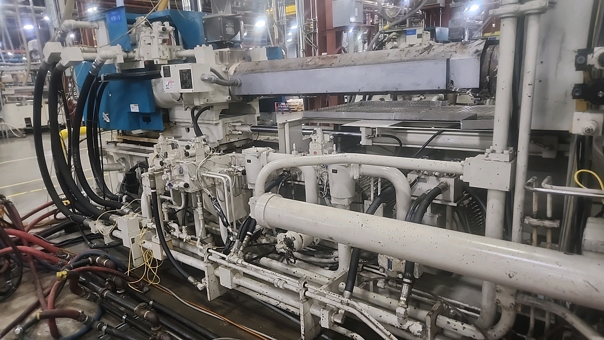 Mitsubishi injection molding machine, mod. 950MMJW-160, 147.44 Oz, Hydraulic, Mac Vii Control, Tie Bar 51 in x 47 in, Min/Max Shut 19.69 in/43.31 in, Daylight 88.58 in, Core Pull Valves, Robot Interface, ser. no. MMG816W74 (2003), c/w Nucon Wittmannn vacuum loader, transformer and (2) CCS SyncroSpeed VSDs c/w power belt conveyor, approx. 36 in x 14 ft. on casters w/ safety cage