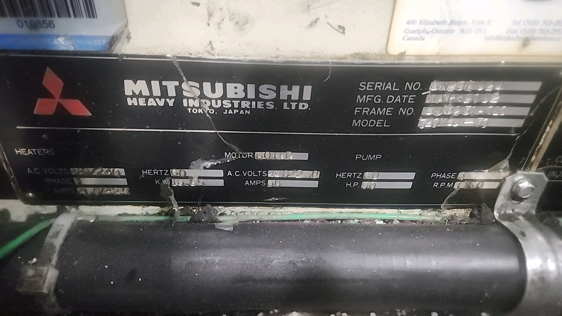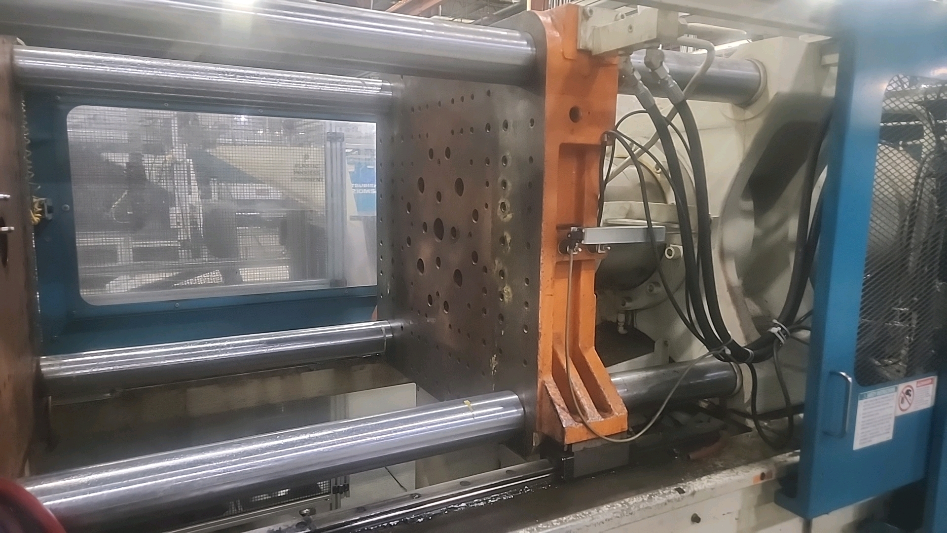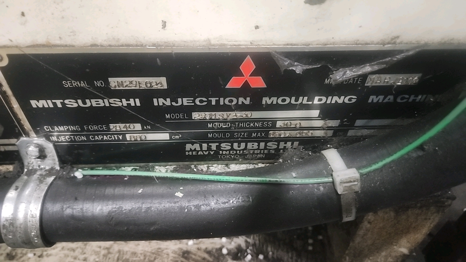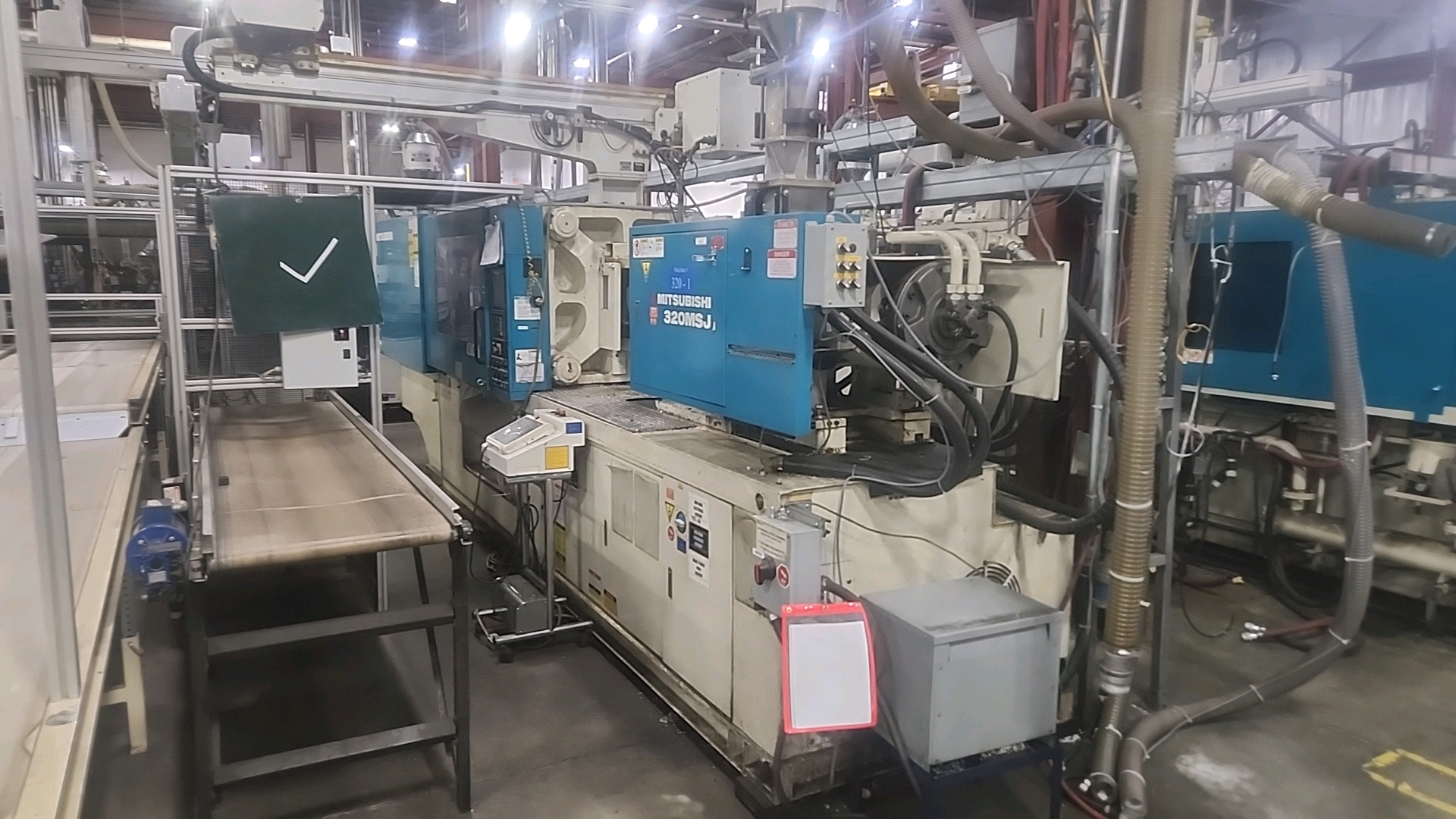 Mitsubishi injection molding machine, mod. 320MSJ-30, 28.57 Oz, Hydraulic, Mac Vii Control, Tie Bar 26 in x 26 in, Min Shut 11.8 in, Daylight 45.3 in, Core Pull Valves, Robot Interface, ser. no. SN29E0254 (2002), c/w Nucon Wittmannn vacuum loader, transformer c/w Yushin Netliner VNXII-250S servo traverse take-out robot w/ controller c/w power belt conveyor, approx. 24 in x 10 ft.. w/ safety cage