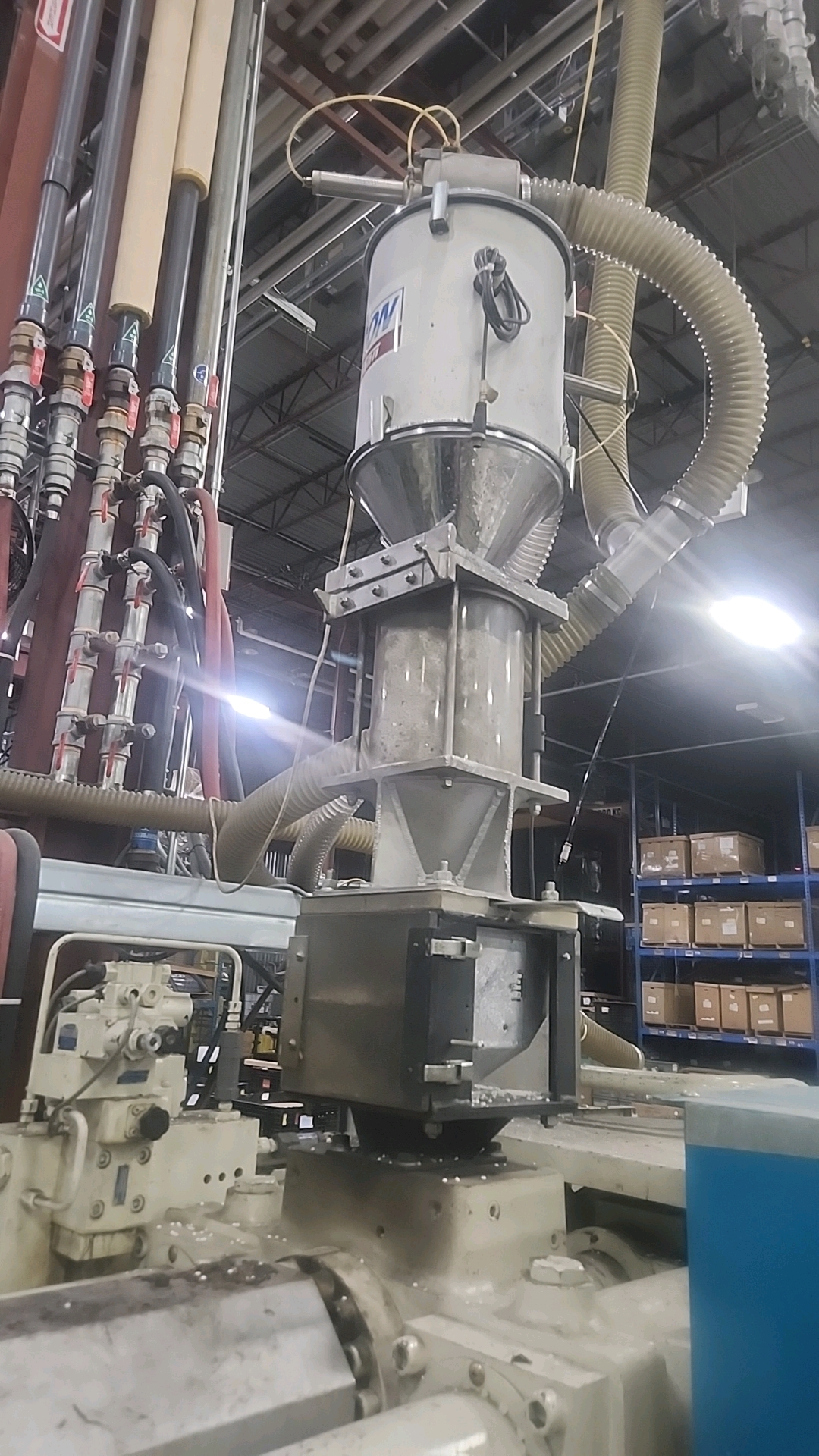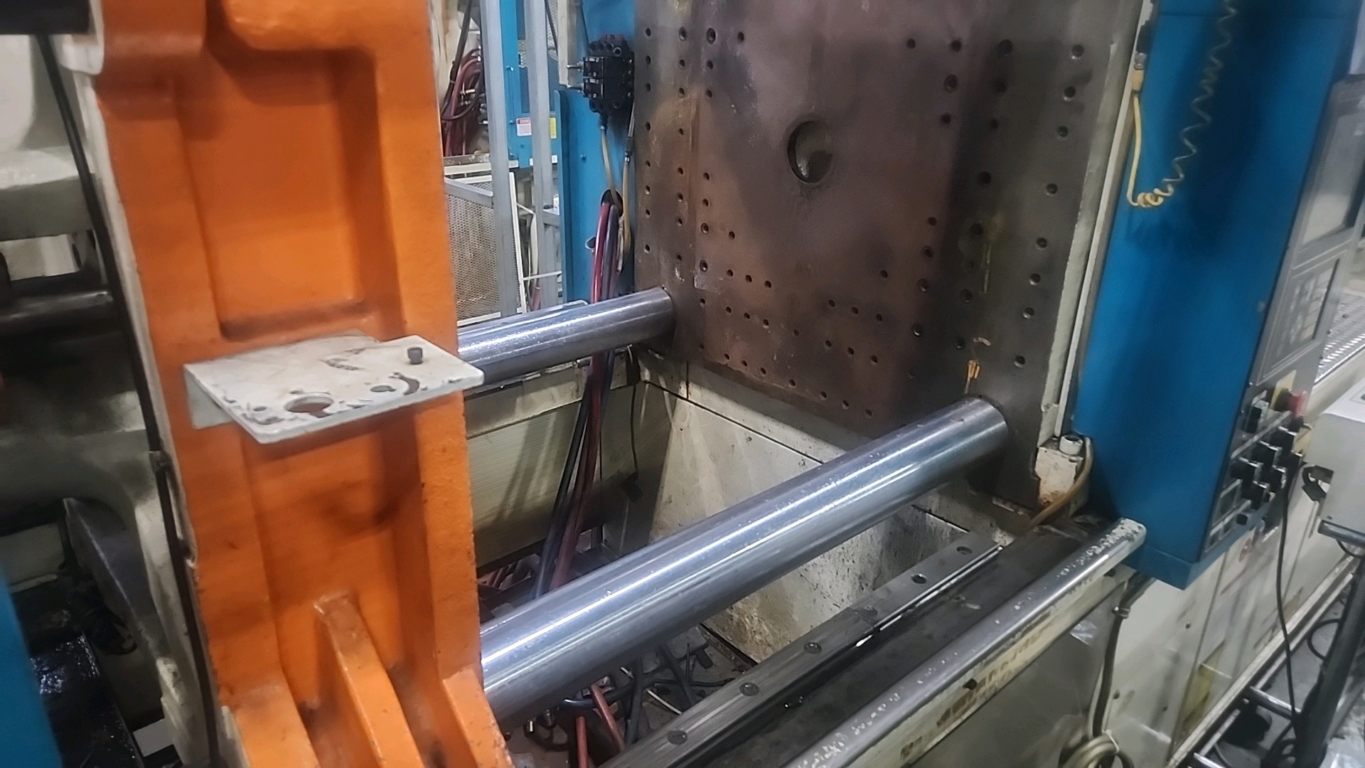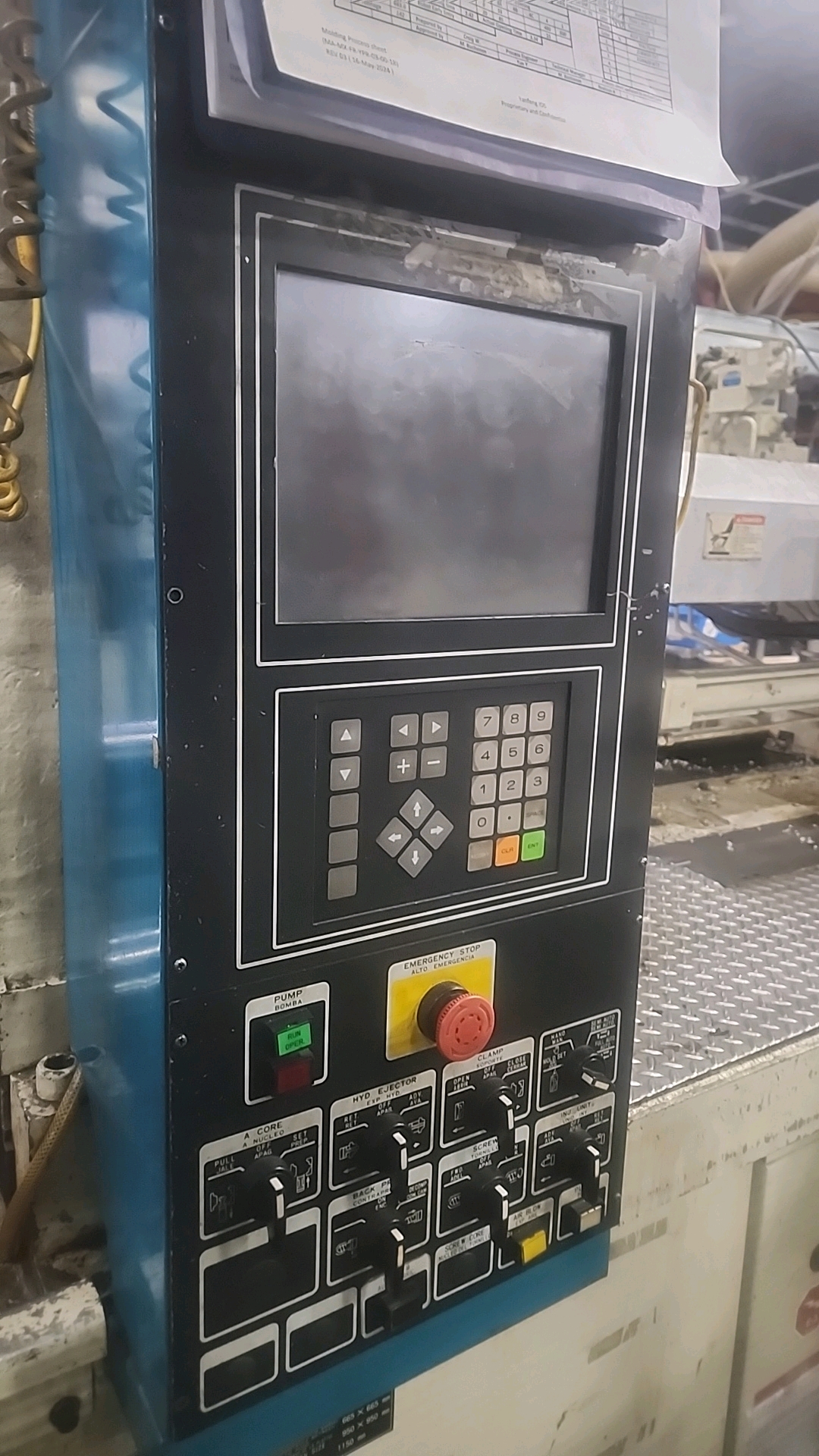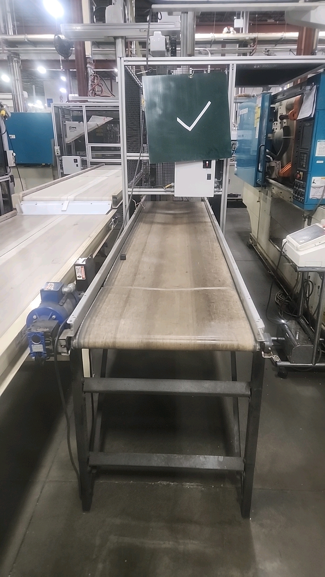 Mitsubishi injection molding machine, mod. 320MSJ-30, 28.57 Oz, Hydraulic, Mac Vii Control, Tie Bar 26 in x 26 in, Min Shut 11.8 in, Daylight 45.3 in, Core Pull Valves, Robot Interface, ser. no. SN29E0254 (2002), c/w Nucon Wittmannn vacuum loader, transformer c/w Yushin Netliner VNXII-250S servo traverse take-out robot w/ controller c/w power belt conveyor, approx. 24 in x 10 ft.. w/ safety cage