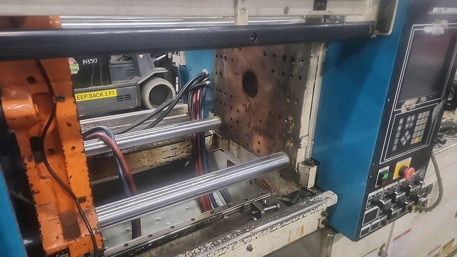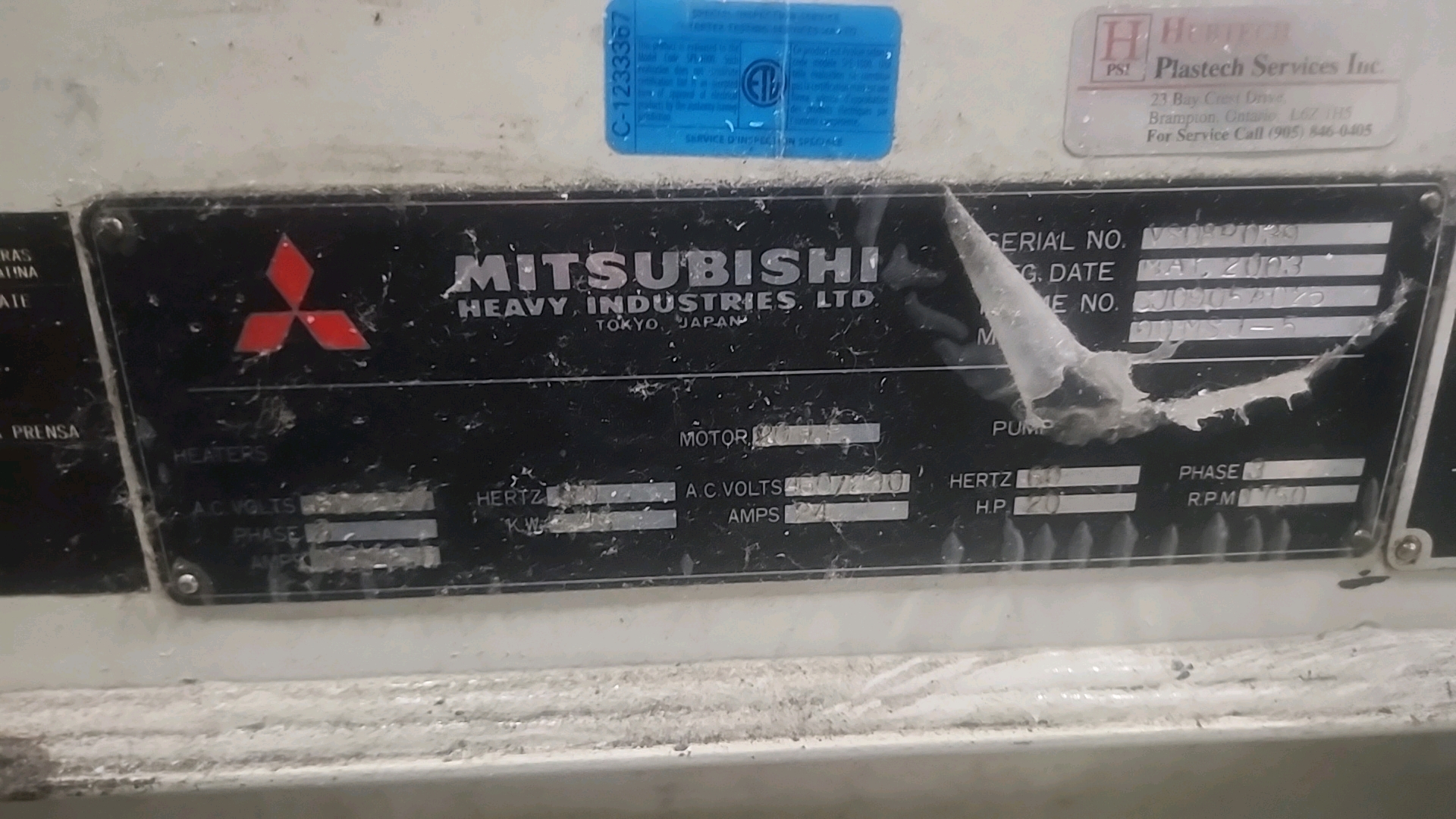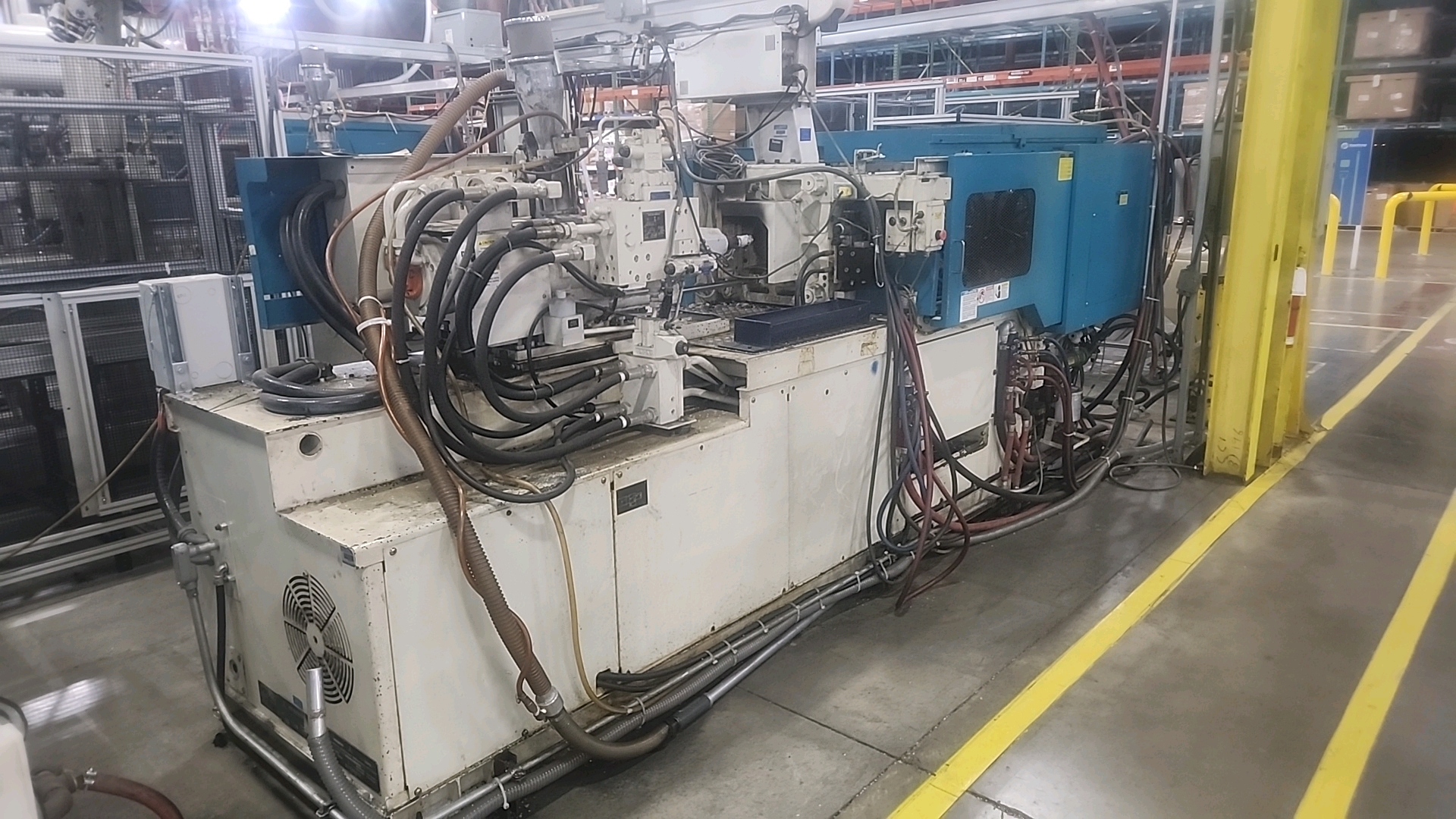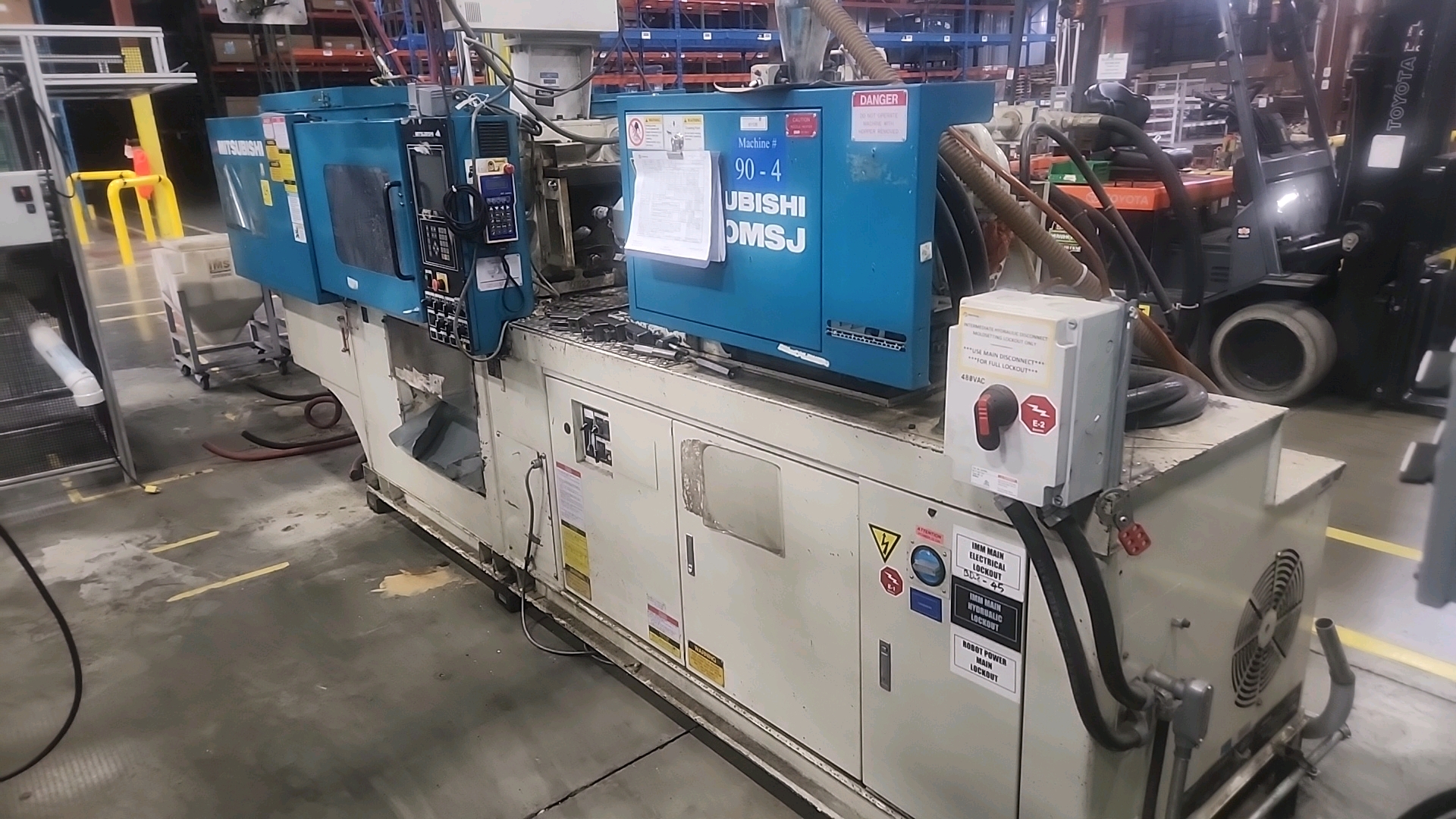 Mitsubishi injection molding machine, mod. 90MSJ-5, 4.8 Oz, Hydraulic, Mac Vii Control, Tie Bar 15 in x 15 in, Min Shut 7.1 in, Daylight 25.6 in, Core Pull Valves, Robot Interface, ser. no. VS08B039 (2003), c/w Nucon Wittmannn vacuum loader, transformer c/w Yushin ATA-150S servo traverse take-out robot w/ controller w/ safety cage