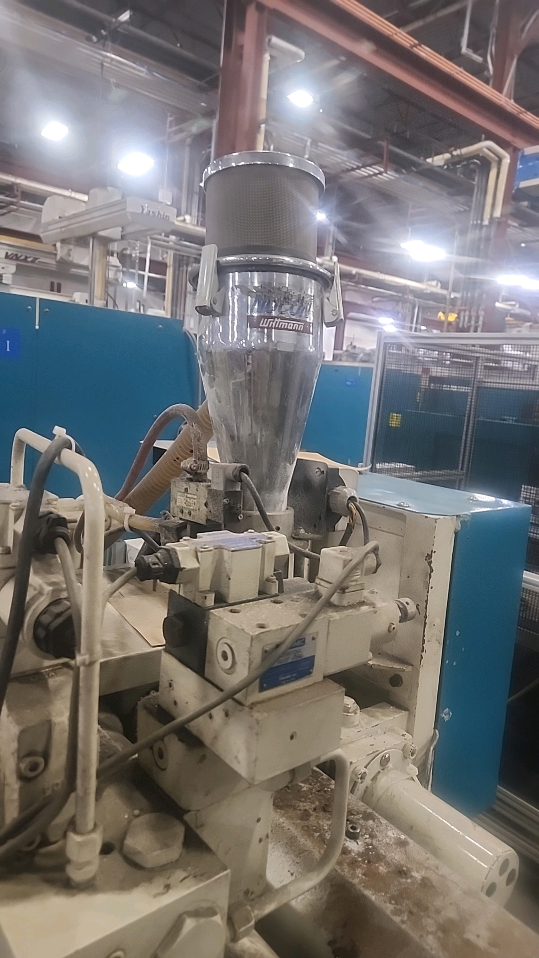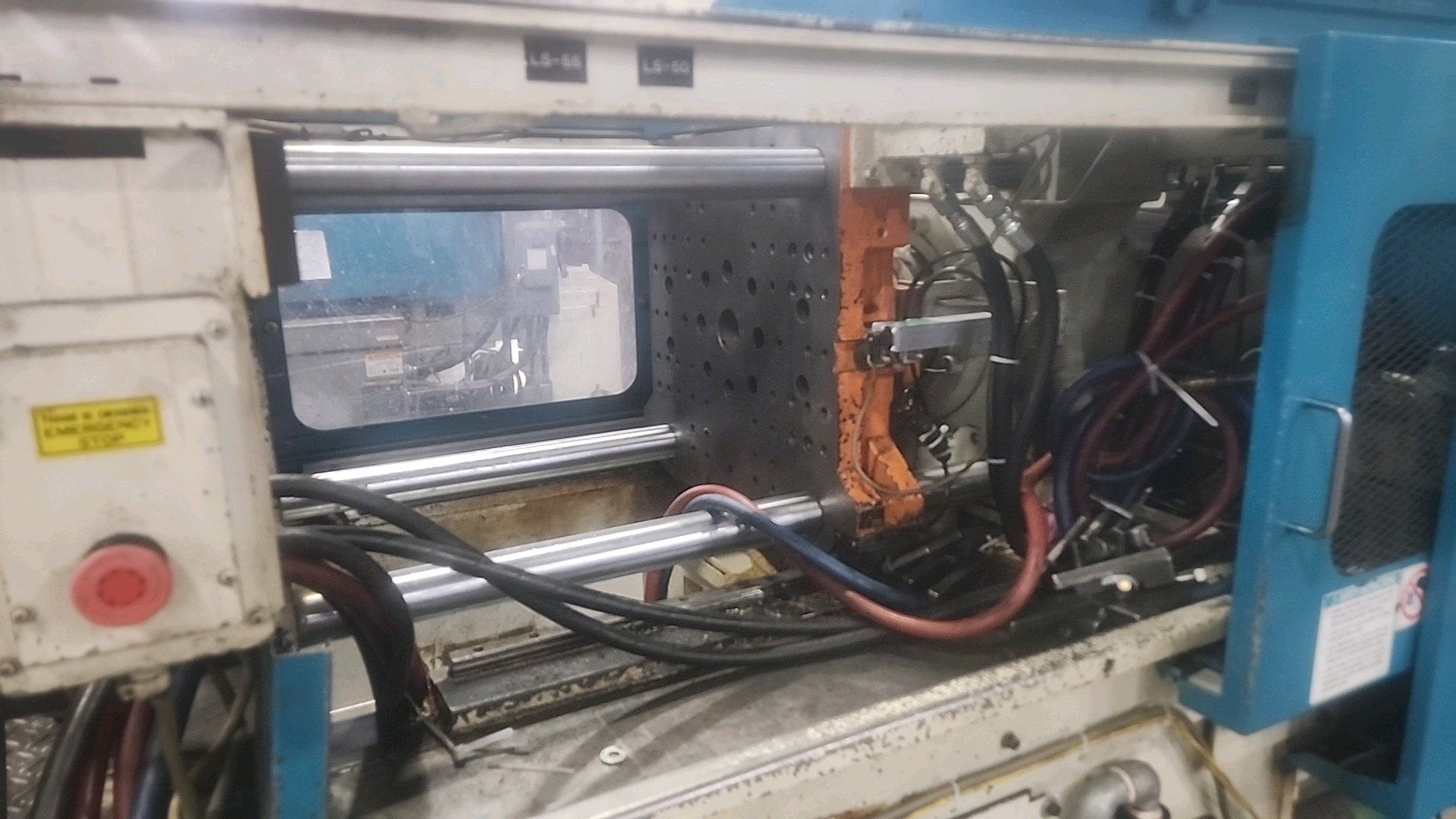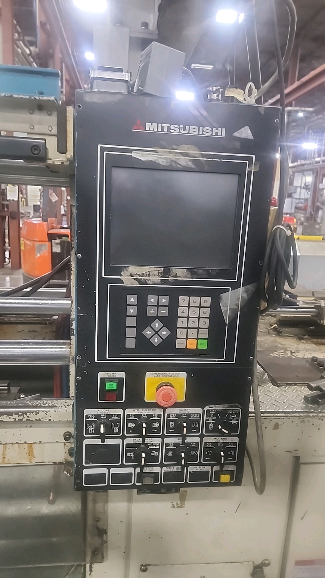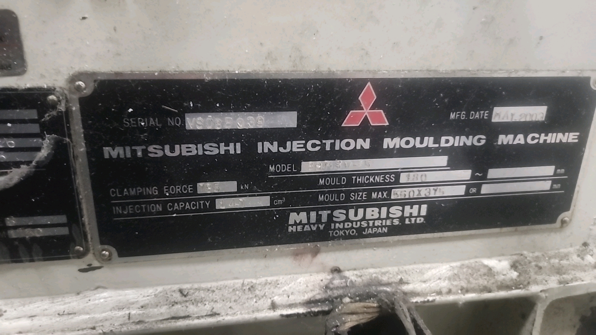 Mitsubishi injection molding machine, mod. 90MSJ-5, 4.8 Oz, Hydraulic, Mac Vii Control, Tie Bar 15 in x 15 in, Min Shut 7.1 in, Daylight 25.6 in, Core Pull Valves, Robot Interface, ser. no. VS08B039 (2003), c/w Nucon Wittmannn vacuum loader, transformer c/w Yushin ATA-150S servo traverse take-out robot w/ controller w/ safety cage