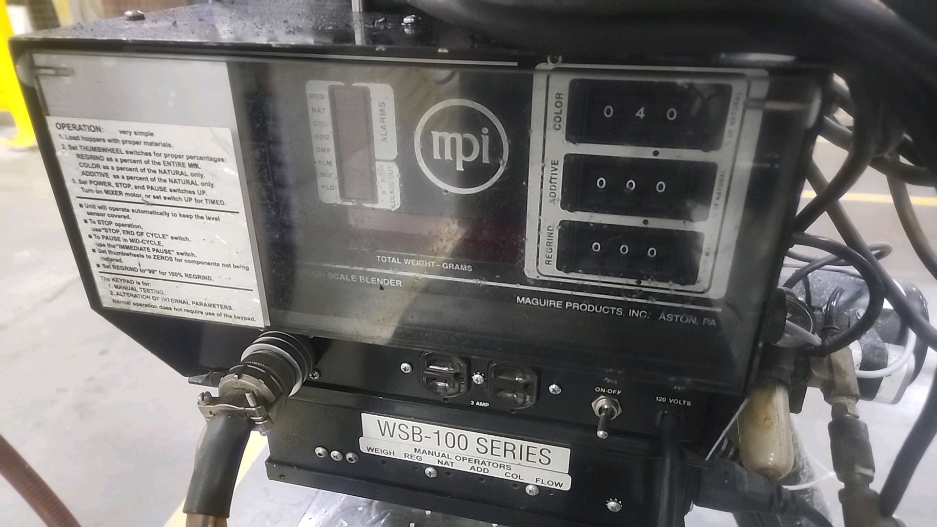 Maguire gravimetric resin blender, mod. WSB-140, ser. no. 103480-20 (2003) w/ MPI weigh scale c/w Shini vacuum loader