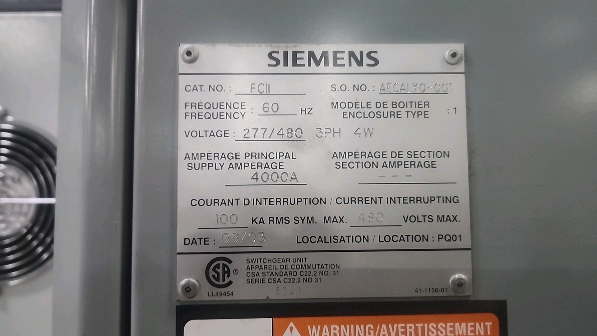 Siemens motor control center, cat. no. FCII (2003), 277/480 V, 4000 A, 60 Hz