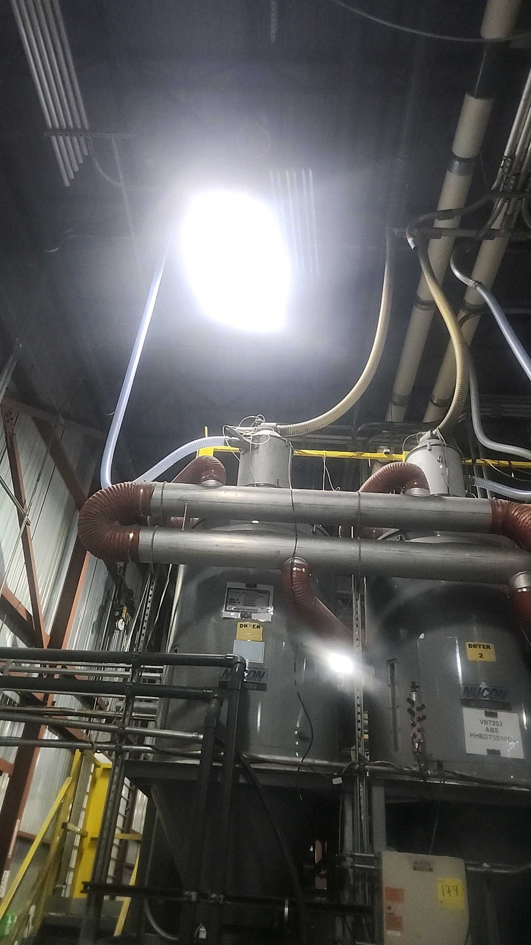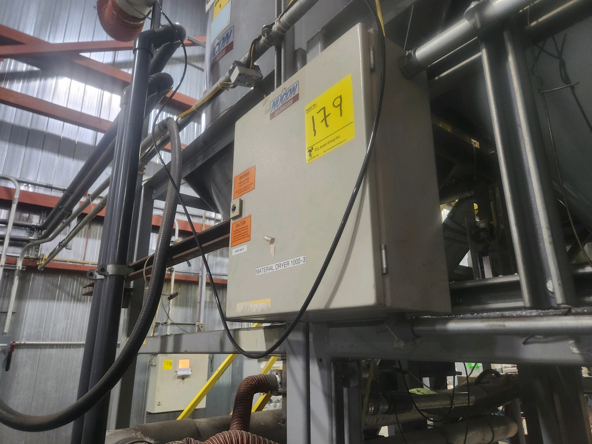 Nucon Wittmannn resin dryer hopper (SML), bottom discharge w/ airlock, heater/blower, control panel c/w Nucon Wittmann vacuum loader c/w stand