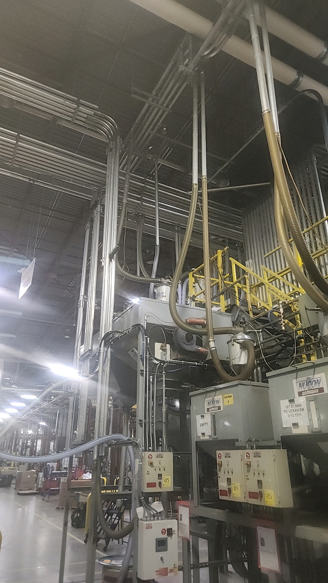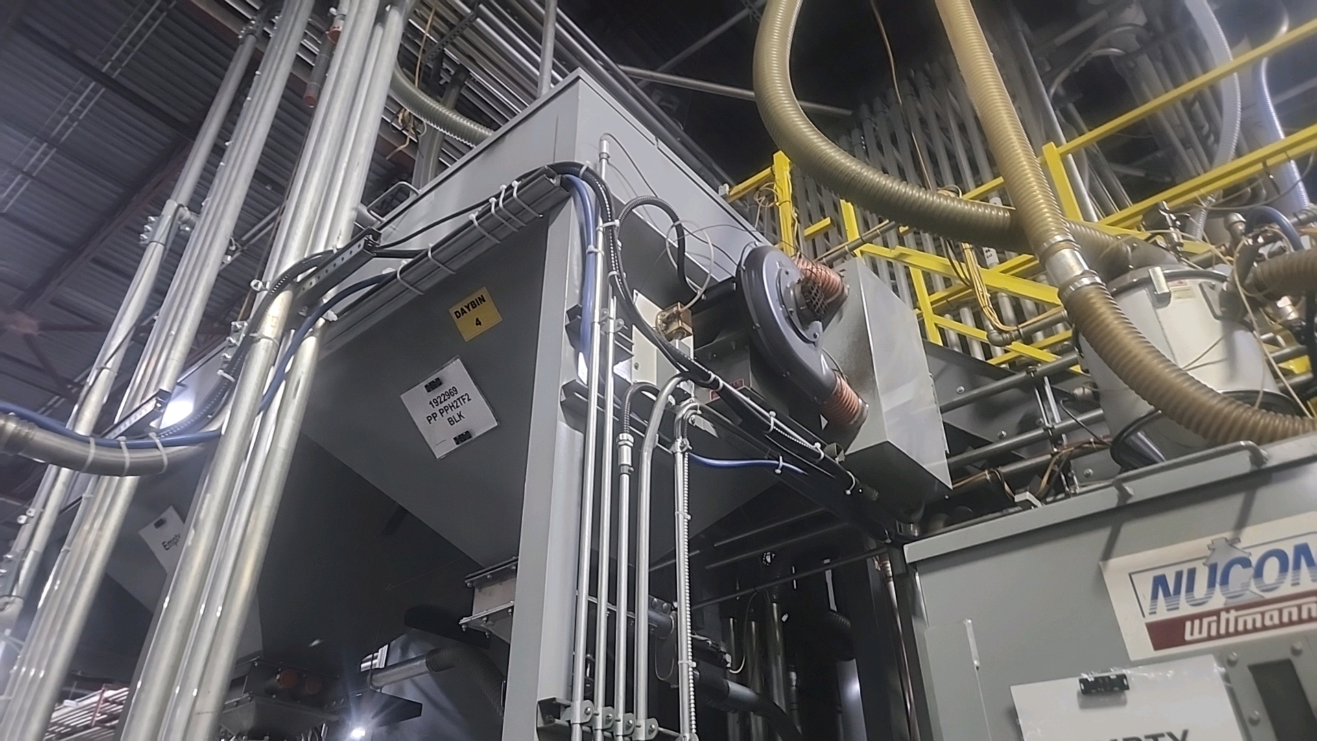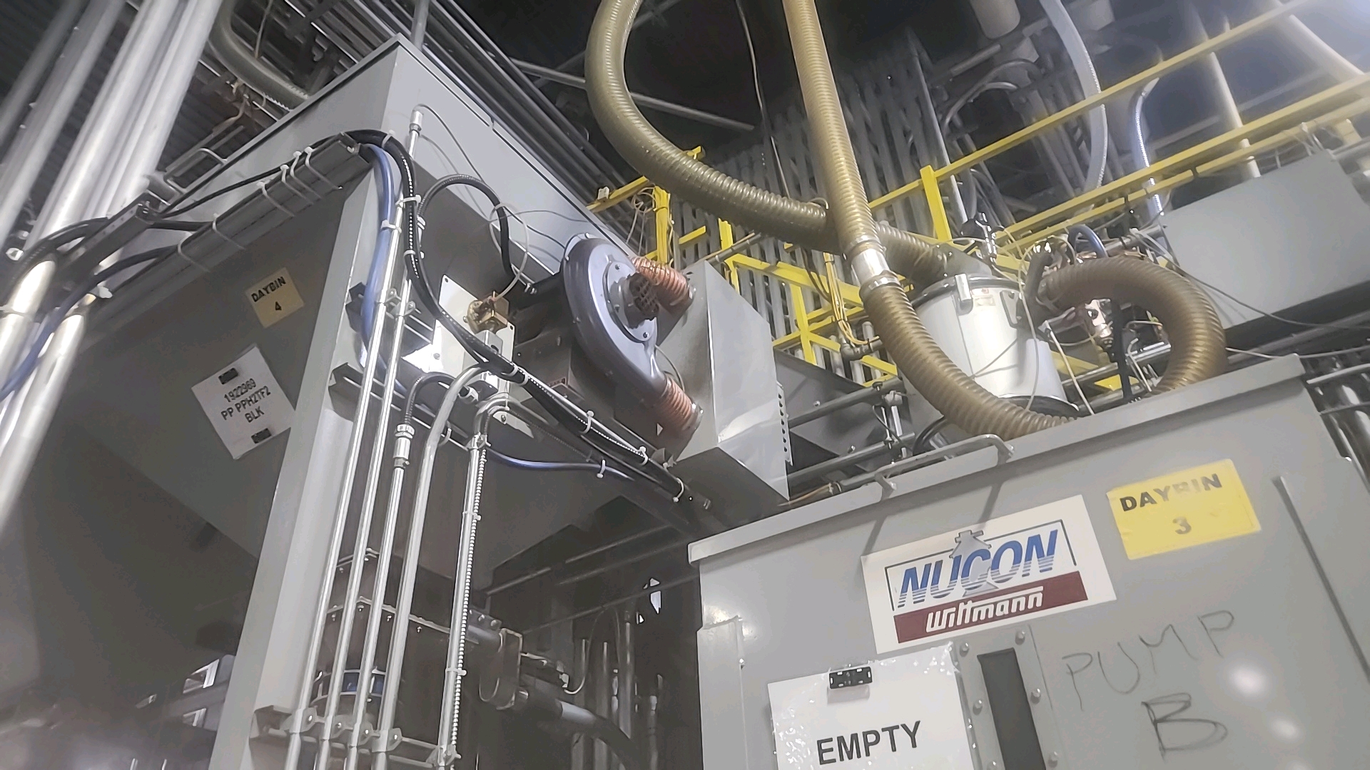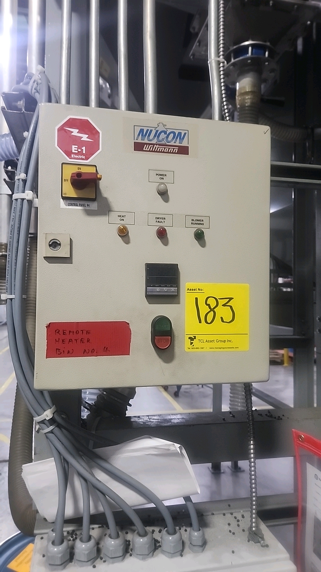Nucon Wittmannn resin dryer day bin (MED), bottom discharge w/ airlock, heater/blower, control panel c/w Nucon Wittmann vacuum loader c/w stand