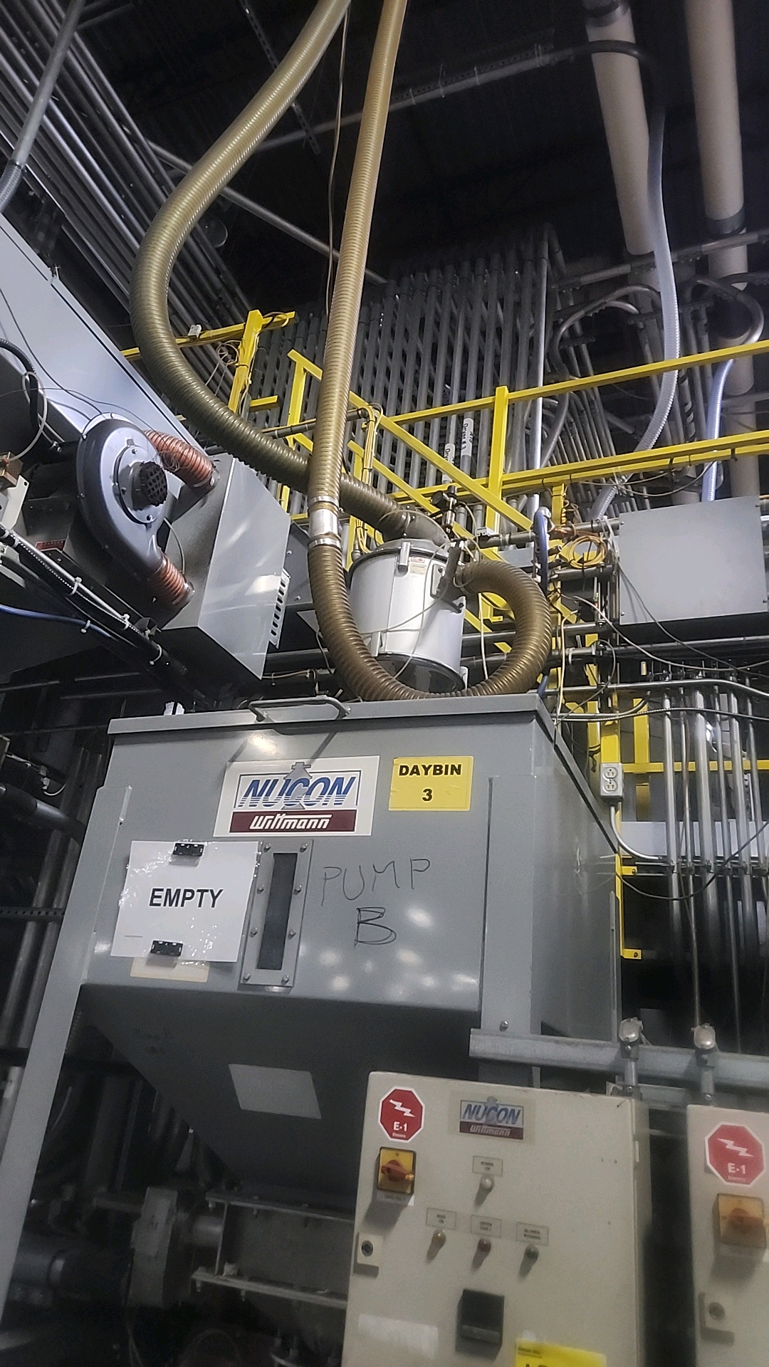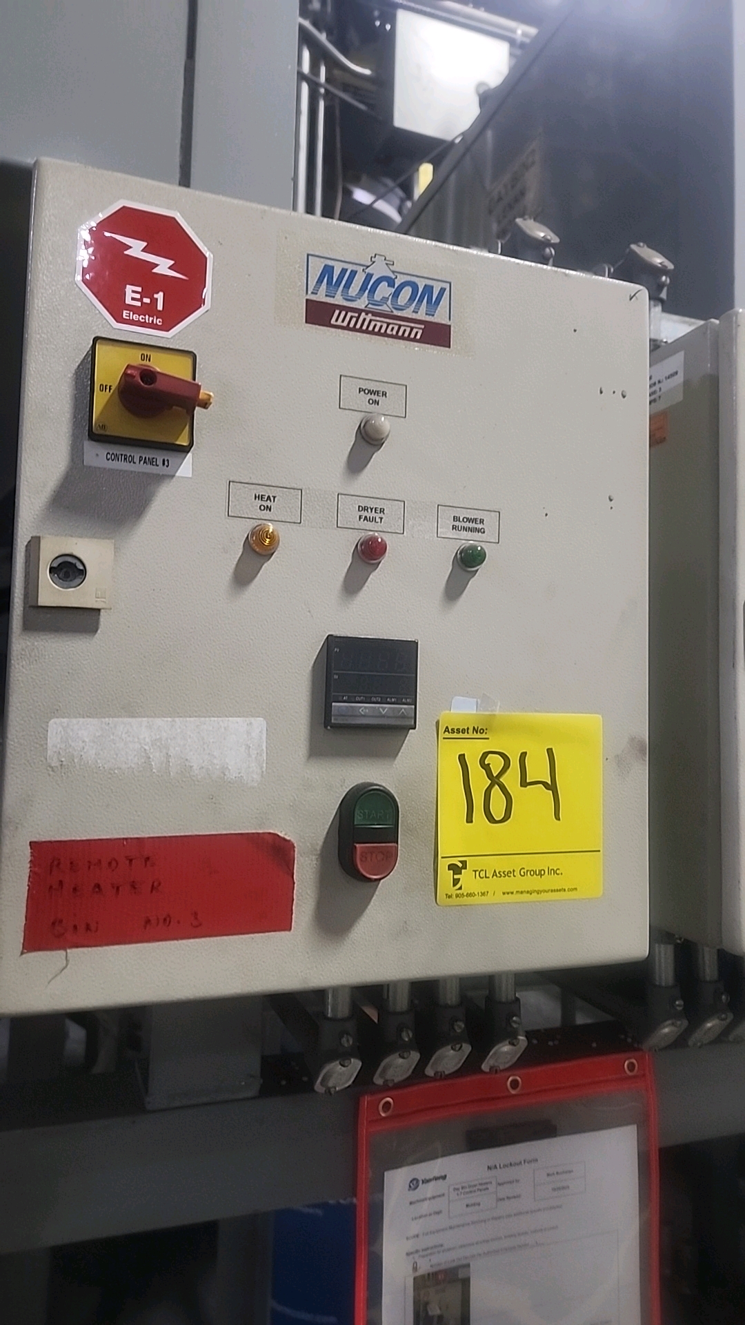 Nucon Wittmannn resin dryer day bin (SML), bottom discharge w/ airlock, heater/blower, control panel c/w Nucon Wittmann vacuum loader