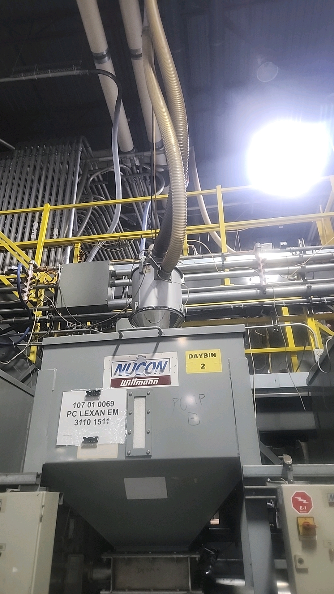Nucon Wittmannn resin dryer day bin (SML), bottom discharge w/ airlock, heater/blower, control panel c/w Nucon Wittmann vacuum loader