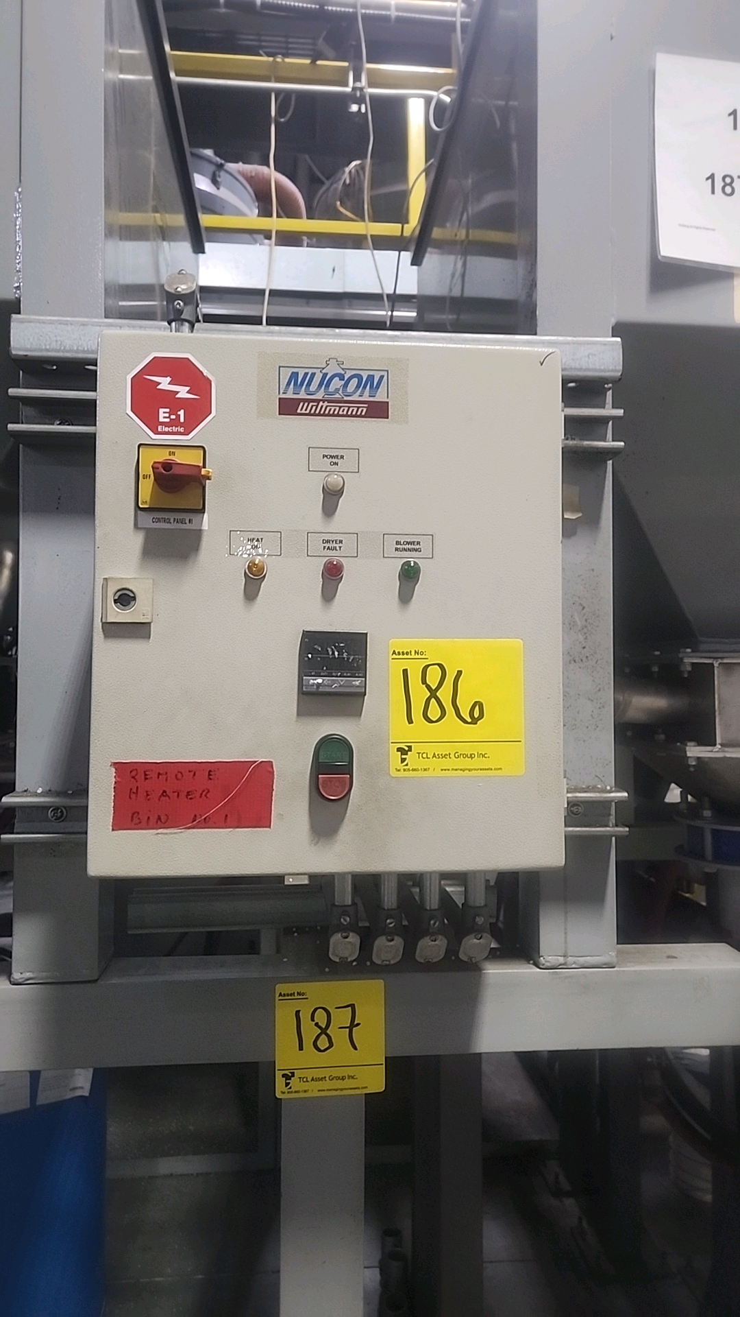 Nucon Wittmannn resin dryer day bin (SML), bottom discharge w/ airlock, heater/blower, control panel c/w Nucon Wittmann vacuum loader