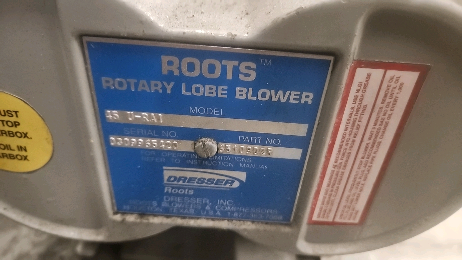 Nucon Wittmann/Dresser Roots rotary lobe blower/vacuum pump, mod. 45 U-RAI, 10 hp c/w Nucon Wittmann pulse filter and controller (may require repair)