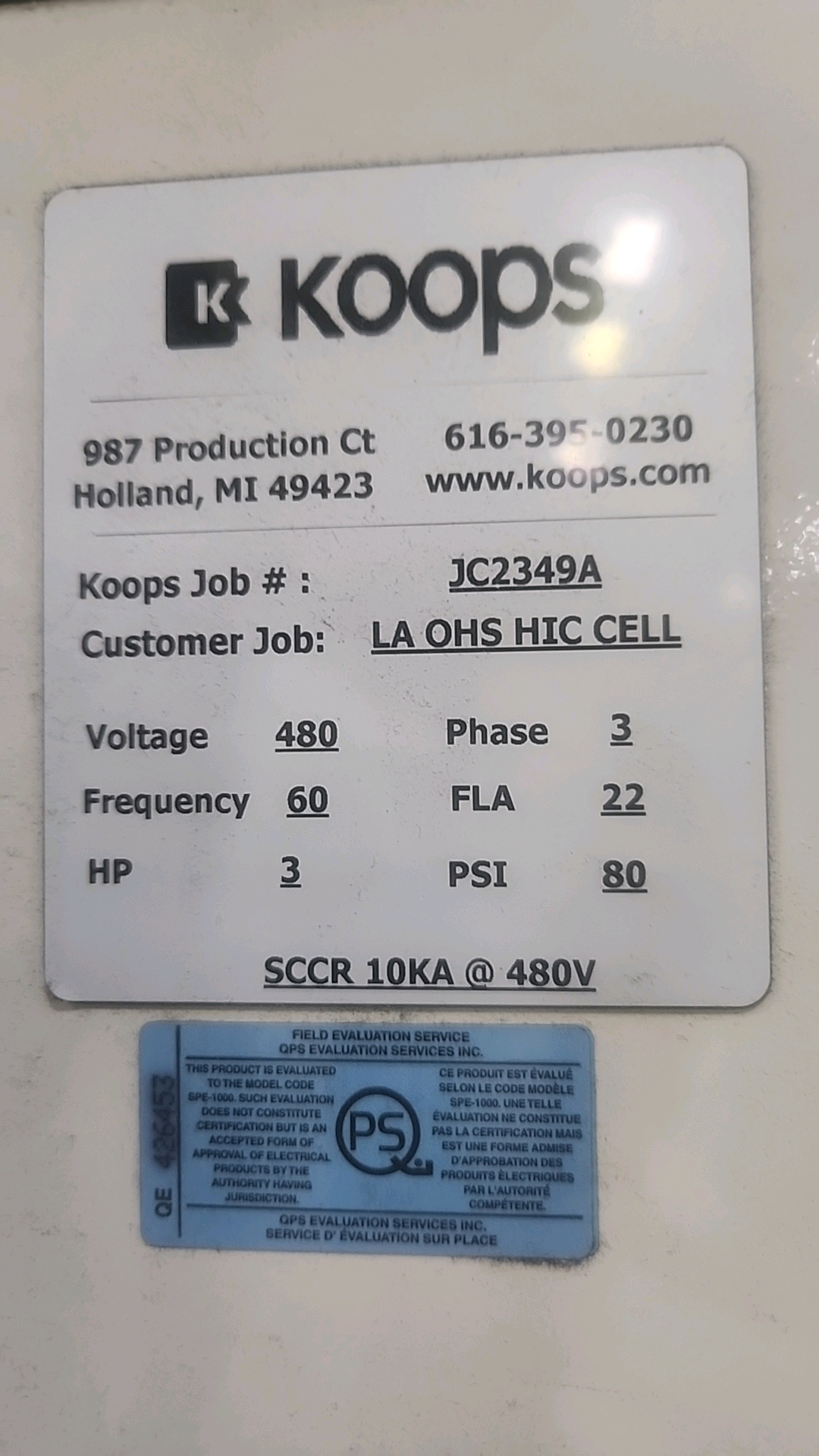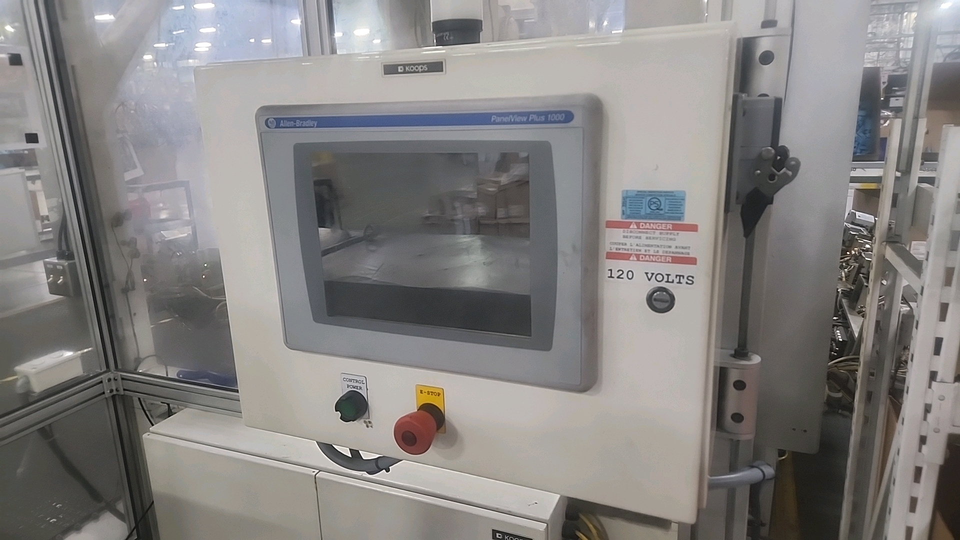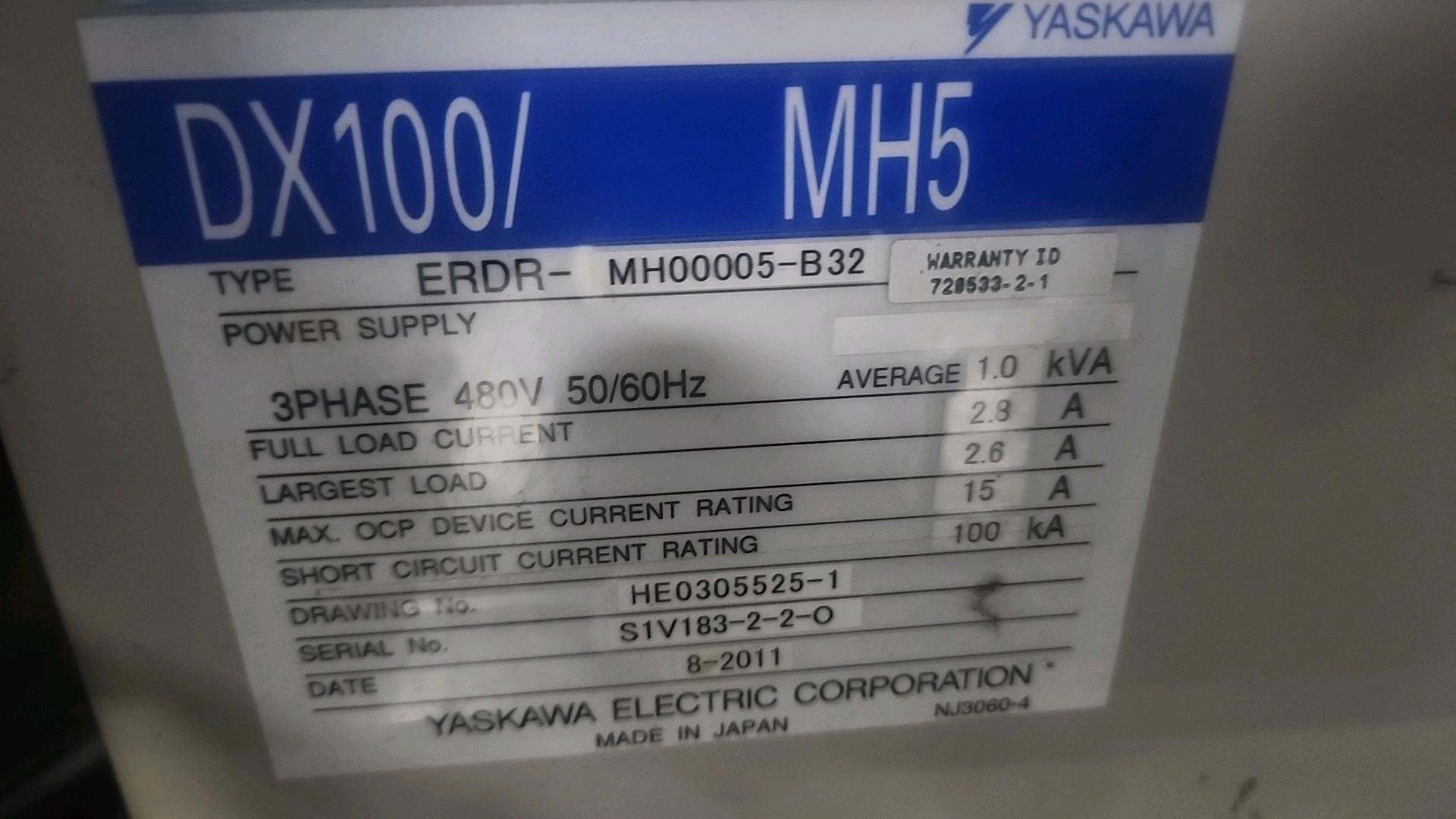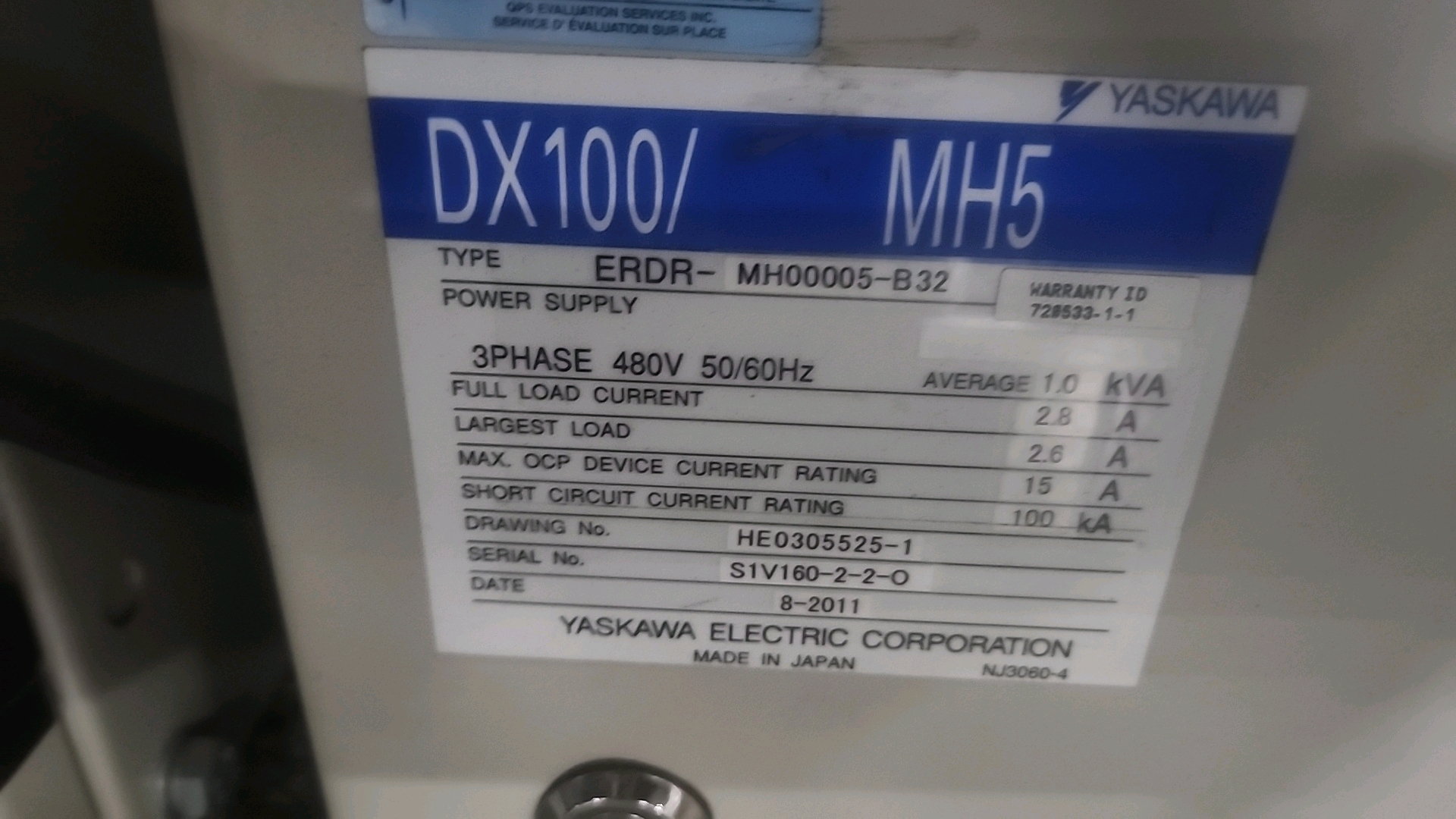 KOOP automated adhesive application cell, mod. LA OHS HIC w/ (2) Yaskawa Motoman robotic applicators, mod. DX100/MH5, ser. no. HE0305525-1 w/ controllers, fixture table w/ safety light curtains, control panel w/ Allen Bradley PanelView Plus 1000 controller
