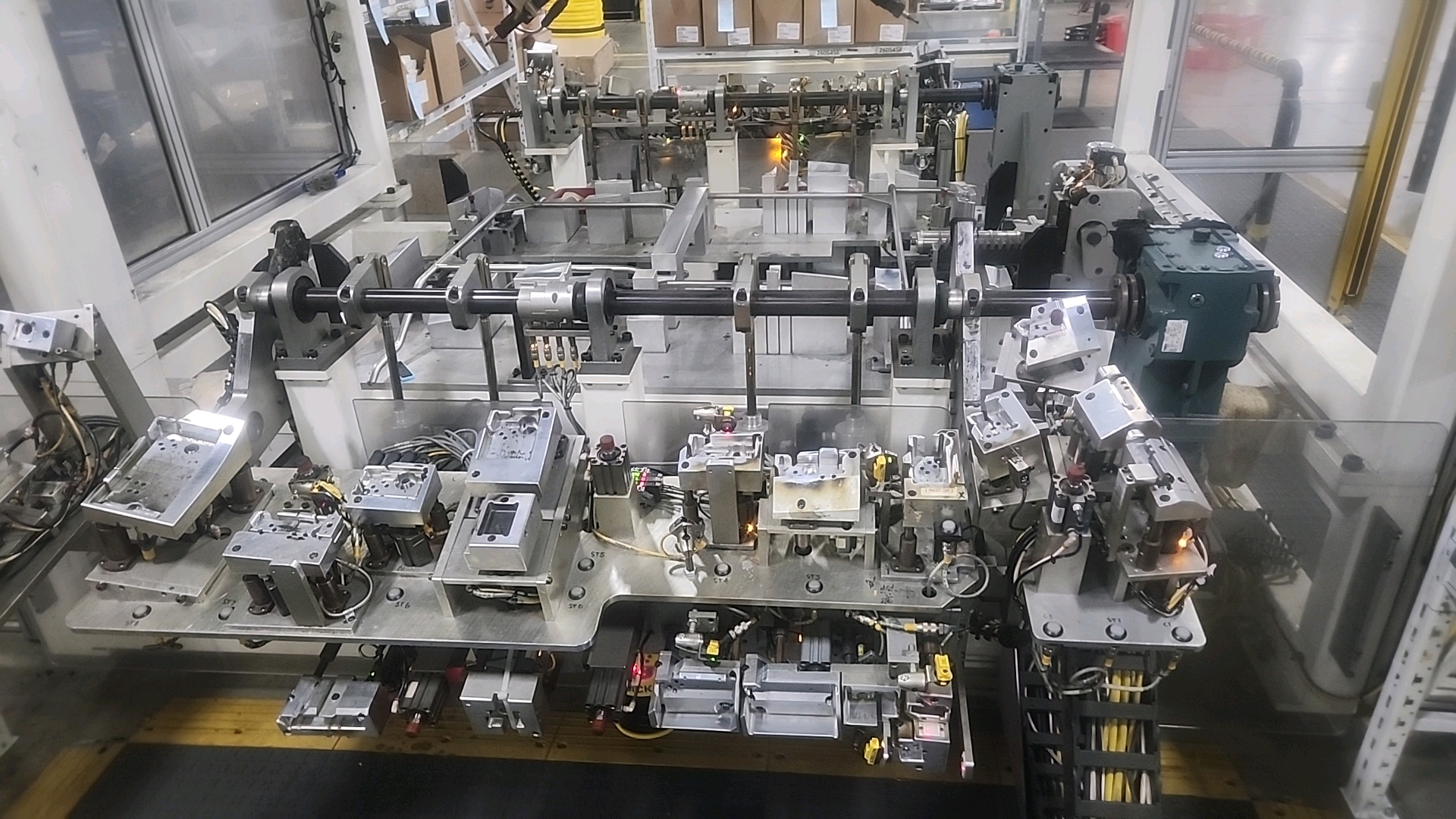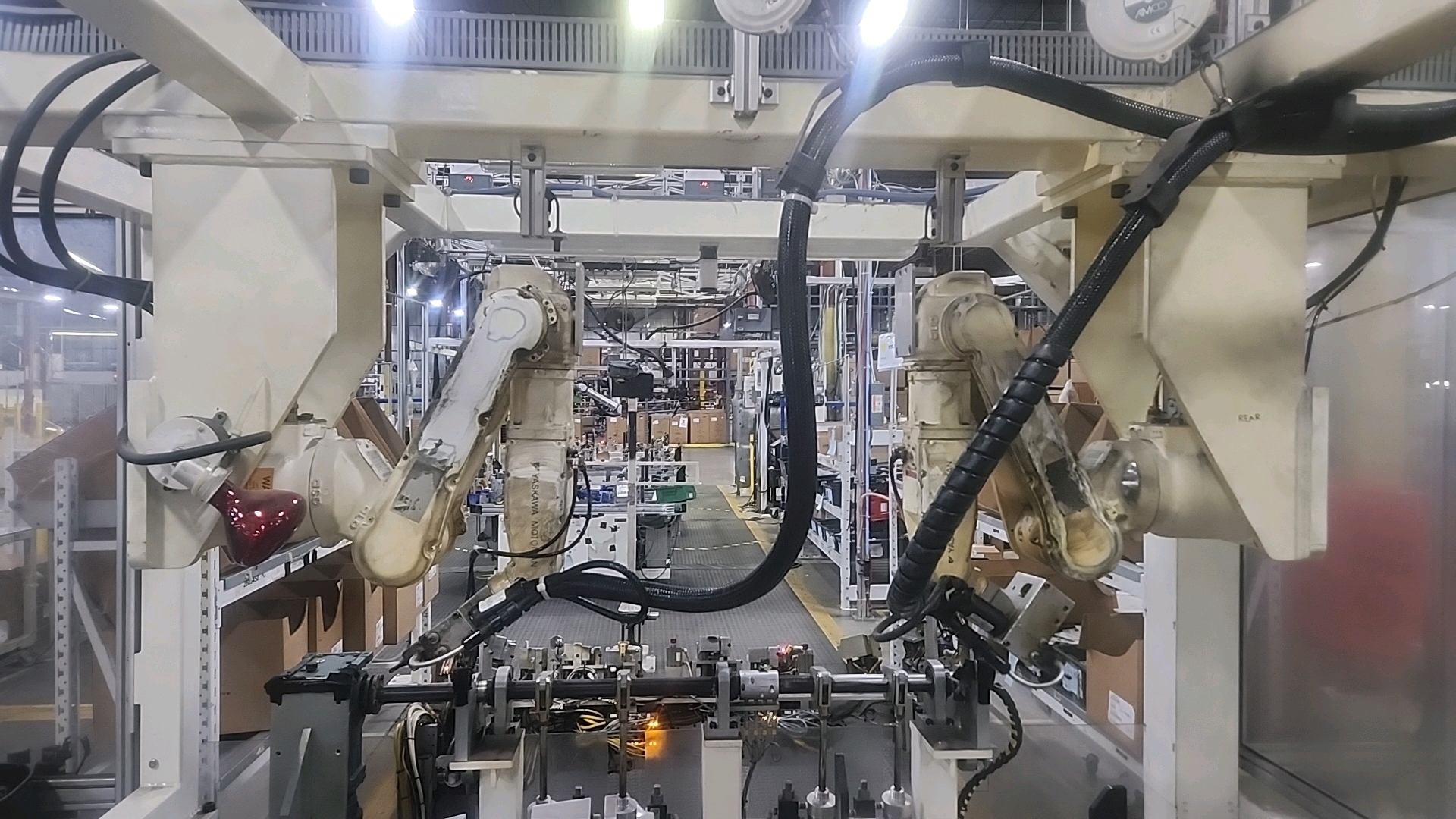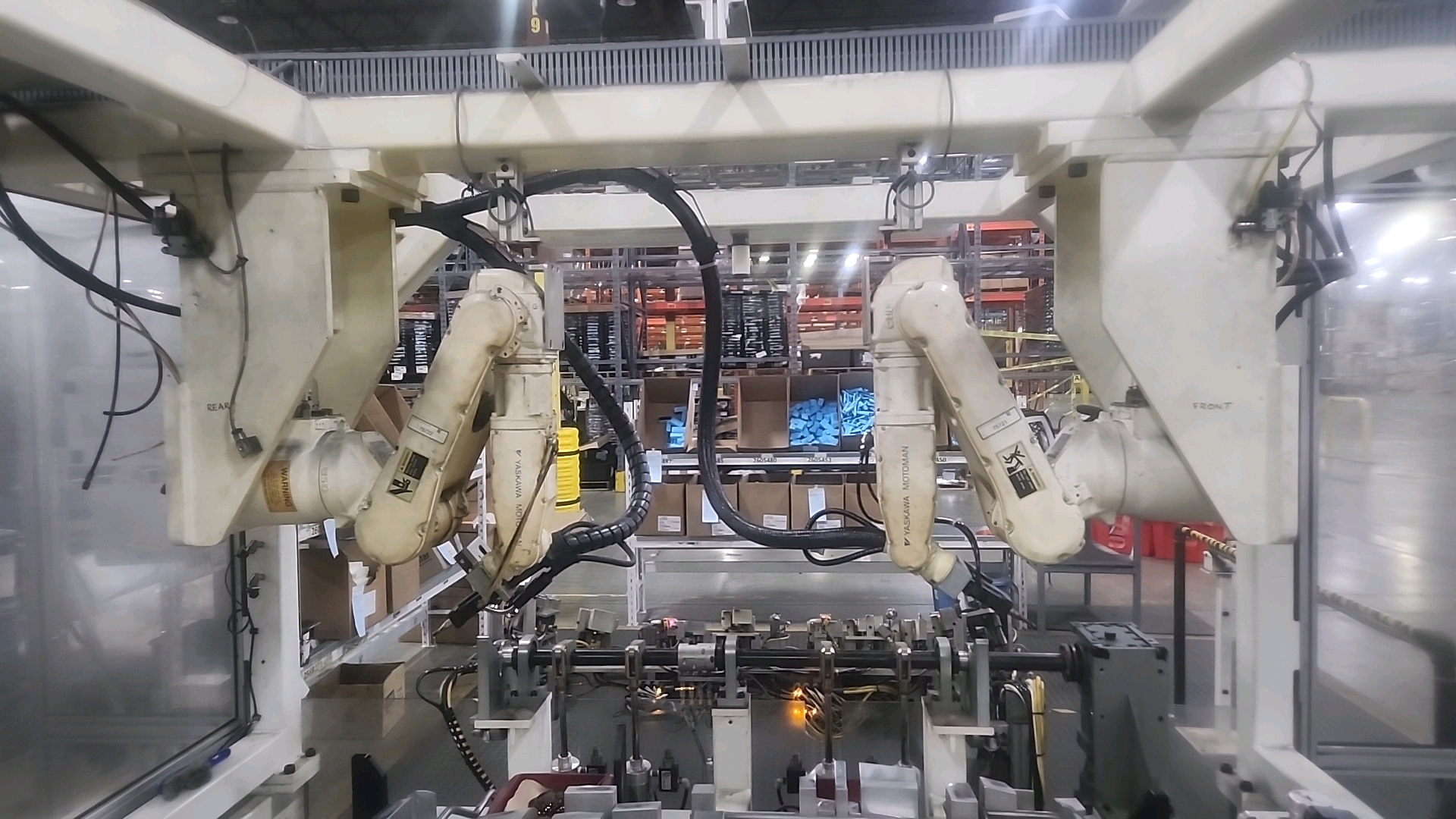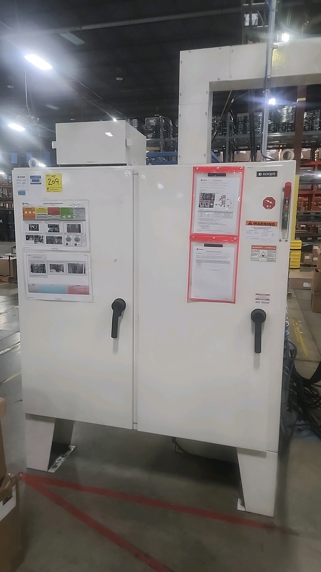 KOOP automated adhesive application cell, mod. LA OHS HIC w/ (2) Yaskawa Motoman robotic applicators, mod. DX100/MH5, ser. no. HE0305525-1 w/ controllers, fixture table w/ safety light curtains, control panel w/ Allen Bradley PanelView Plus 1000 controller