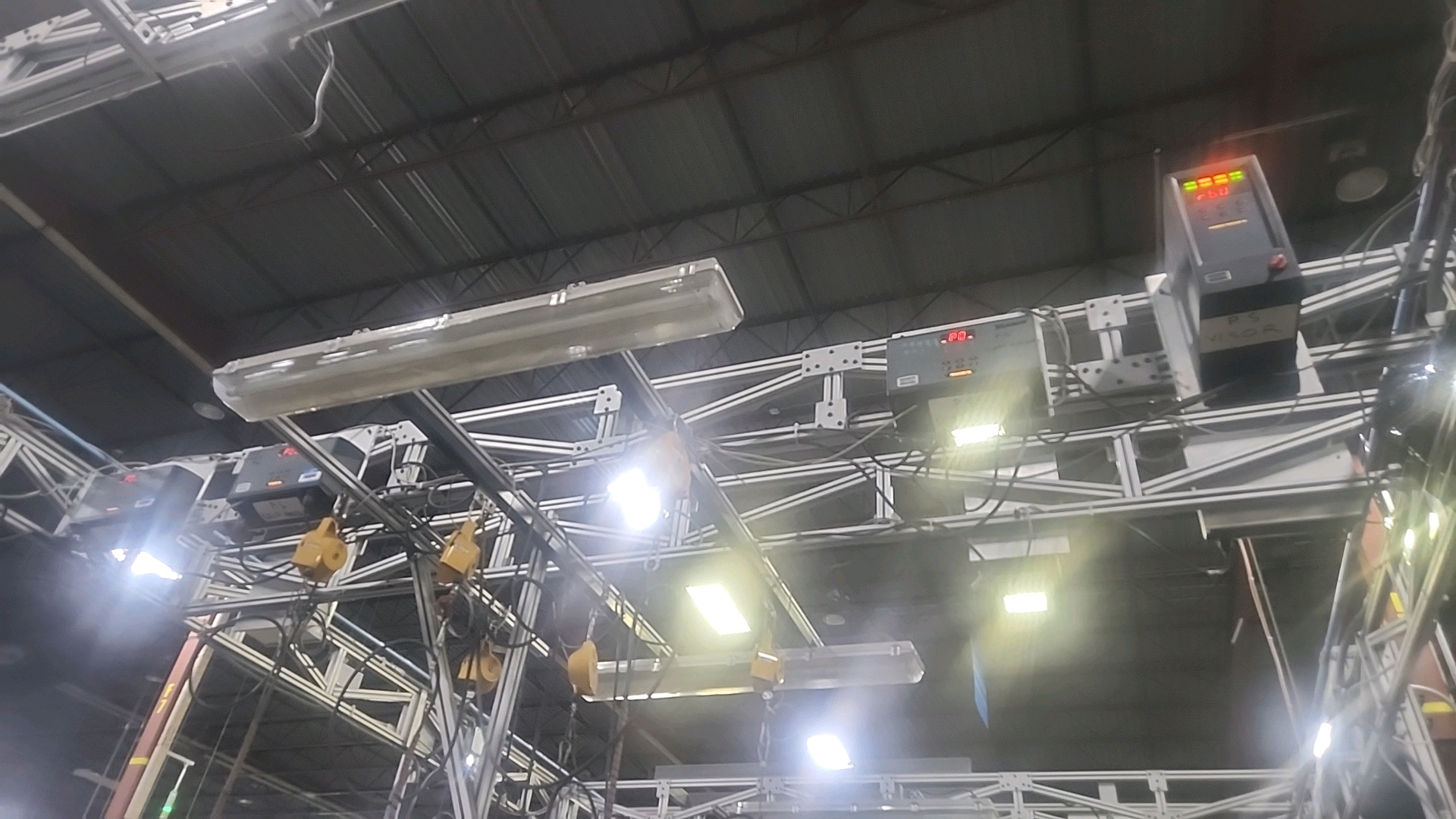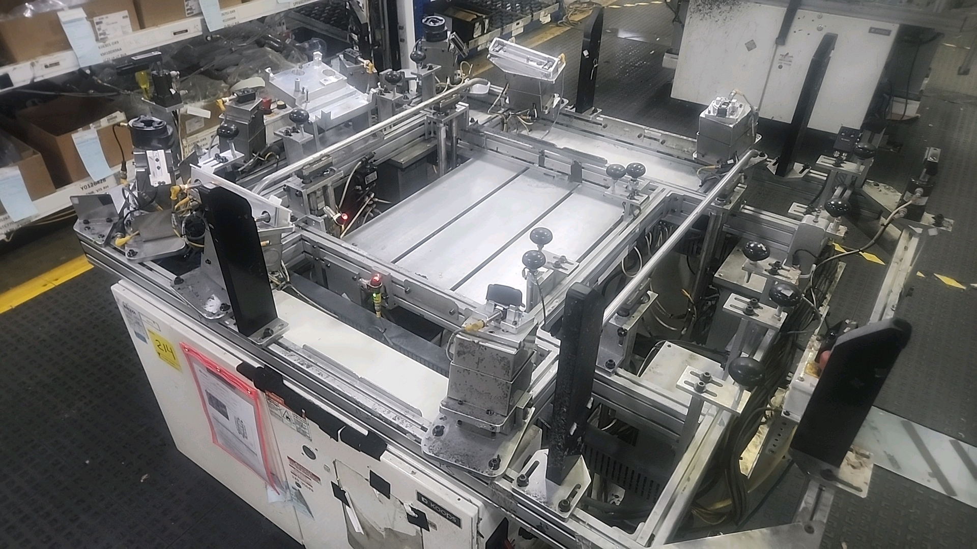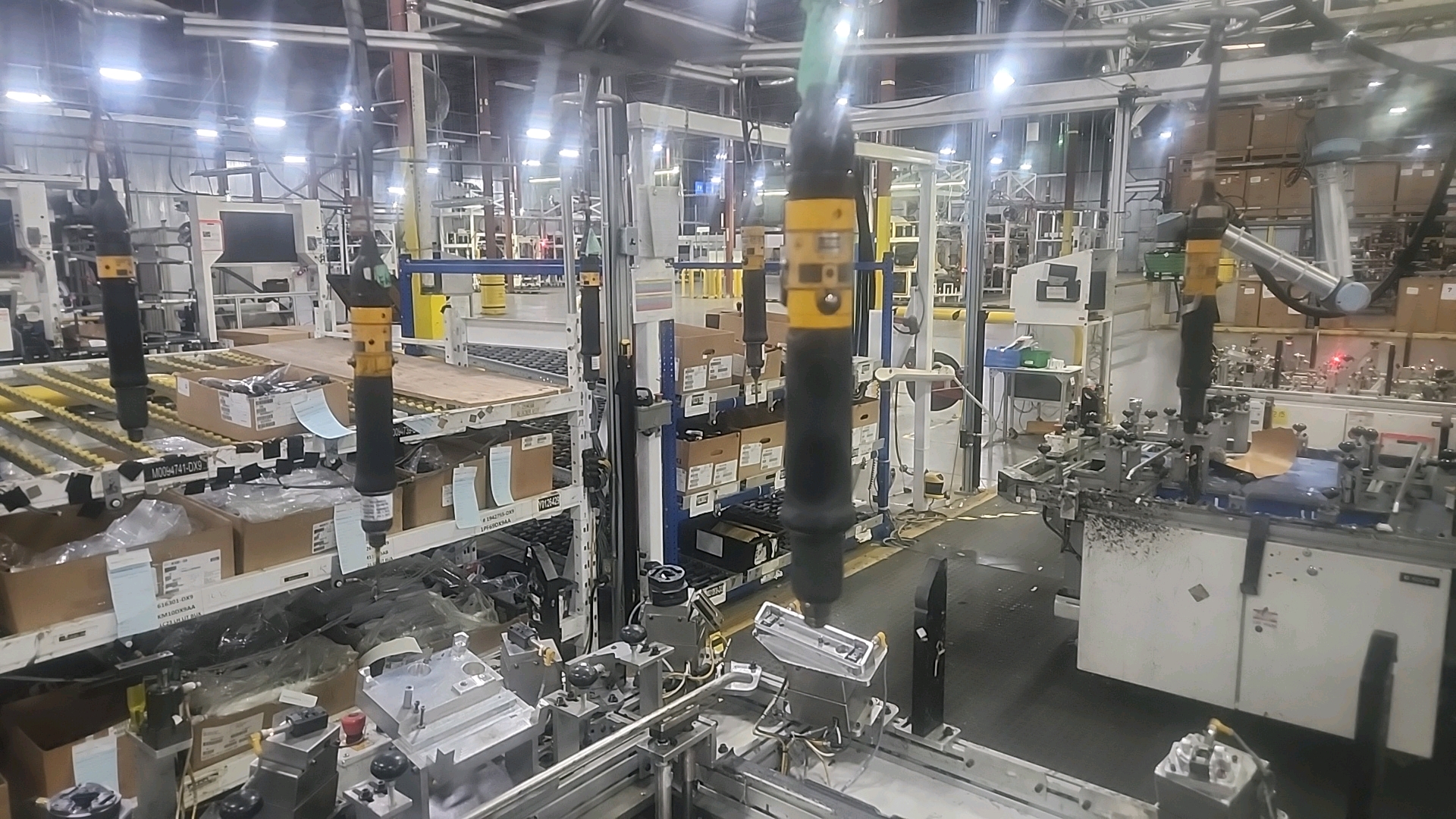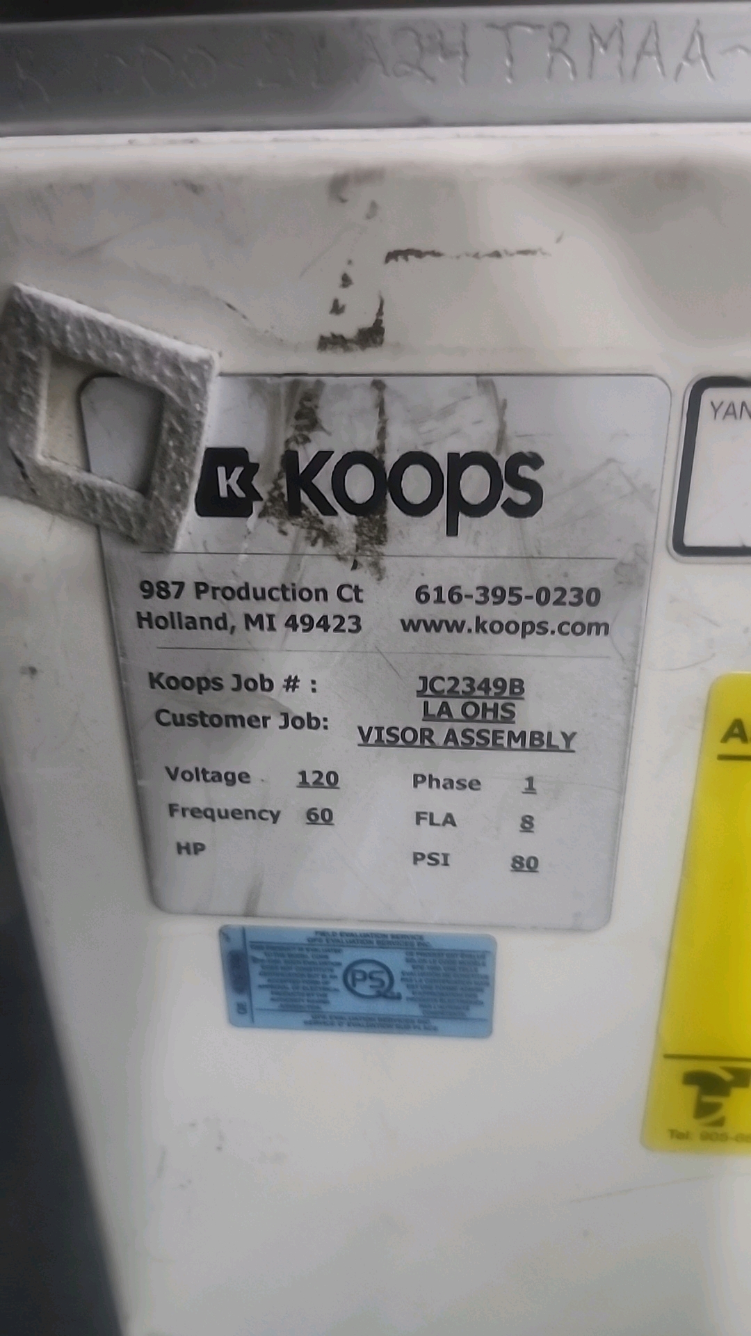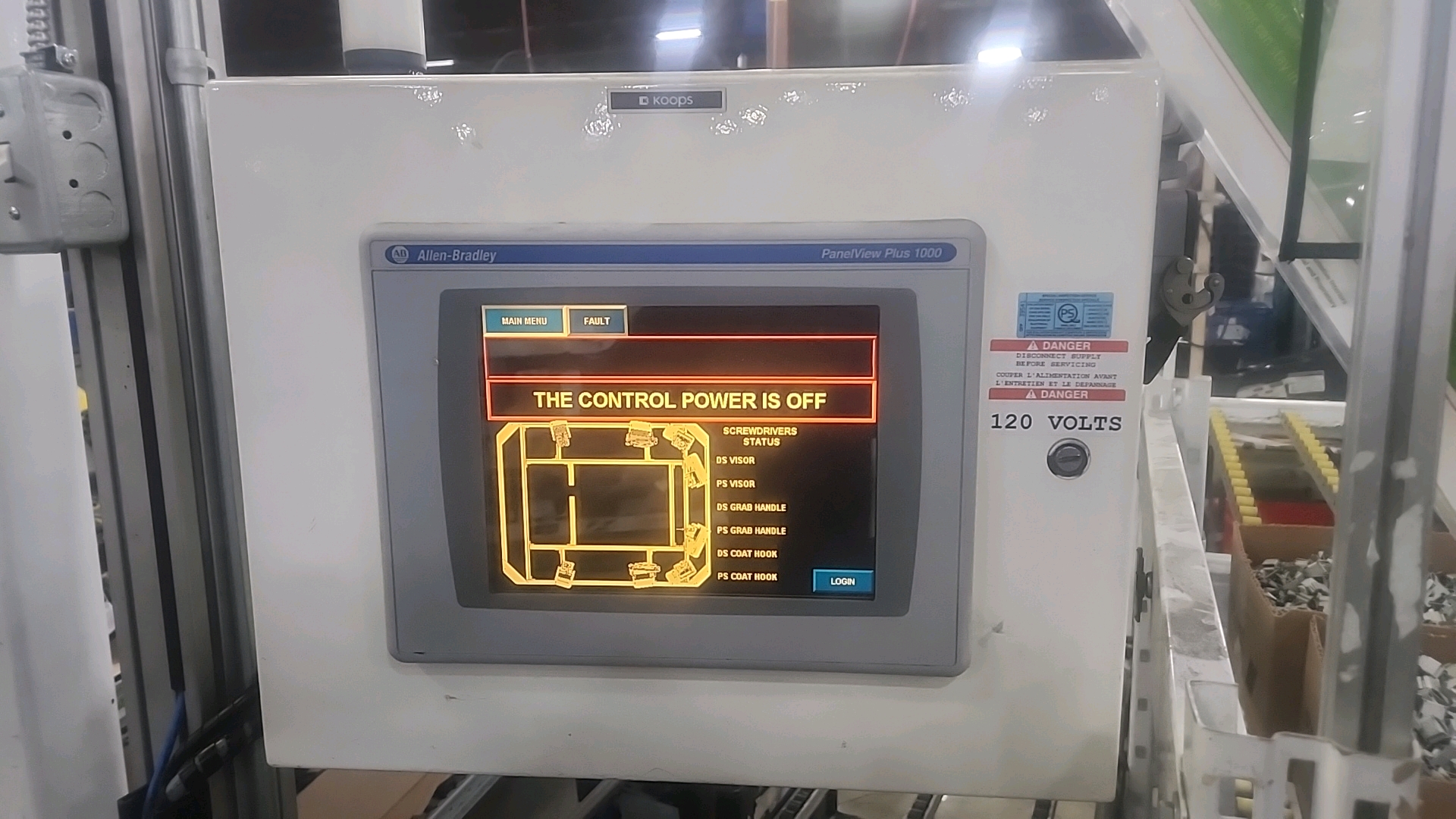 KOOPS visor assembly cell, mod. LA OHS VISOR ASSEMBLY, fixture table, (6) retractable screw guns, (4) Atlas Copco Tensor DL torque tool/nut runners, (2) Atlas Copco PowerFocus SL compact controllers and Allen Bradley PanelView Plus 1000 controller