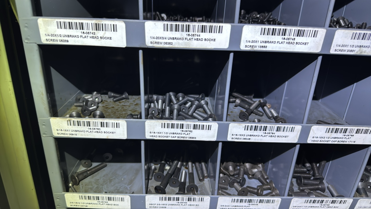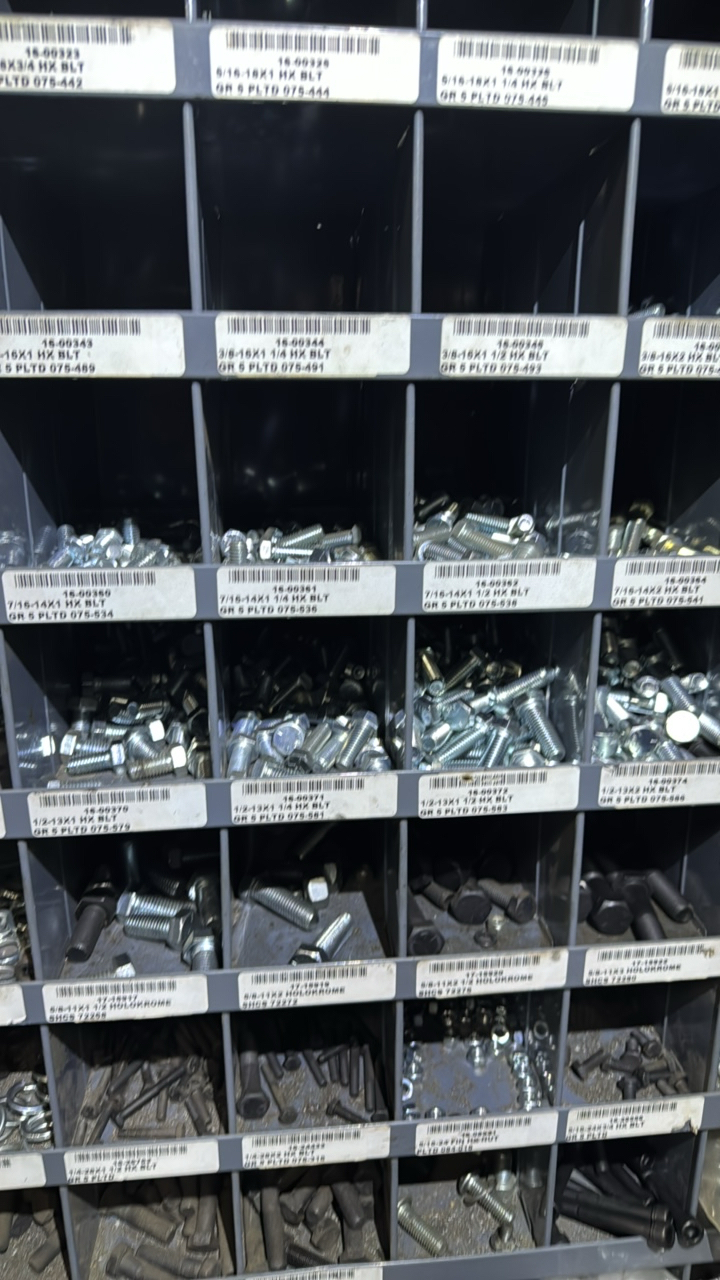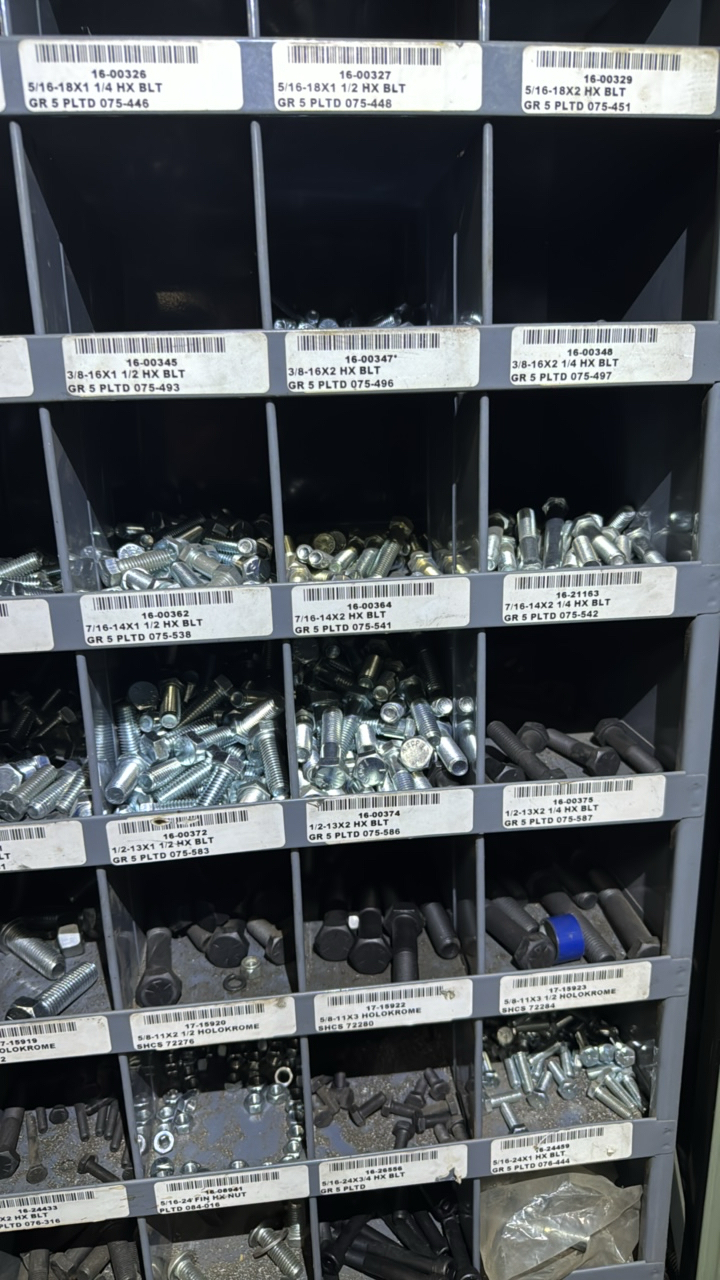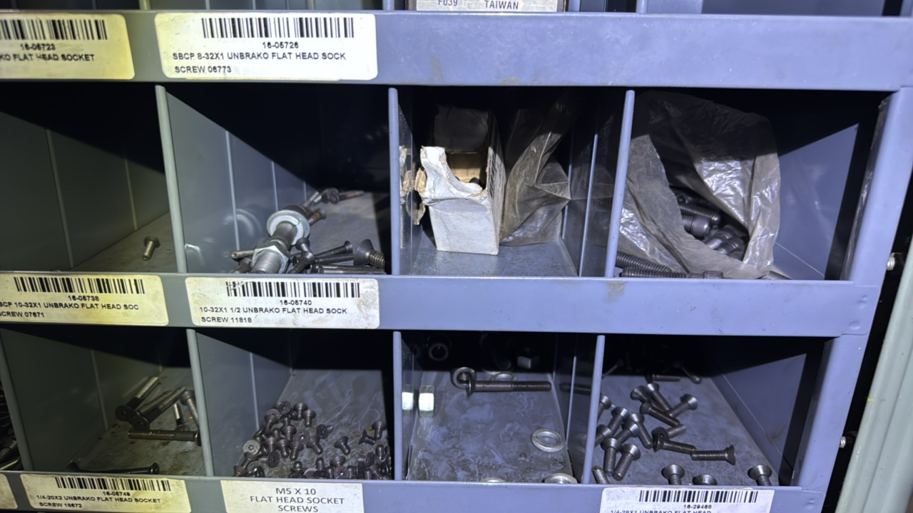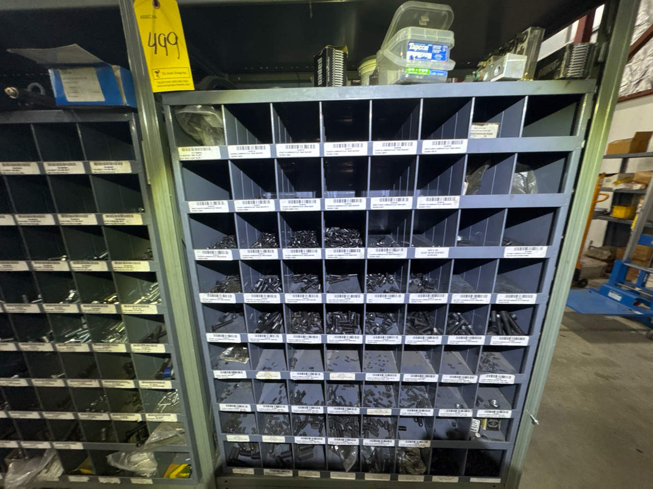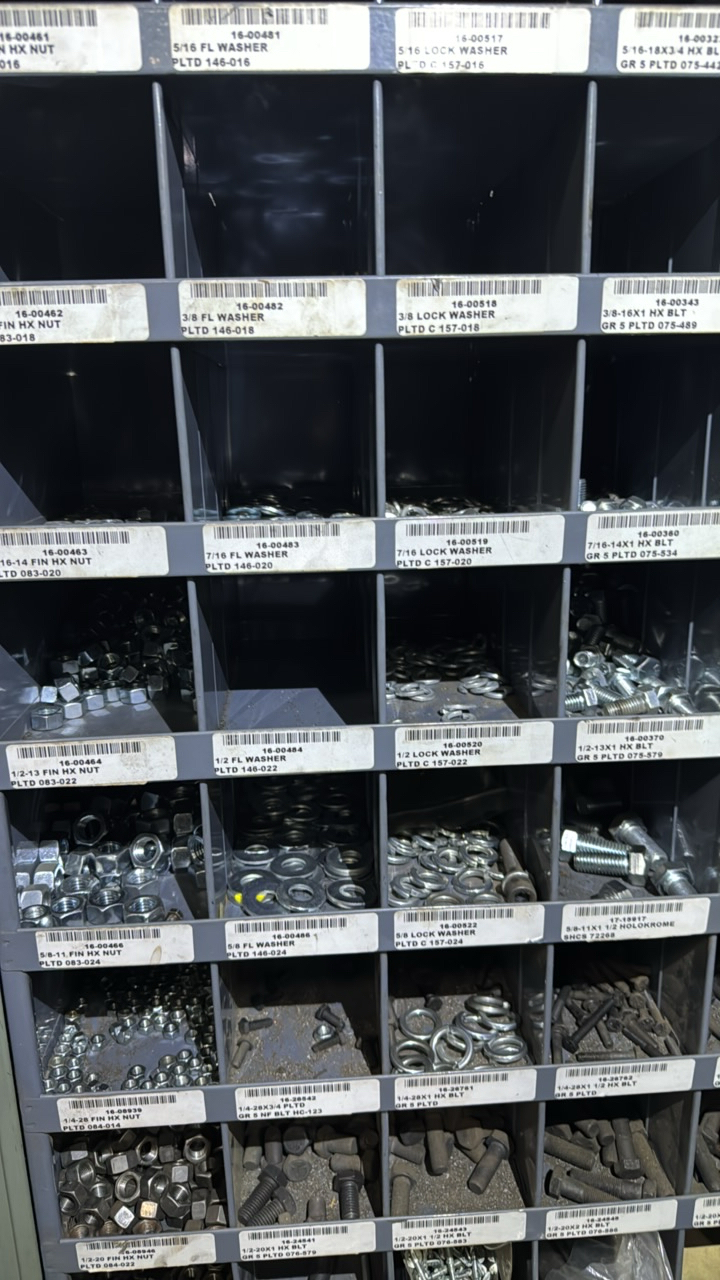 (2) sections metal shelving, parts bins, with hardware contents
