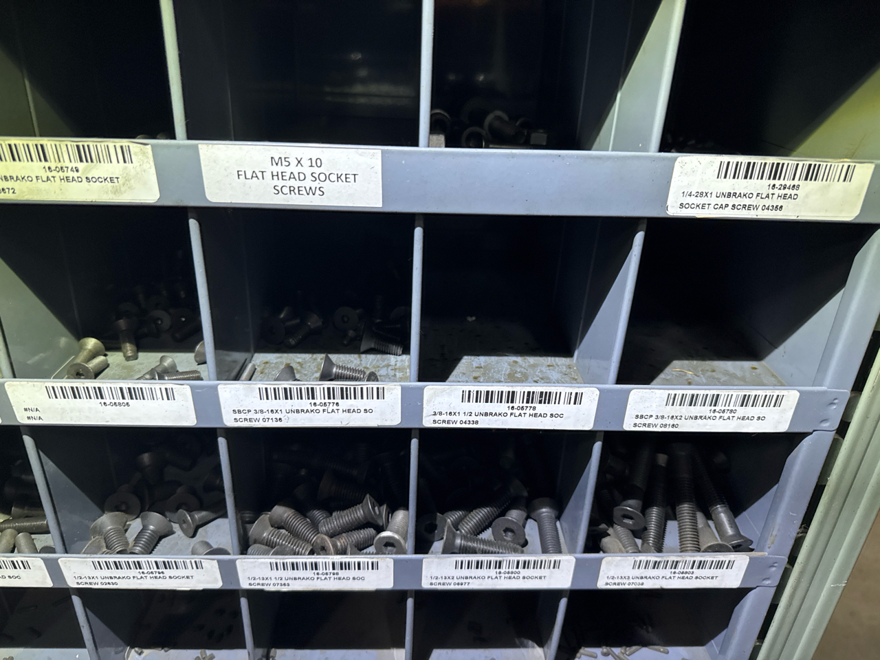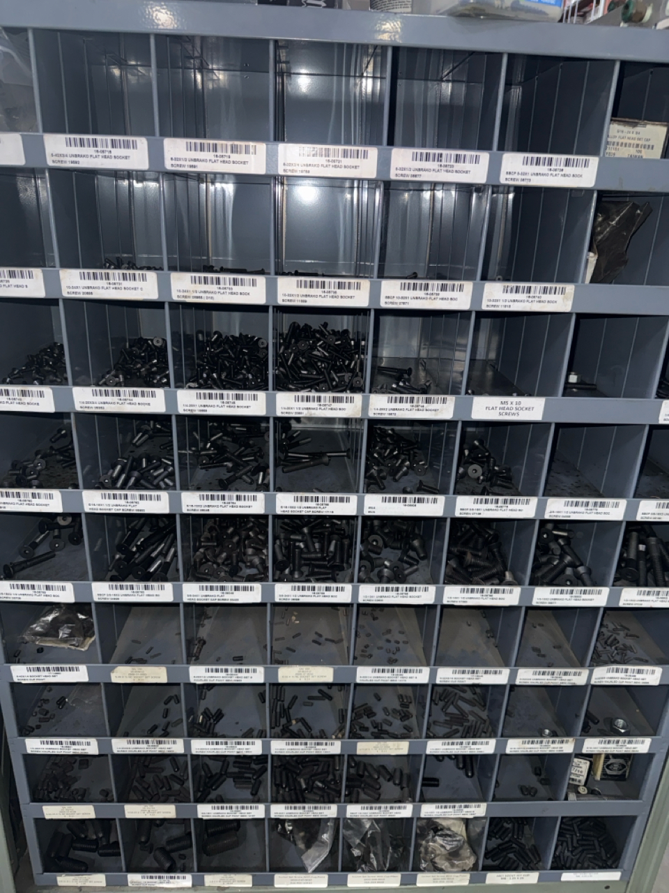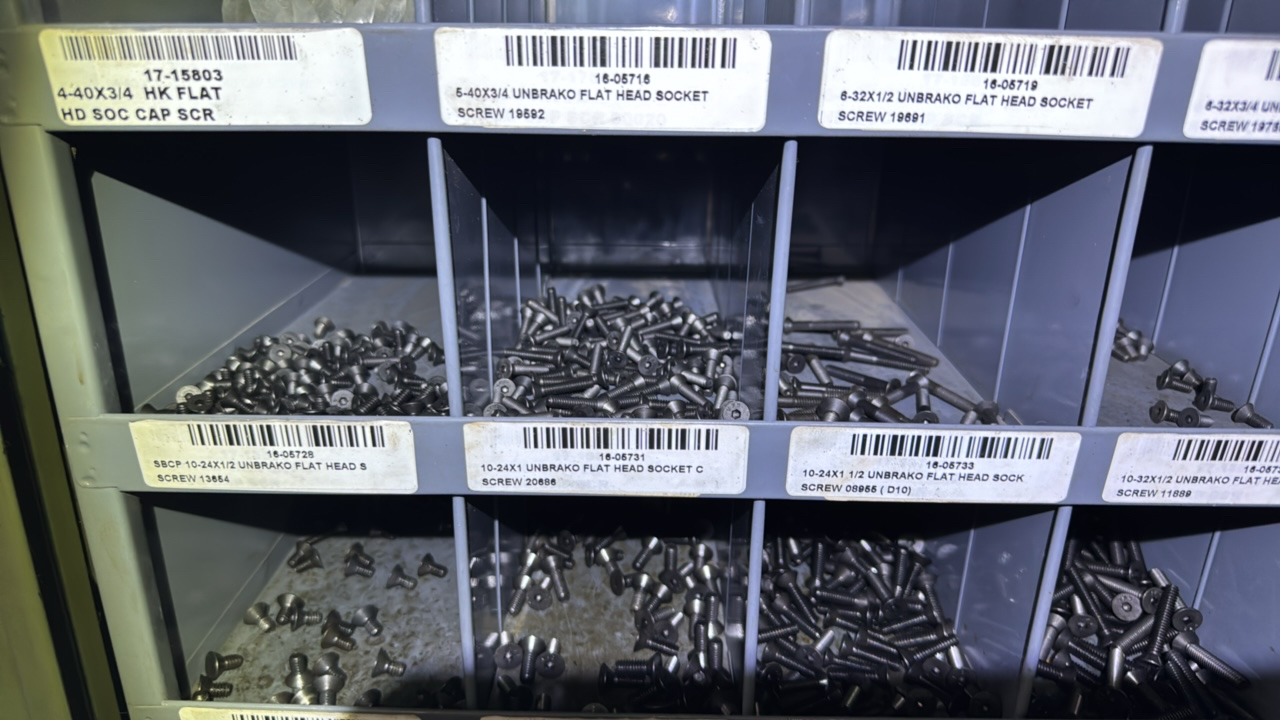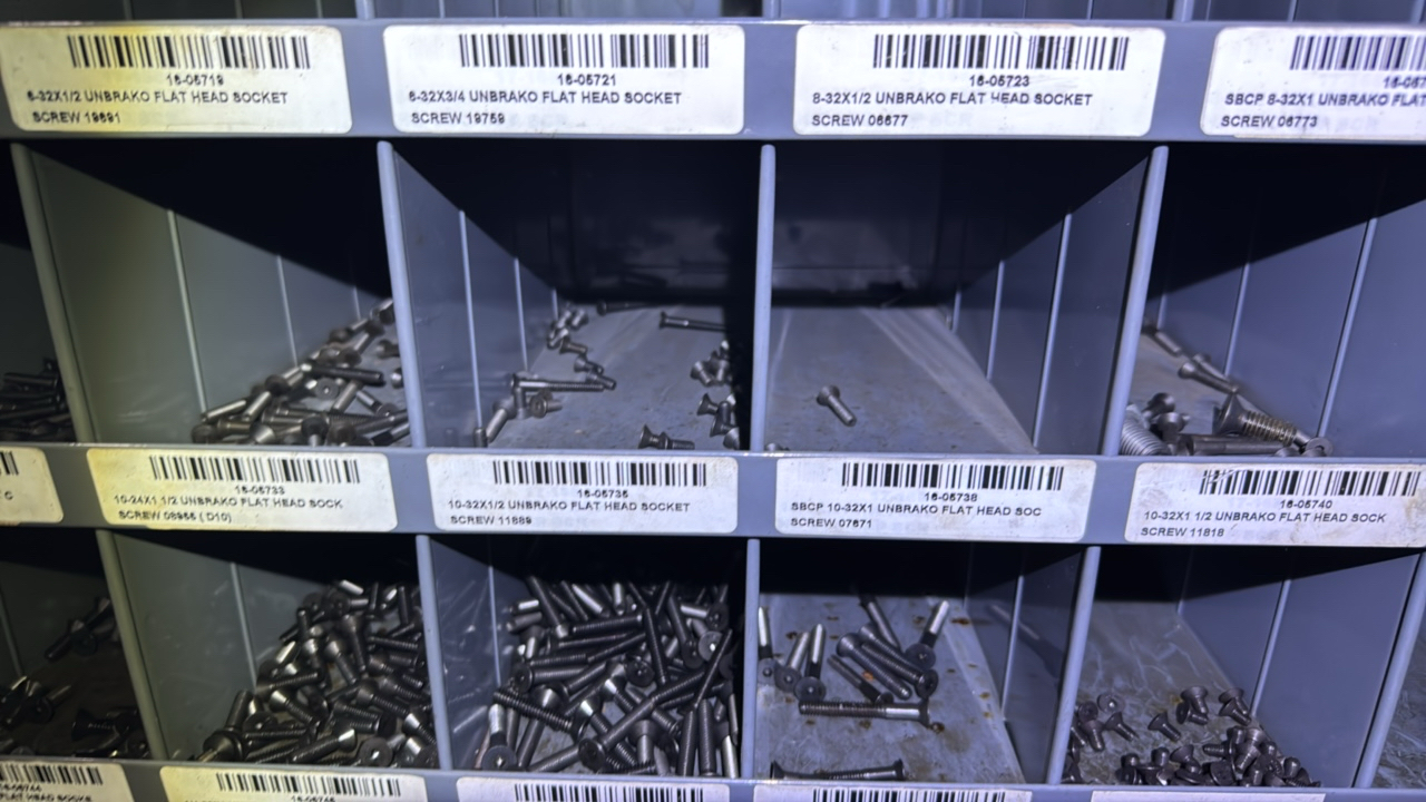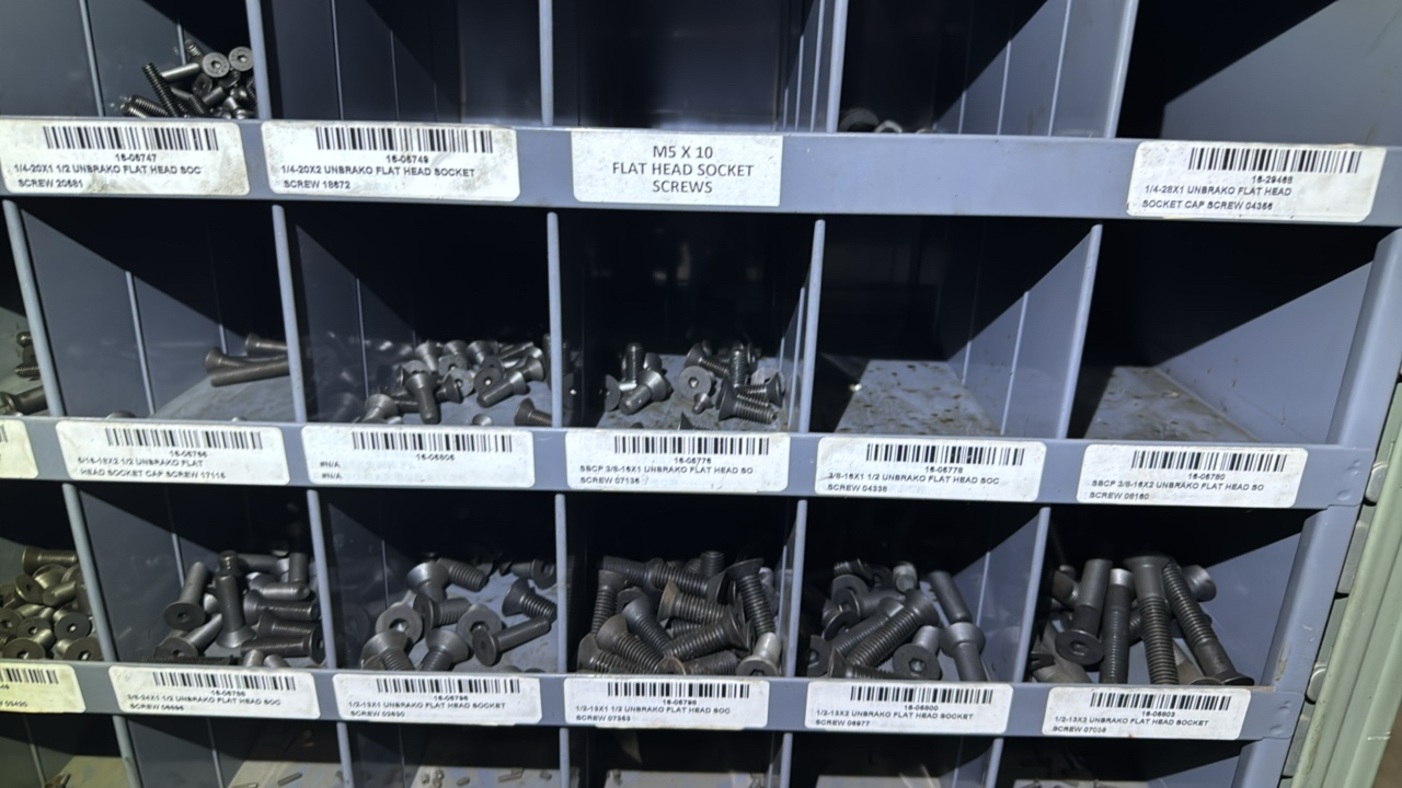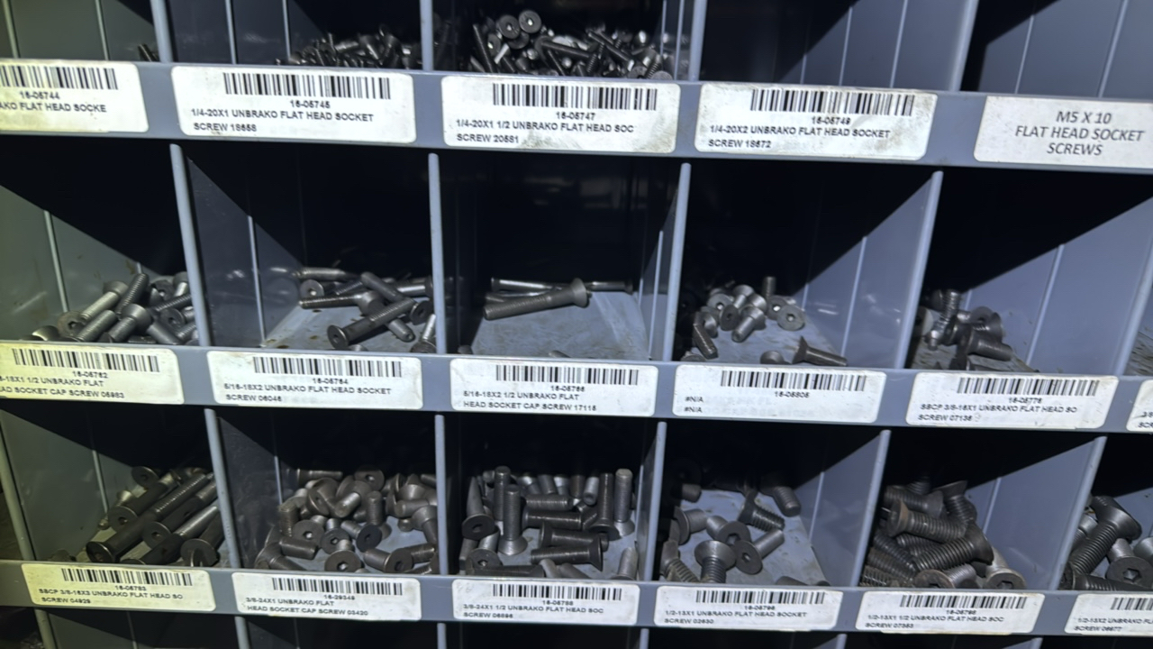 (2) sections metal shelving, parts bins, with hardware contents