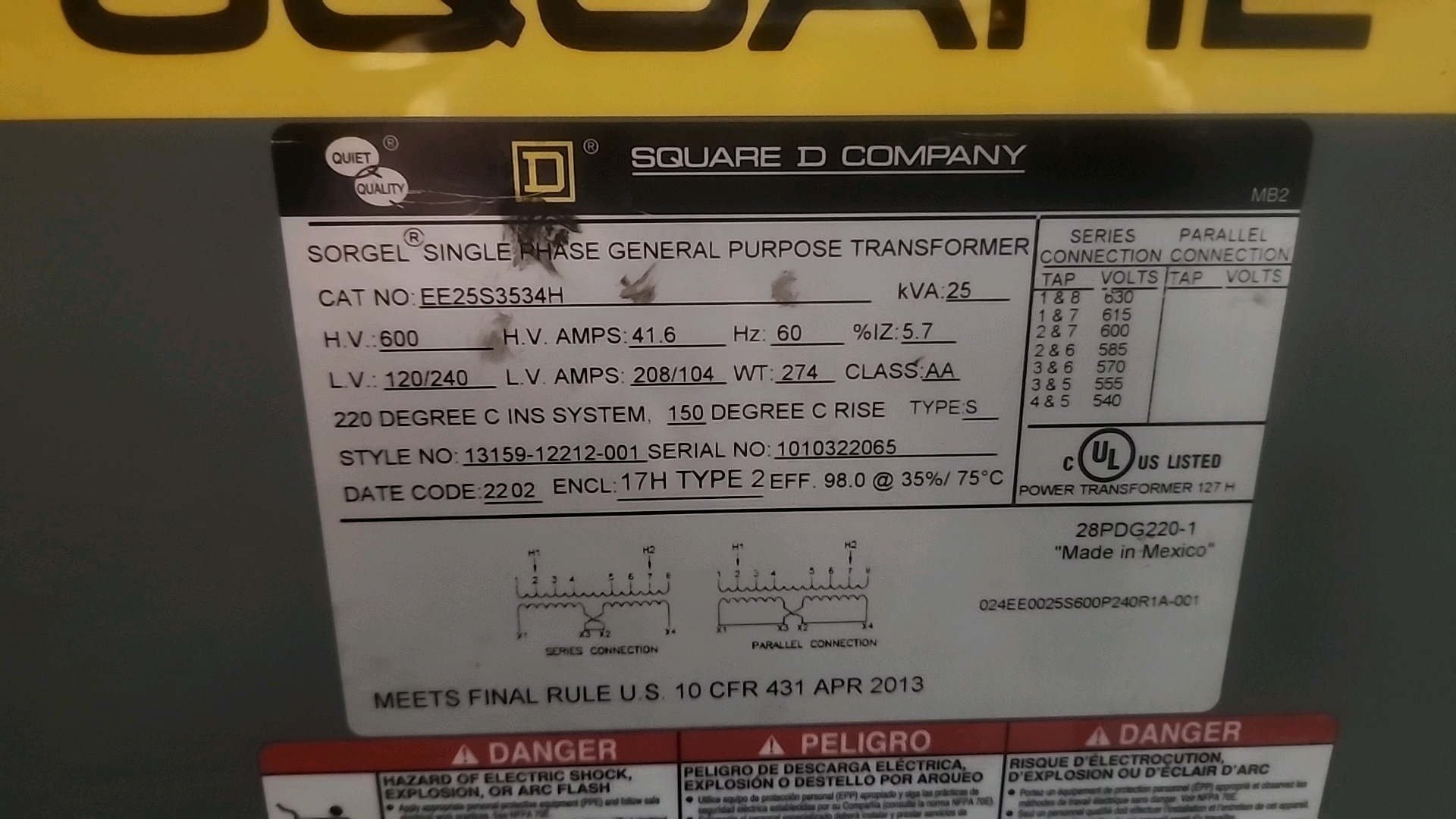 Square D transformer, 25 KVA [Loc. Above Melting/Pouring]