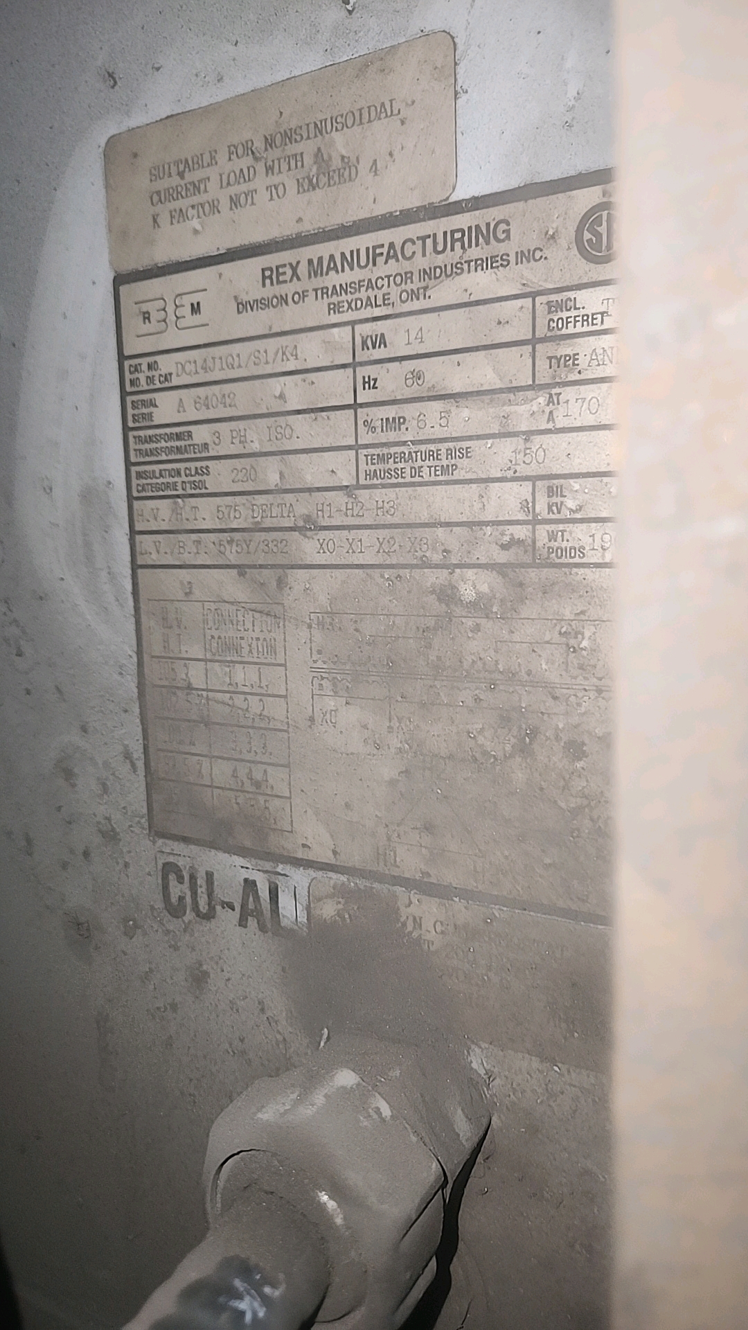Rex transformer, 14 KVA [Loc. Above Melting/Pouring]