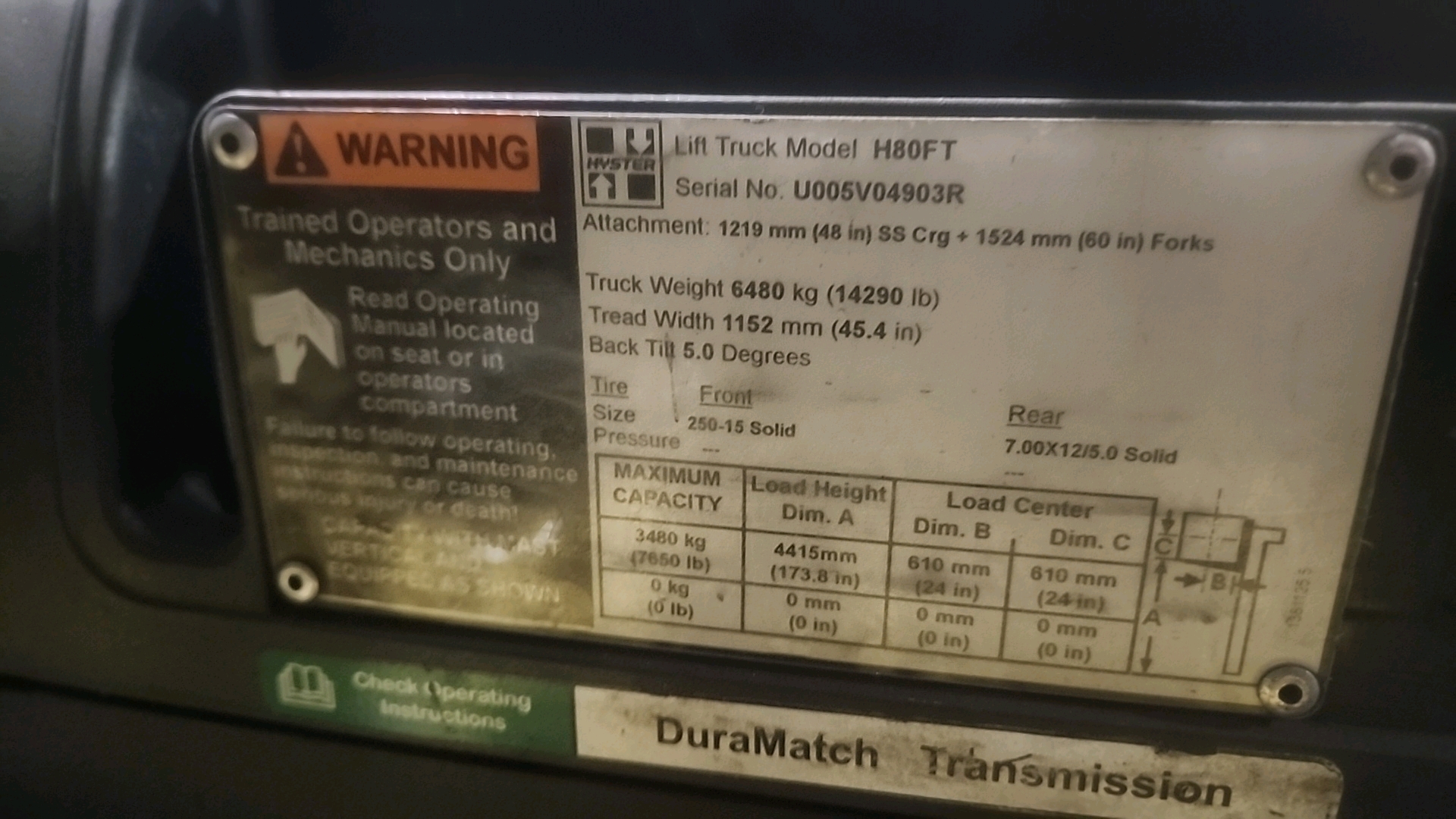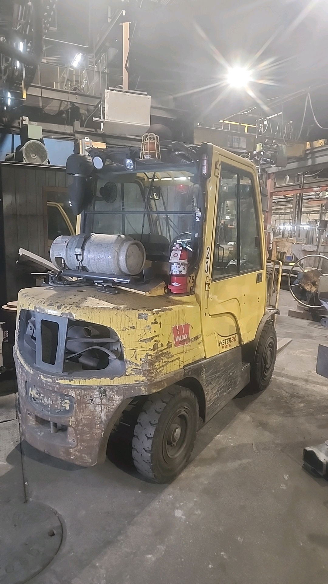 Hyster forklift, mod. Fortis H80, ser. no. U005V04903R (2017), 8000 lb cap., propane, 1173 hrs., 3-stage mast, solid tires w/ heated enclosed cab [Loc. Finishing-Shipping] [Loc. Production]