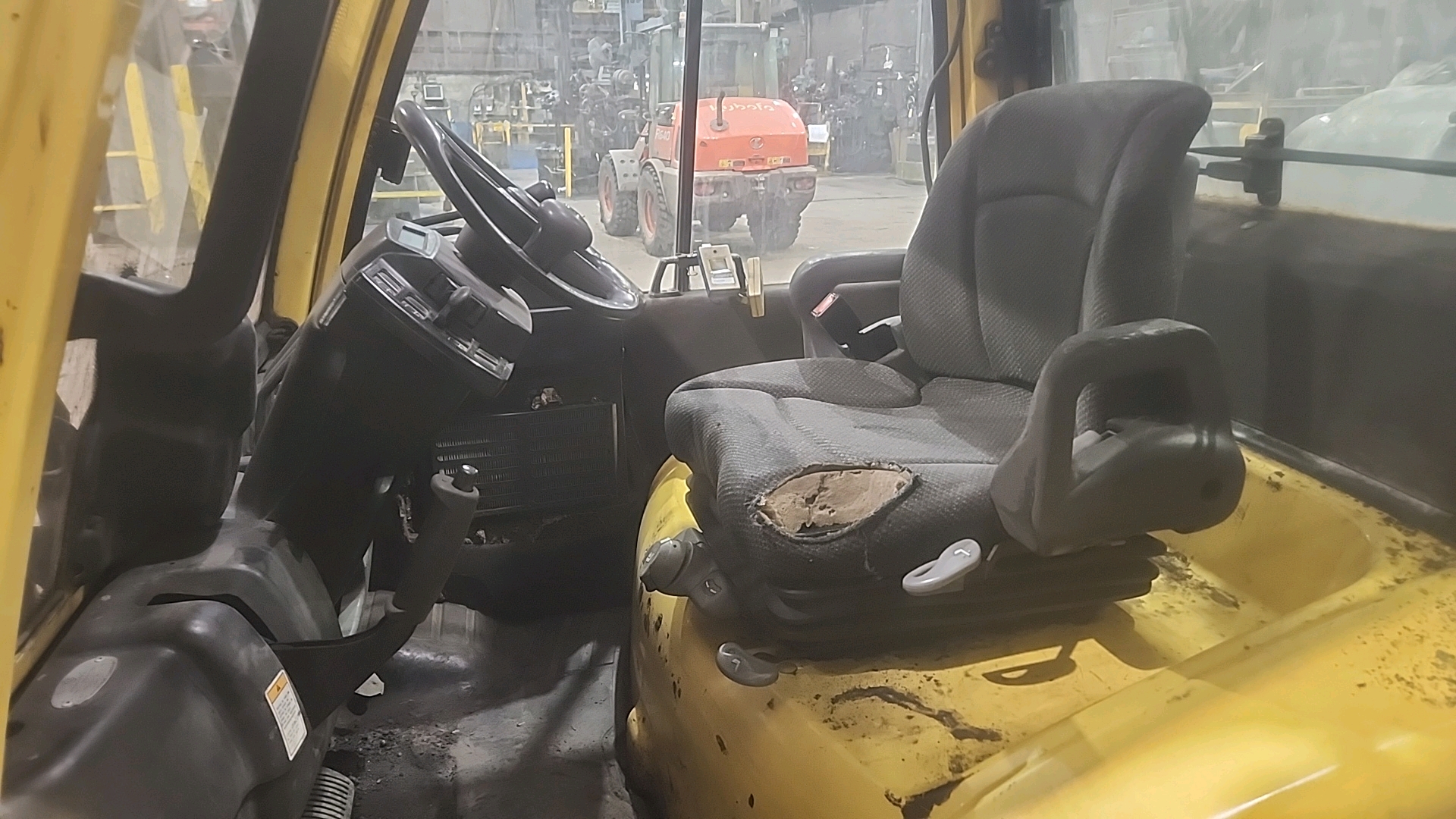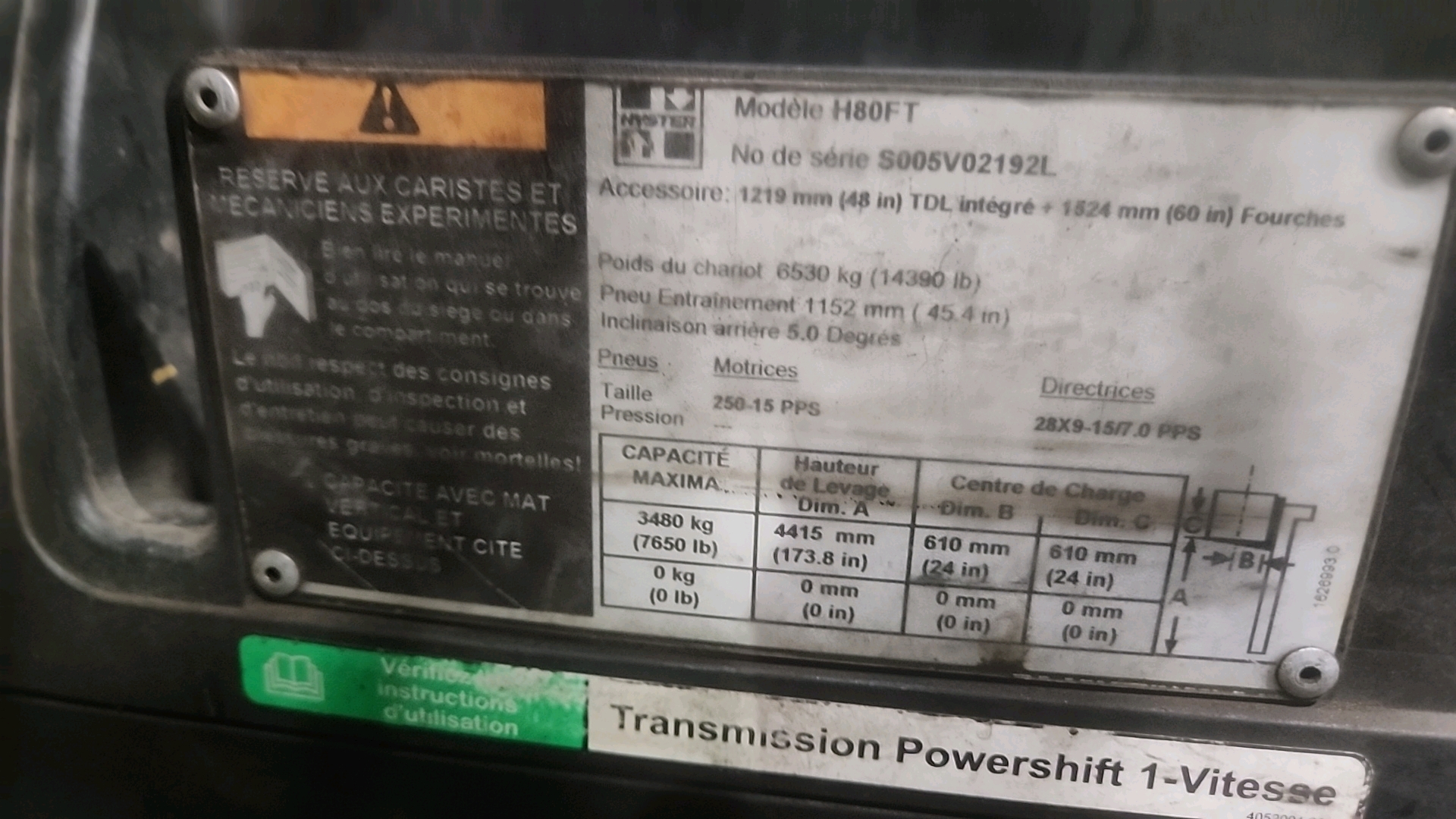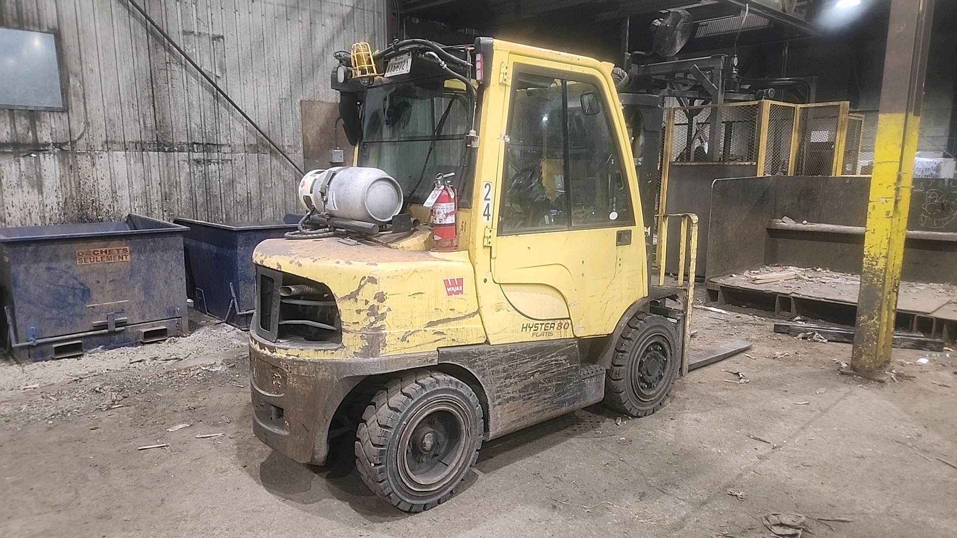 Hyster forklift (no. 24), mod. Fortis H80, ser. no. S005V02192L, 8000 lb cap., propane, 00117 hrs., 3-stage mast, solid tires w/ heated enclosed cab [Loc. Finishing-Shipping] [Loc. Production]