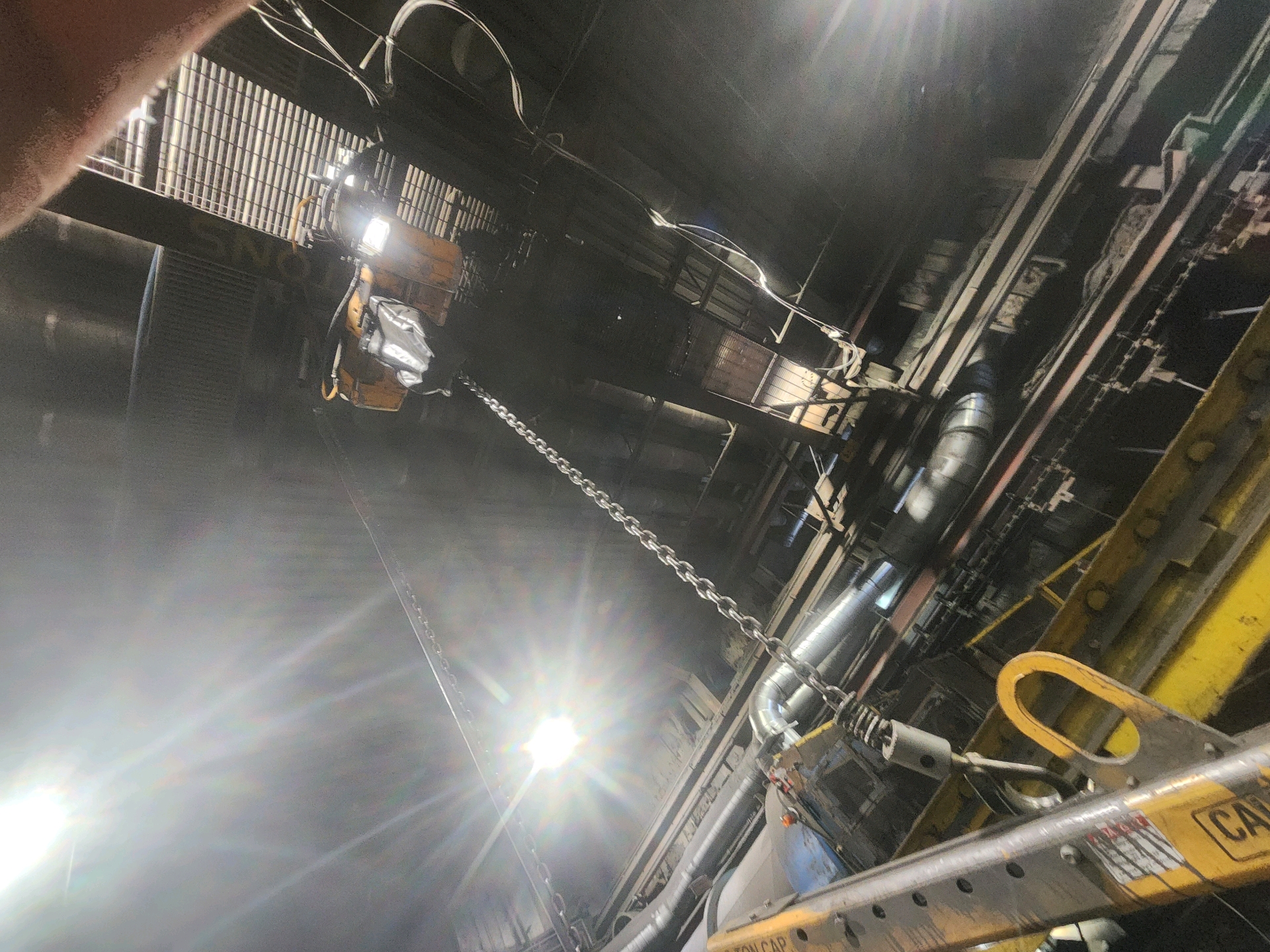 Kito electric chain hoist, 2-ton cap. w/ bridge, 2-MT cap., approx. 32 ft. span, 4-axis travel (no. 5) [Loc. Production]