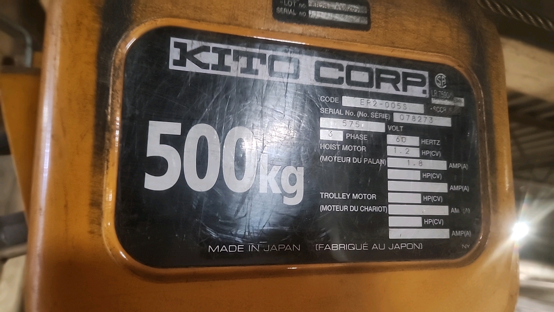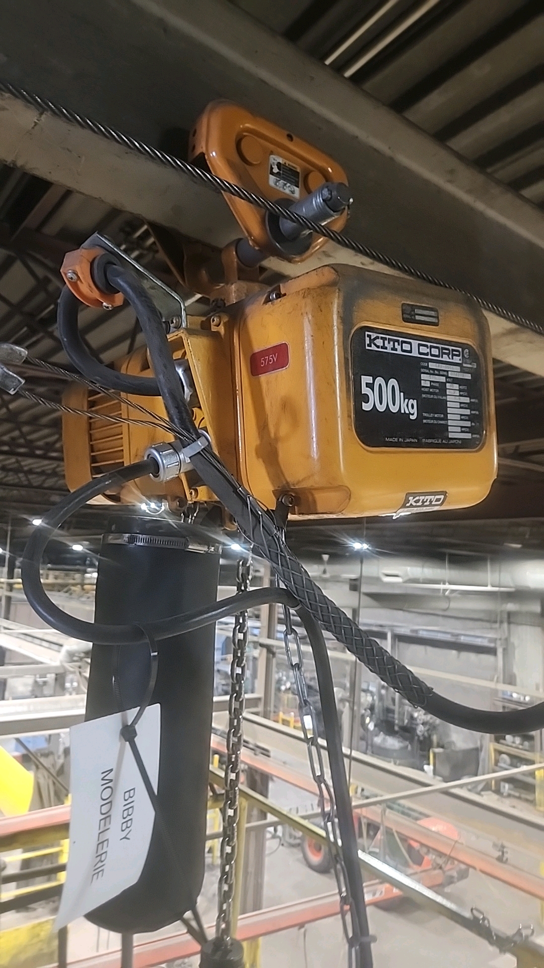 Kito electric chain hoist, mod. ER2-005S, 500 Kg cap. w/ manual trolley [Loc. Production]