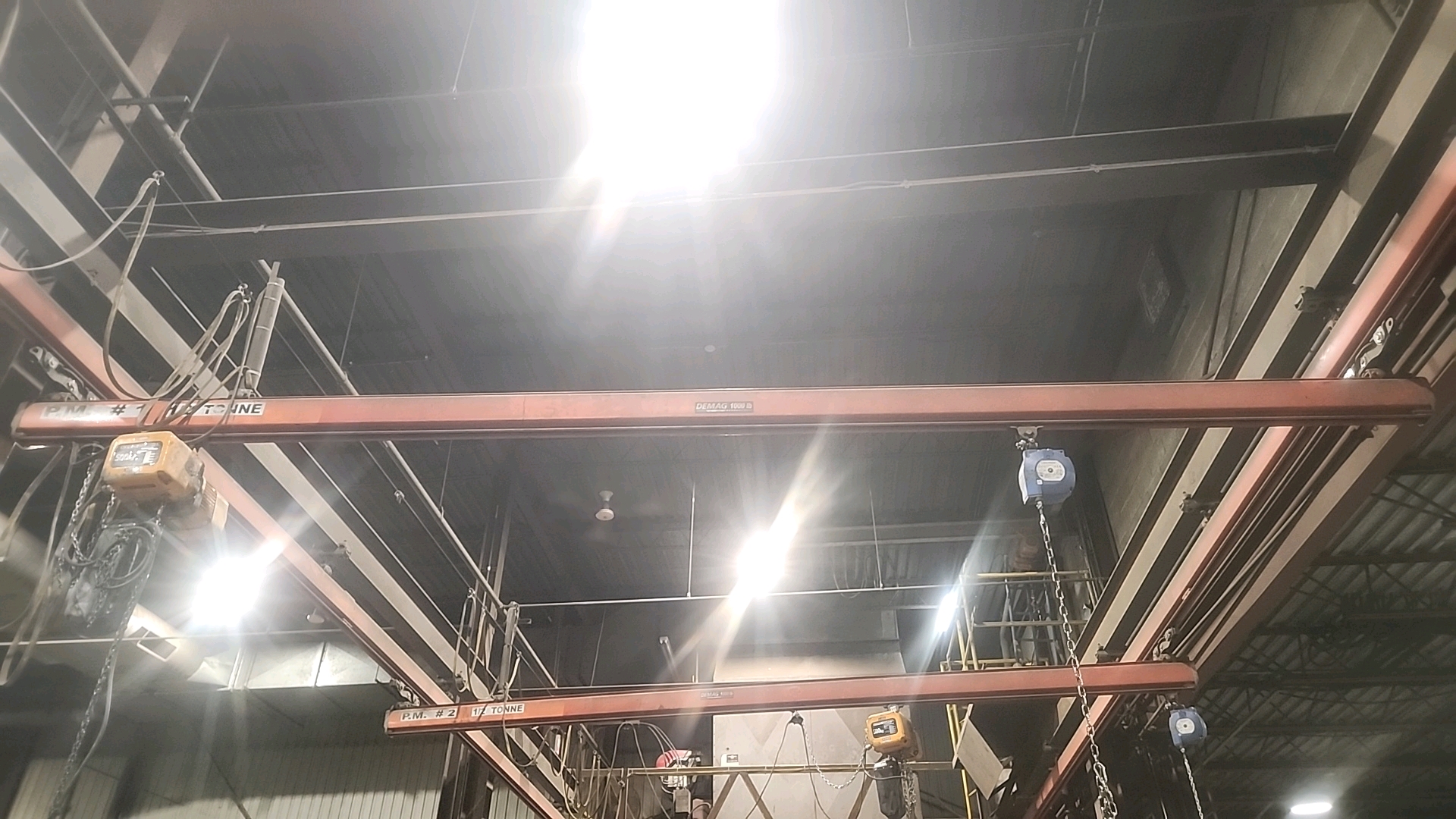Demag hoist trolley rail system, 1000 lbs. cap. w/ (2) approx. 17 ft. cross rails x 43 ft. (excluding hoists and retractable reels) [Loc. Production]