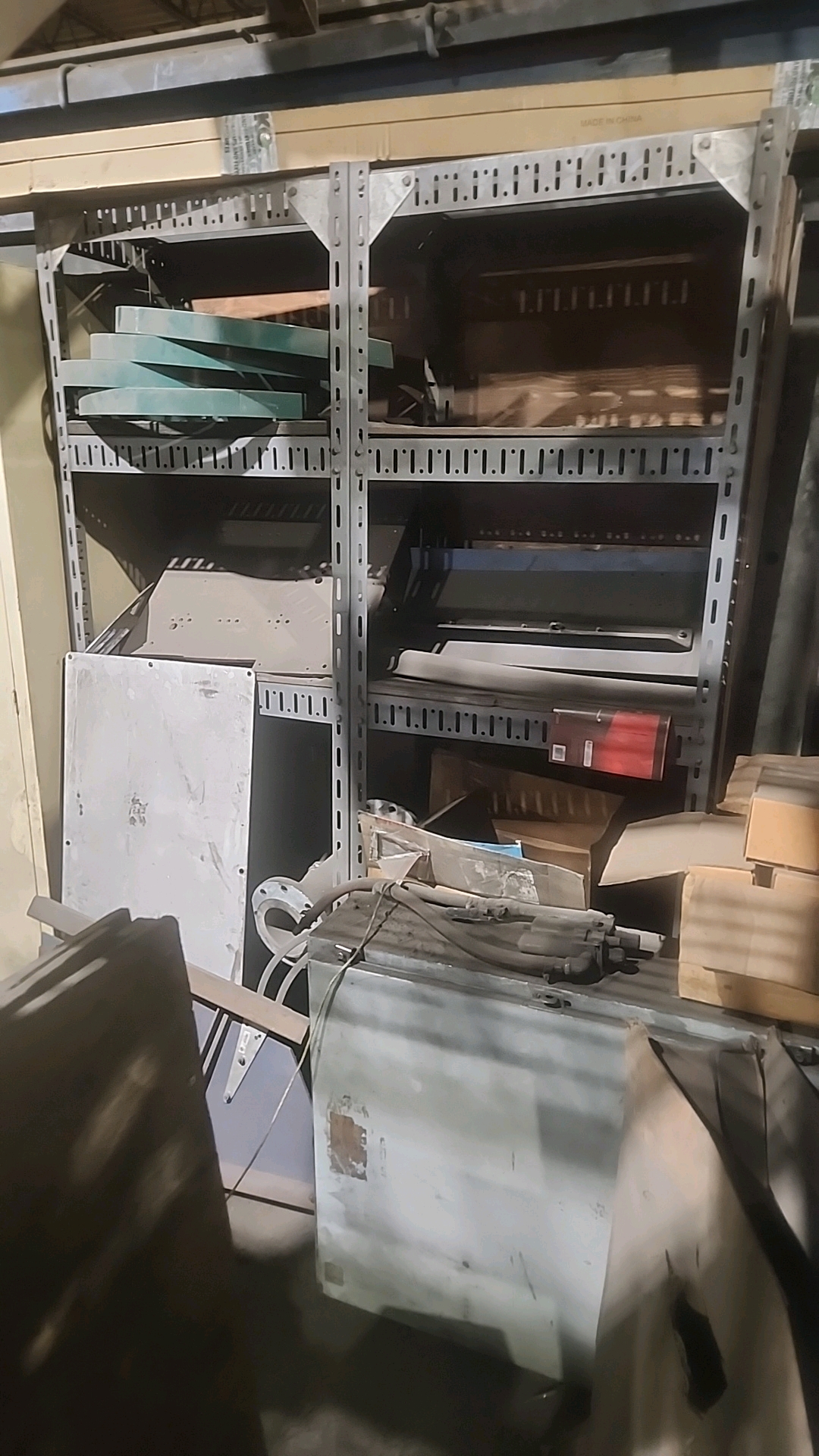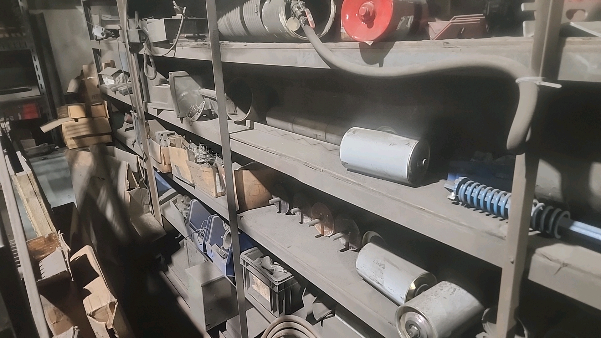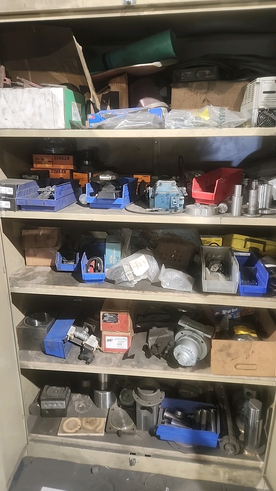 misc. conveyor spare parts, etc. c/w racking and (2) storage cabinets [Loc. Mezzanine]