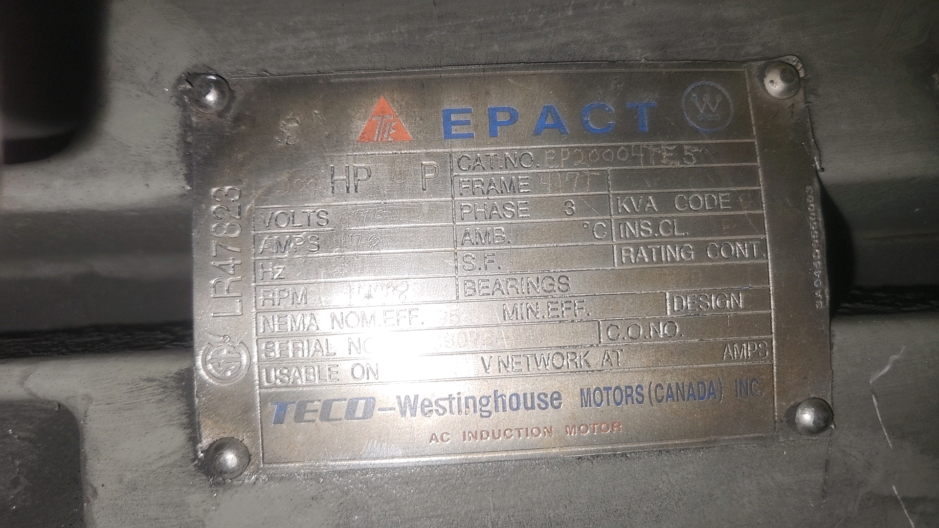 (1) electric motor, 200 hp [Loc. Production]