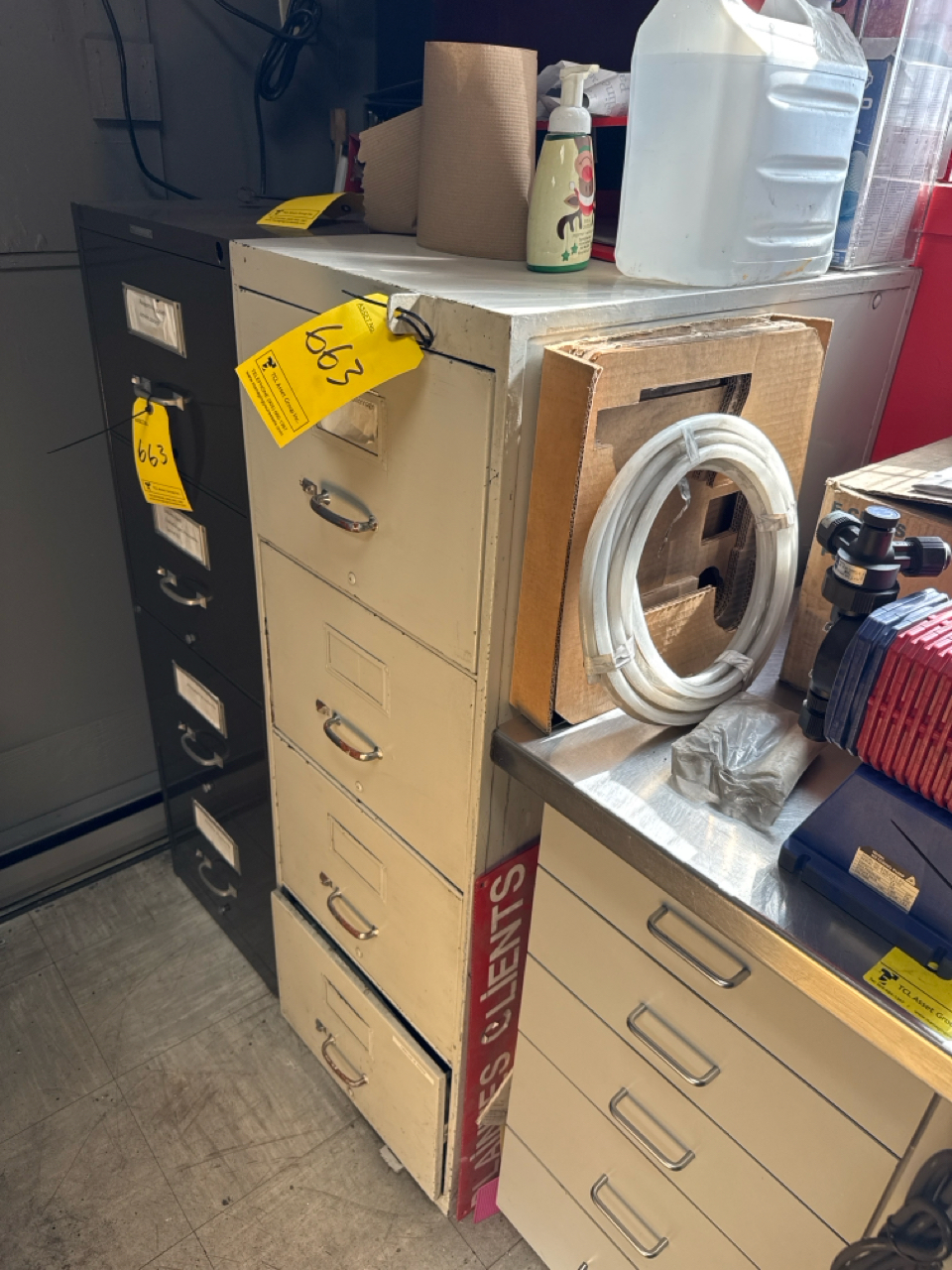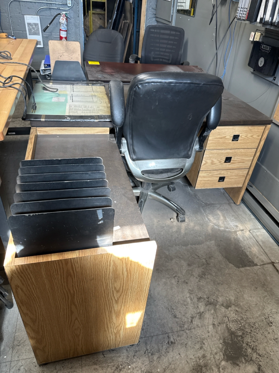 portable office w/ contents, furniture, 3 rolling chairs, (1) desk, (1) L-shape desk approx. 6 ft x 66 inch, 3 filling cabinet (furnishing only: contents, IT equipment, computers, and printers are not included) [Loc. Production]