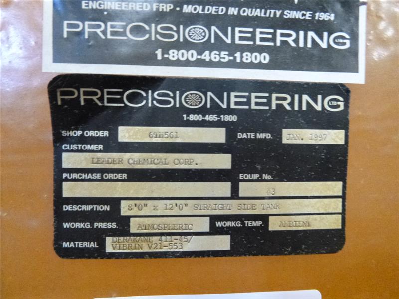 Precisioneering fiberglass, (EFRP), soap storage tanks, 20,000 kg. batch, (est.5,283 USG), 8 ft. diam. X 12 ft. straight side, dome top, flat bottom