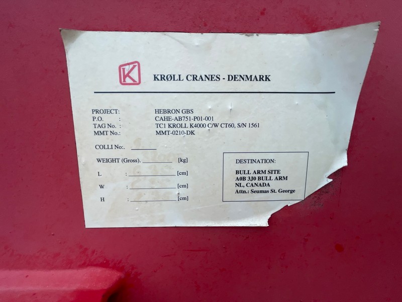 2013 Kroll K4000 Tower Crane, 85 Meter Jib, 110 MT Lifting Capacity Asset Details: Hoisting • 30mm Hoist Cable • 8 Parts configuration, 110MT capacity • 4 Parts configuration, 55MT capacity • 2 Parts configuration, 27.5MT capacity Jib • Max Radius: 85 Meters • Overall Jib Length: 86.5 Meters • Lifting Capacity at the tip will vary based on mast height - see load charts attached • Trolley has 18mm cable for trolley positioning in a 2 part configuration Counter Jib • Length: 32 Meters • Will hold up to 14-10 Ton counter weights and all hoisting gear Mast • Kroll M60 • (16) regular M60 mast sections and (1) M60 tie in section Climber • 1-CT-60 climber - for top climbing the tower crane Base • (1) static base for tower crane Controls • Heated and air conditioned cab • Joystick controls Electrical Equipment • Cabinet positioned in the slewing • 600V - 480V Transformer on counter jib • Slip ring for power cables positioned in the slewing