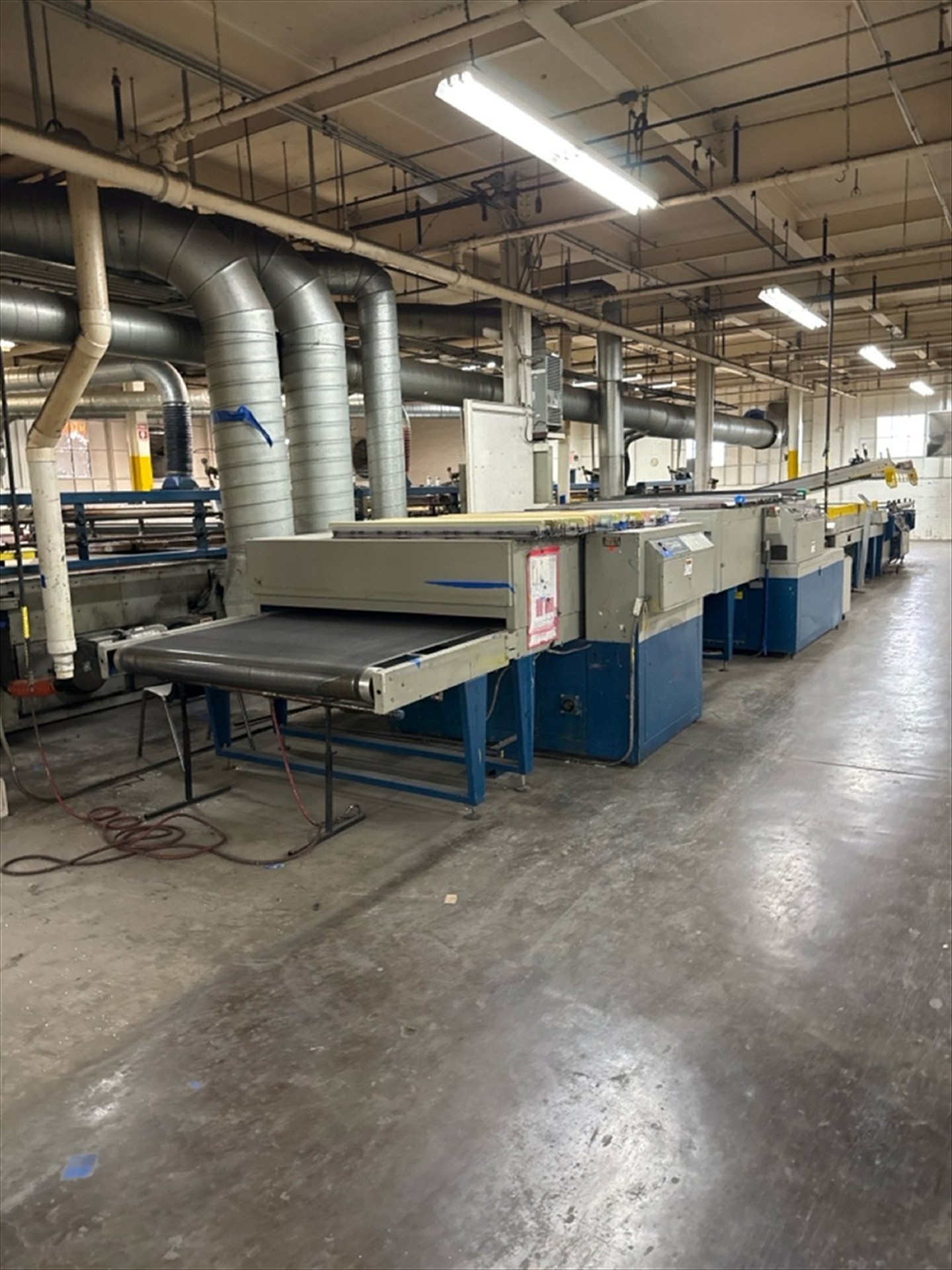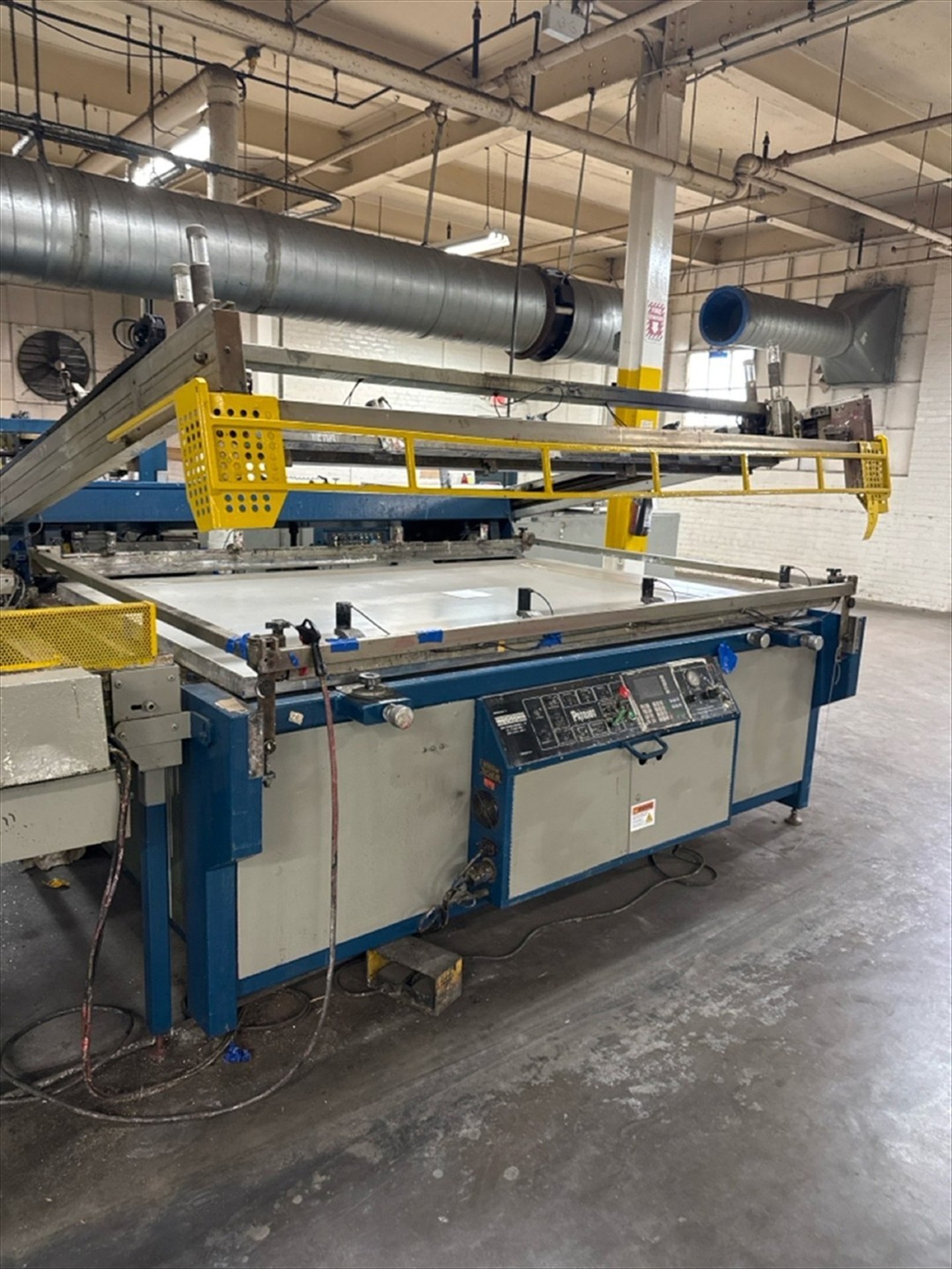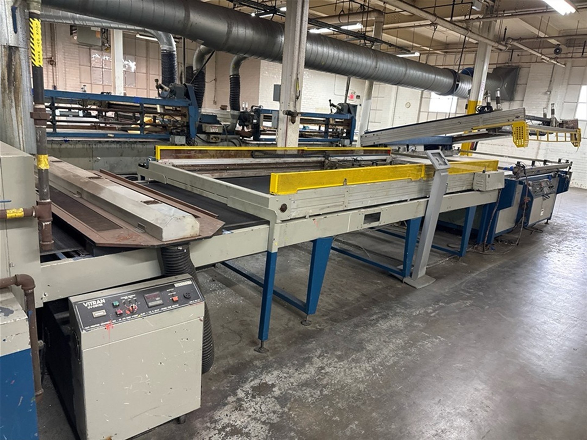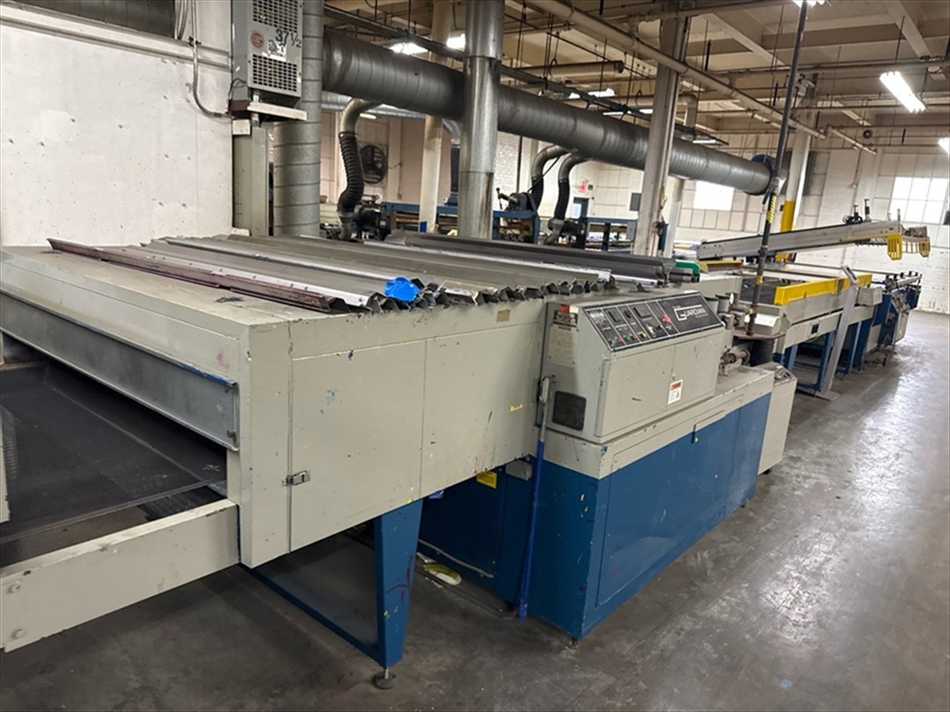 M and R Mod. Patriot 52x84-To Screen Printer, 52 in. X 84 in. Print Area, W/ 15 ft. Mesh Conveyor, MTA-G1 Control, Vitran UV Dryer W/ (2) Guardian GUG60-08-ACD Natural Gas Dryers S/N 069627735G Model S/N 069627736G, MTA-G1 Control, Approximately 60 in. W X 40 ft. L Mesh Conveyor, Ser. No. 069627731P (1996) [Loc. Greenwich, Flr. 3]