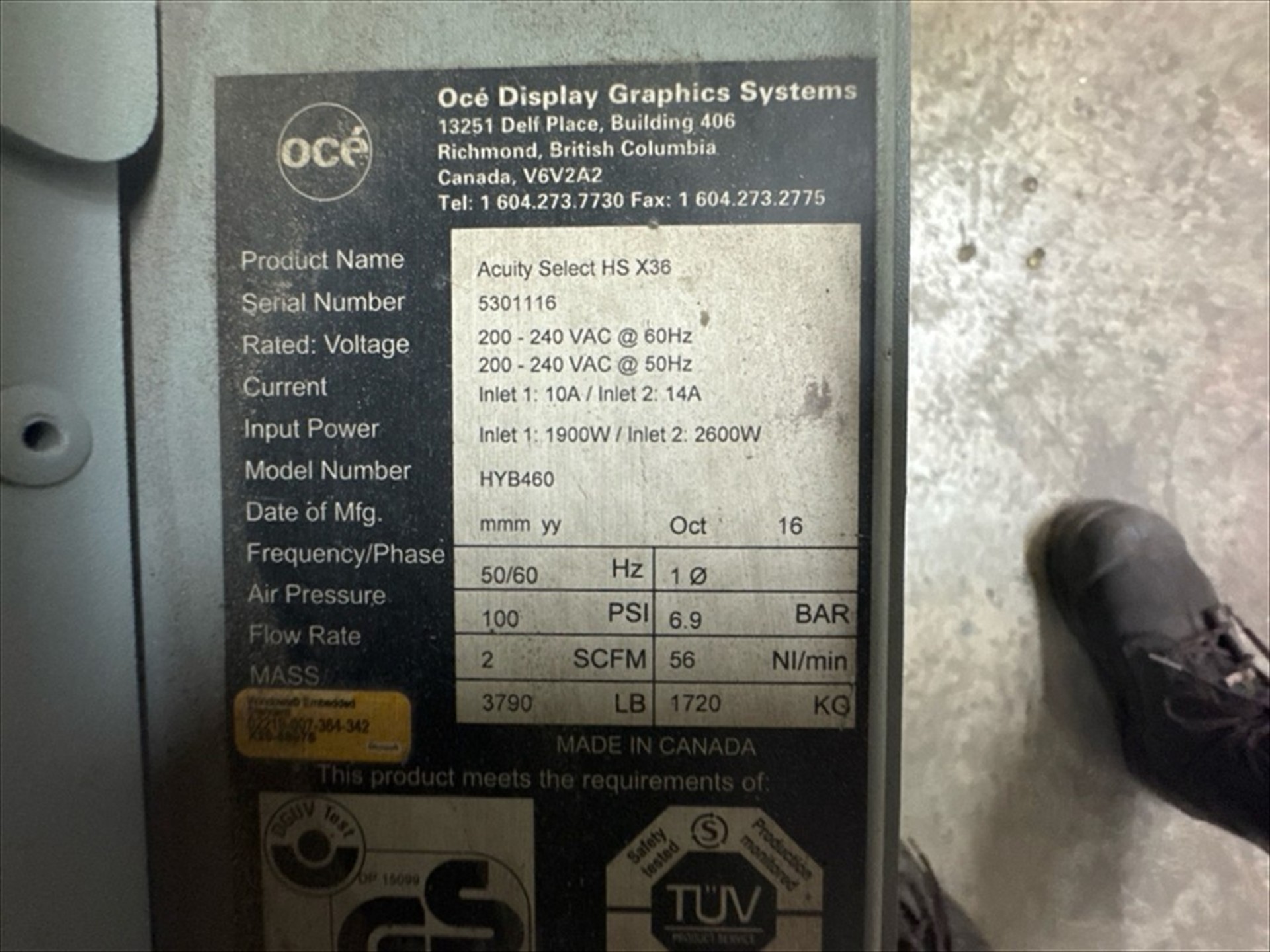 OCE Mod. Acuity Select HS X36 HYB460 Digital Printer, Inkjet, Flatbed, 121.7 X 98.8 in. Bed, 5-Color, Ser. No. 5301116 (2016) [Loc. Greenwich, Flr. 3]